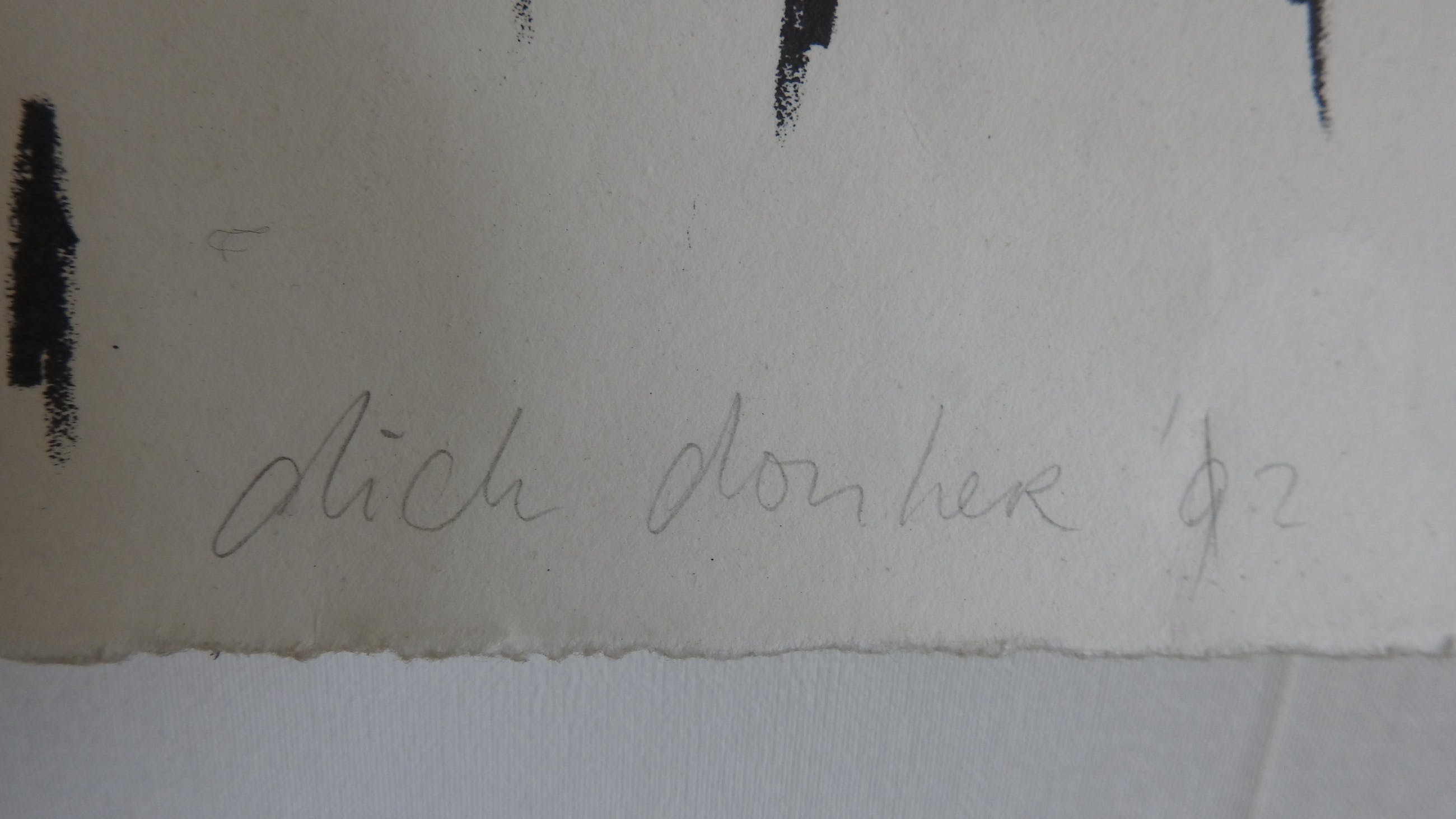 Beeldend Kunstenaar en Meesterdrukker Dick Donker kreeg een opleiding aan de academies van Antwerpen en Utrecht. Hij doceerde Grafiek aan de academies van Utrecht en Maastricht en was nauw betrokken bij het Grafisch Atelier Utrecht. In 2002 richtte hij de Meesterdrukkerij te Zeist op: een professionele drukwerkplaats waar in opdracht of in samenwerking met kunstenaars grafische kunstproducties worden gerealiseerd. De schetsmatige tekeningen in groot formaat van Donker tonen landschappen ontstaan vanuit en vertekend beeld door het geheugen.