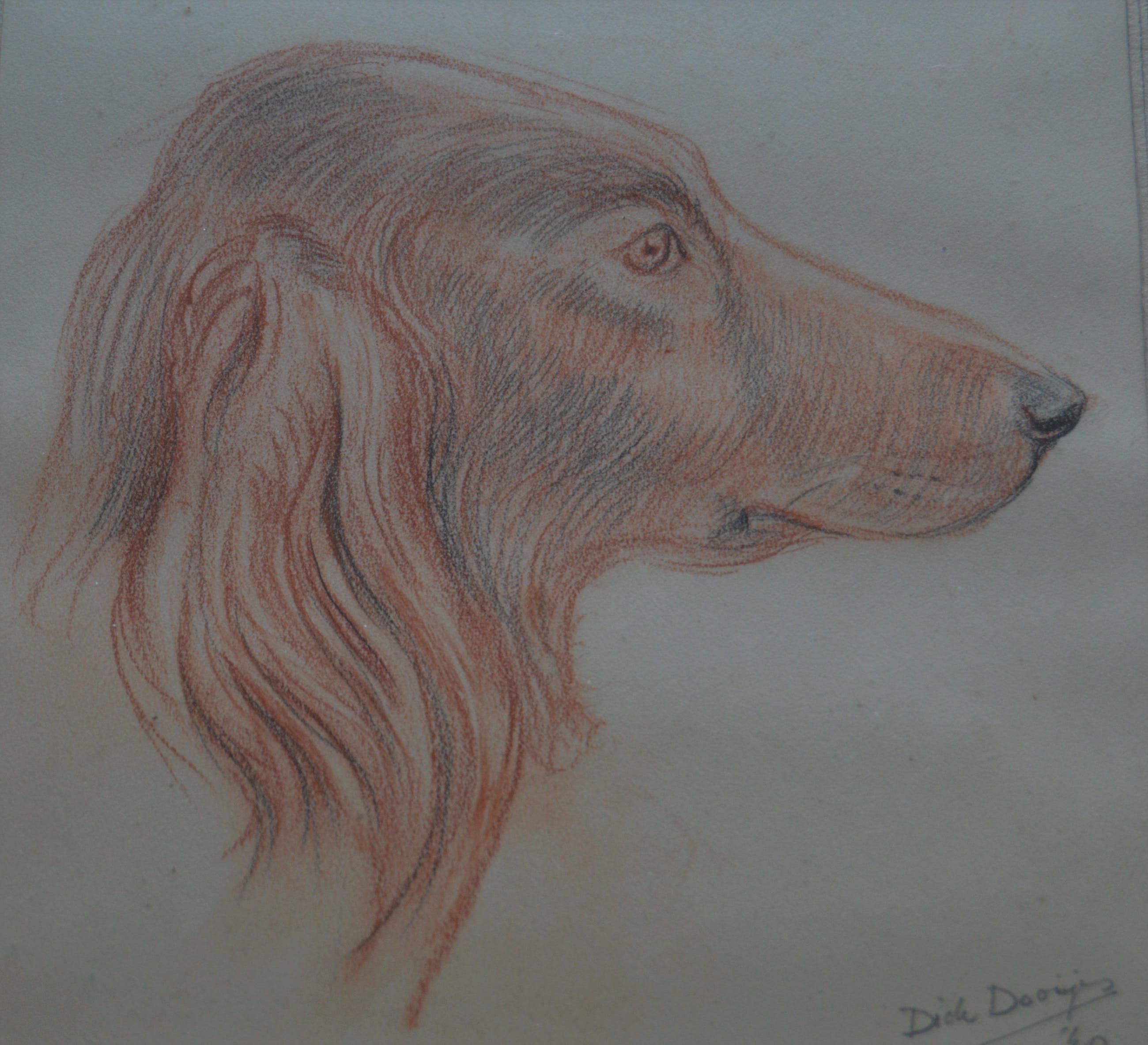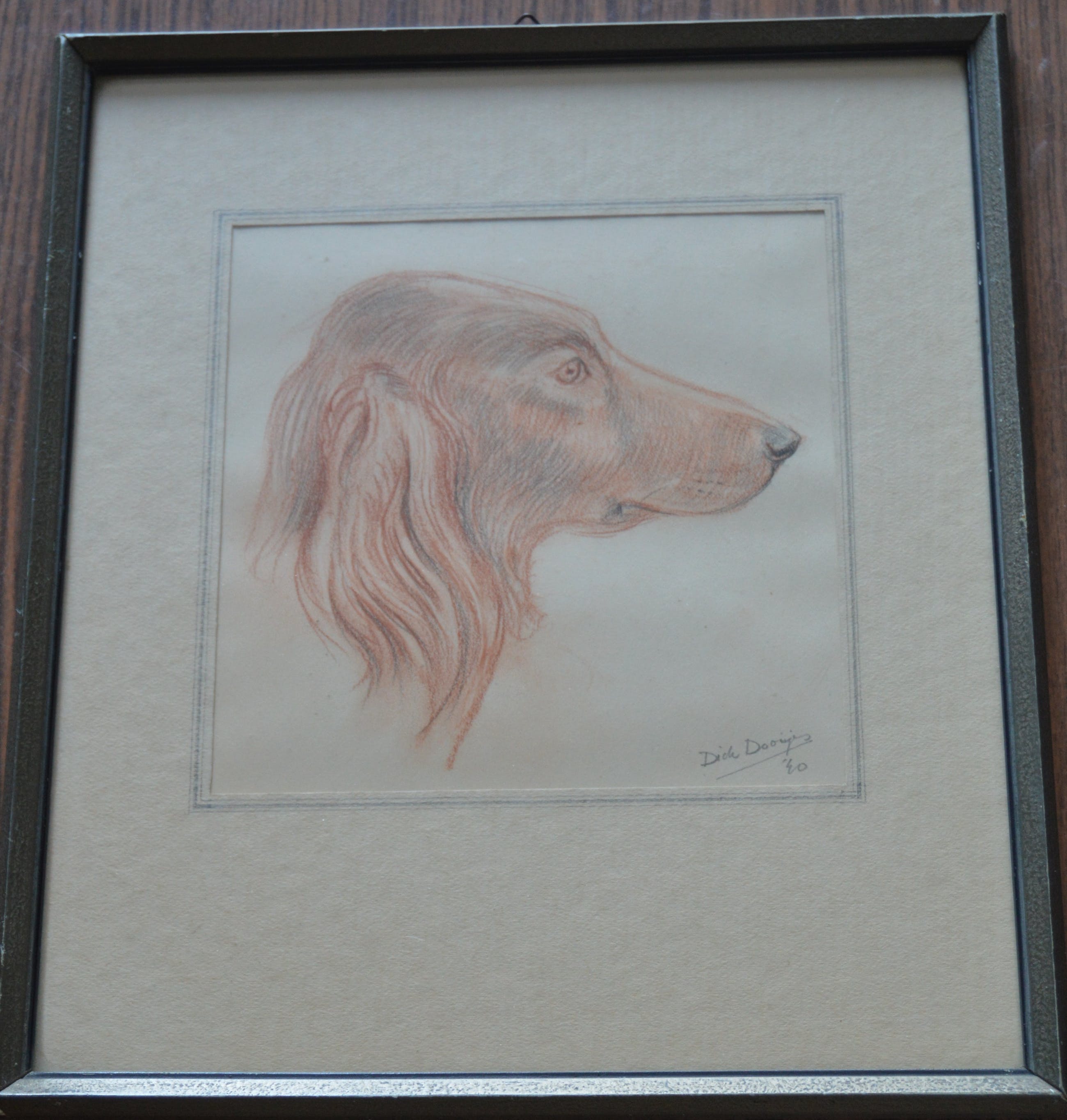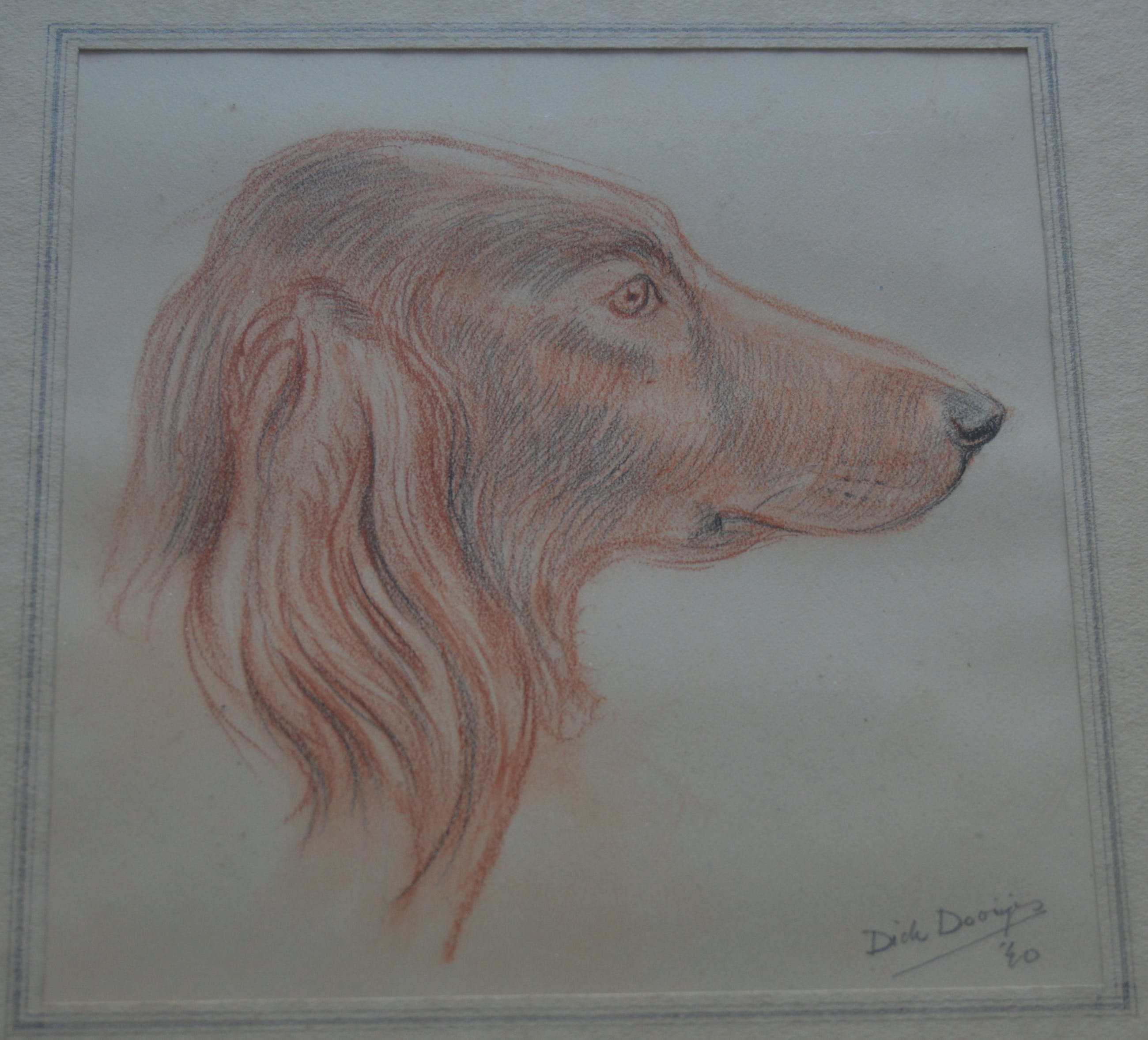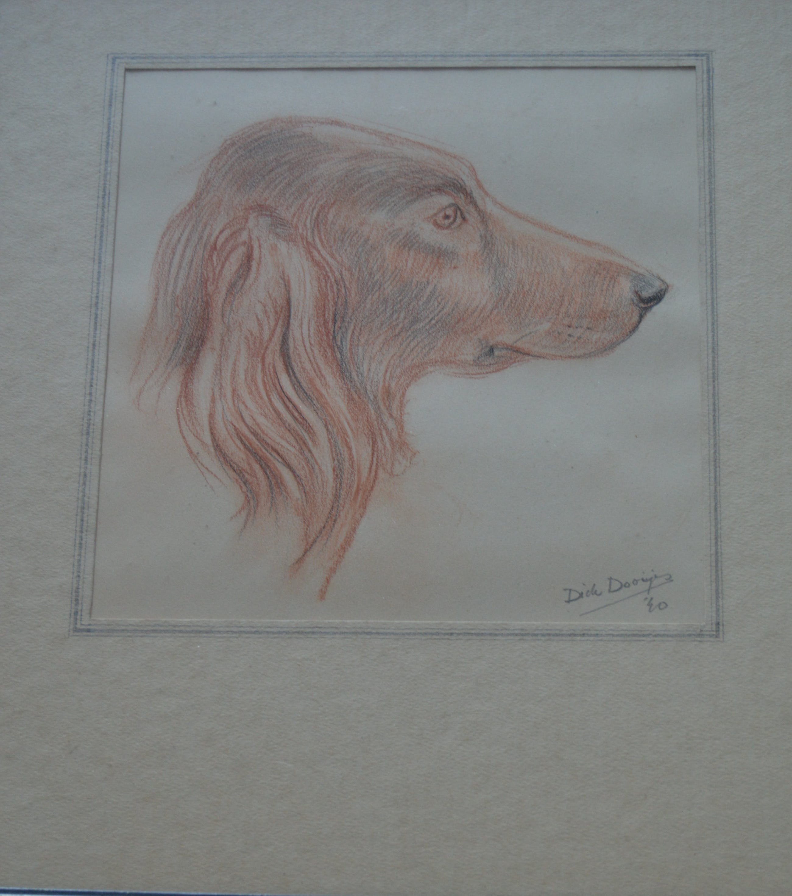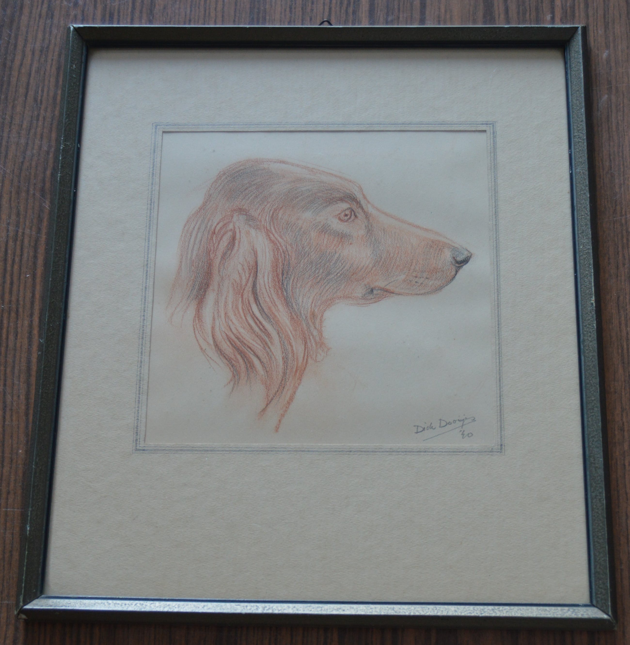 Tekening van het hoofd van een hond. Techniek; tekening in zwart en rood krijt. Gesigneerd en gedateerd in potlood. Prima staat, ingelijst achter glas.