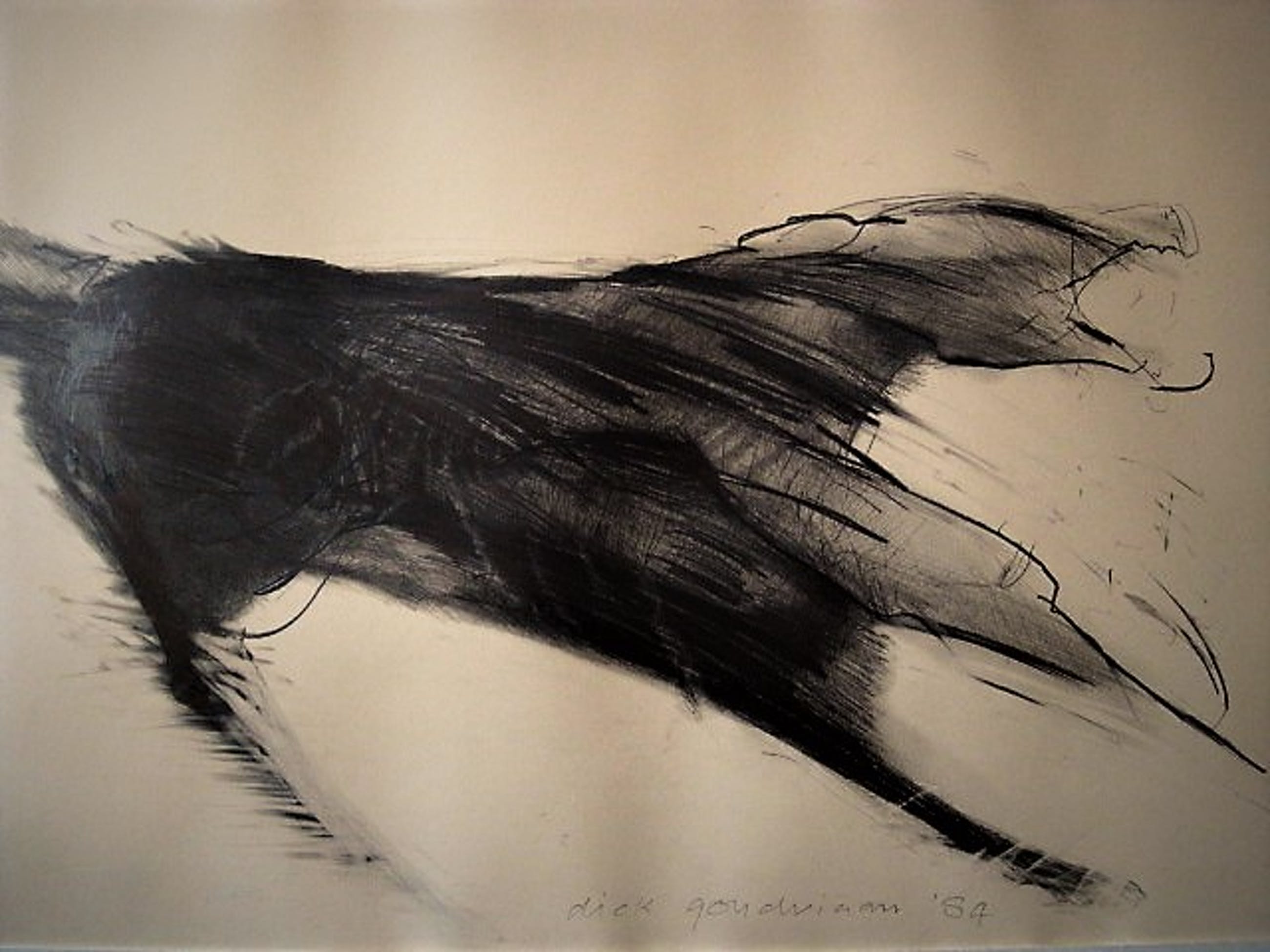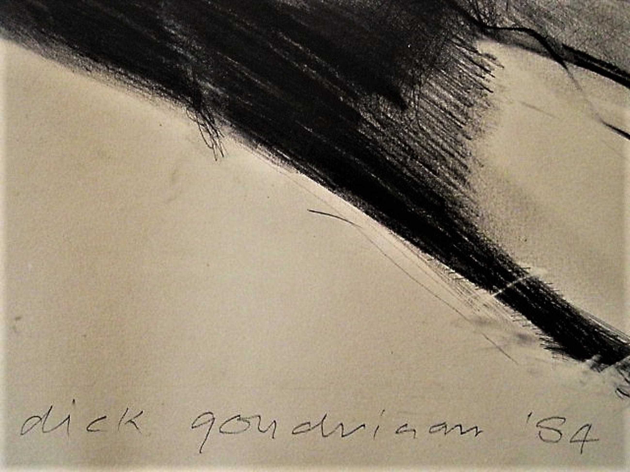 DICK GOUDRIAAN ('46), opgeleid aan de Koninklijke Academie voor Beeldende Kunsten in Den Haag, laat zich inspireren door alledaagse dingen als straatbeelden, foto's en tekstfragmenten.