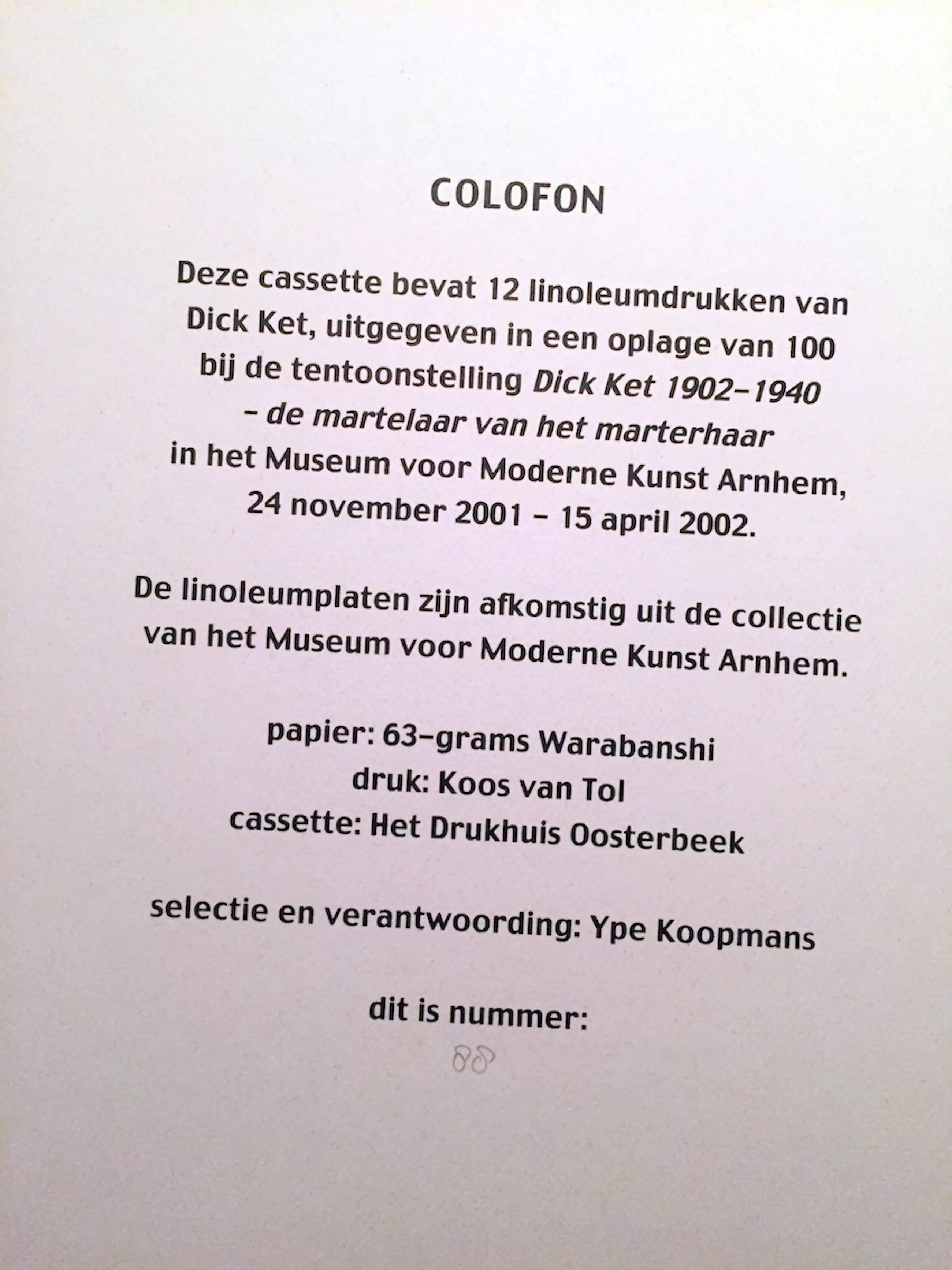 Complete cassette met twaalf genummerde linoleumdrukken van Dick Ket, uitgegeven door het Museum voor Moderne Kunst Arnhem in 2001. Van deze cassette zijn slechts 100 genummerde exemplaren uitgegeven, dit is nummer 88 (eenmaal nummer 8). Elke linoleumdruk is gedrukt op 63 grams Warabanshi (een zwaardere papiersoort dan Ket zelf gebruikte), ieder afzonderlijk met potlood genummerd en met blindstempel van de drukker (Het Drukhuis Oosterbeek).