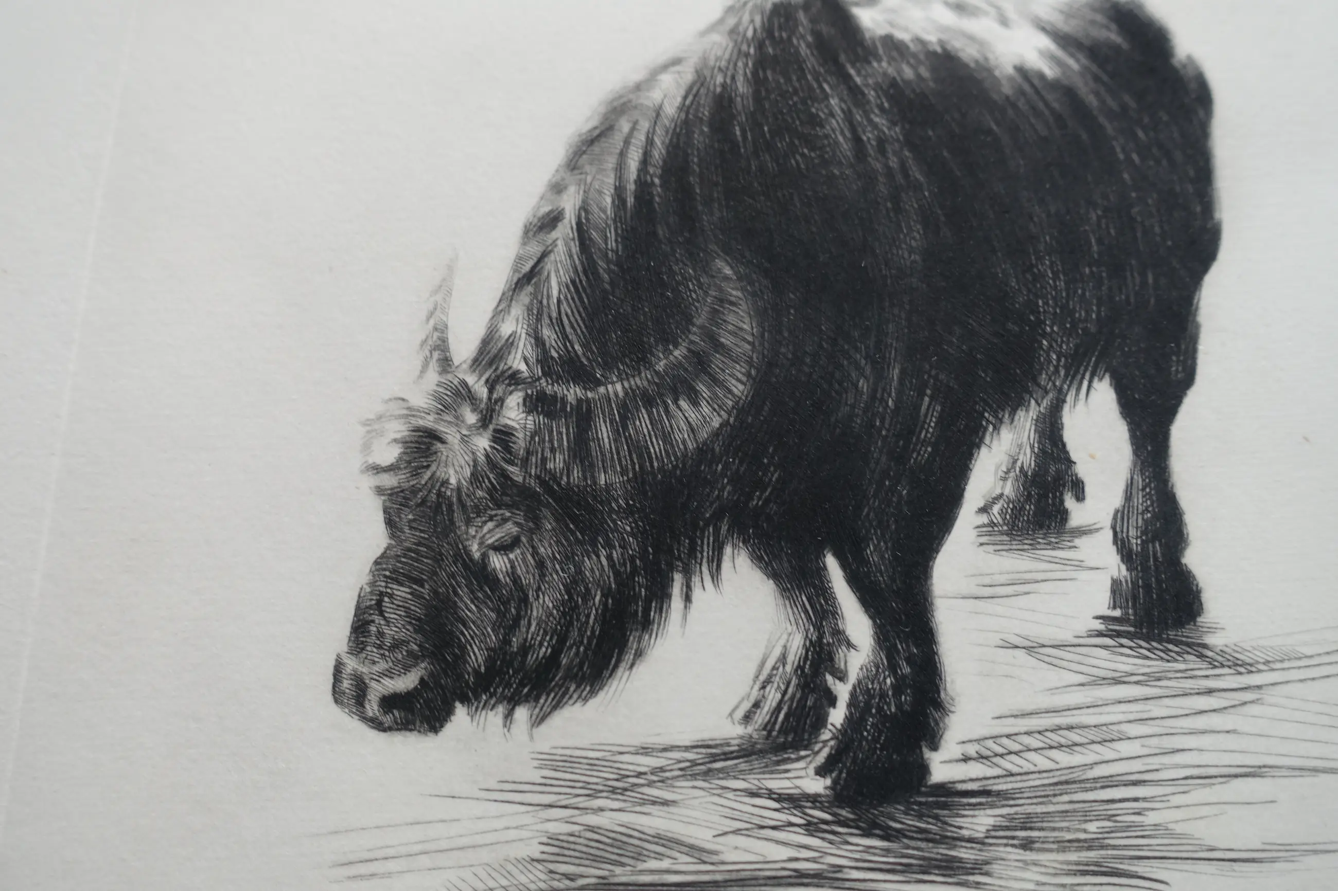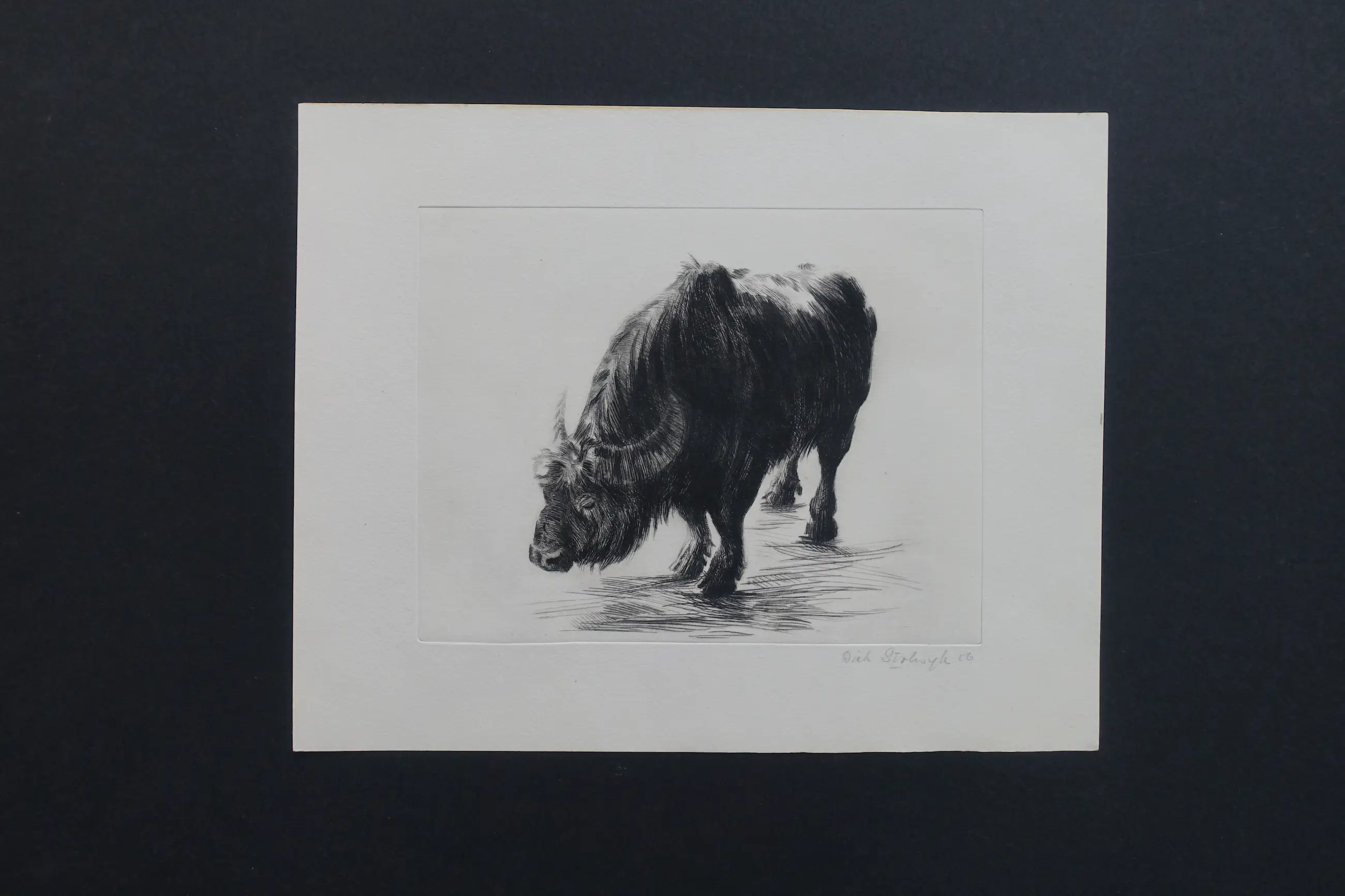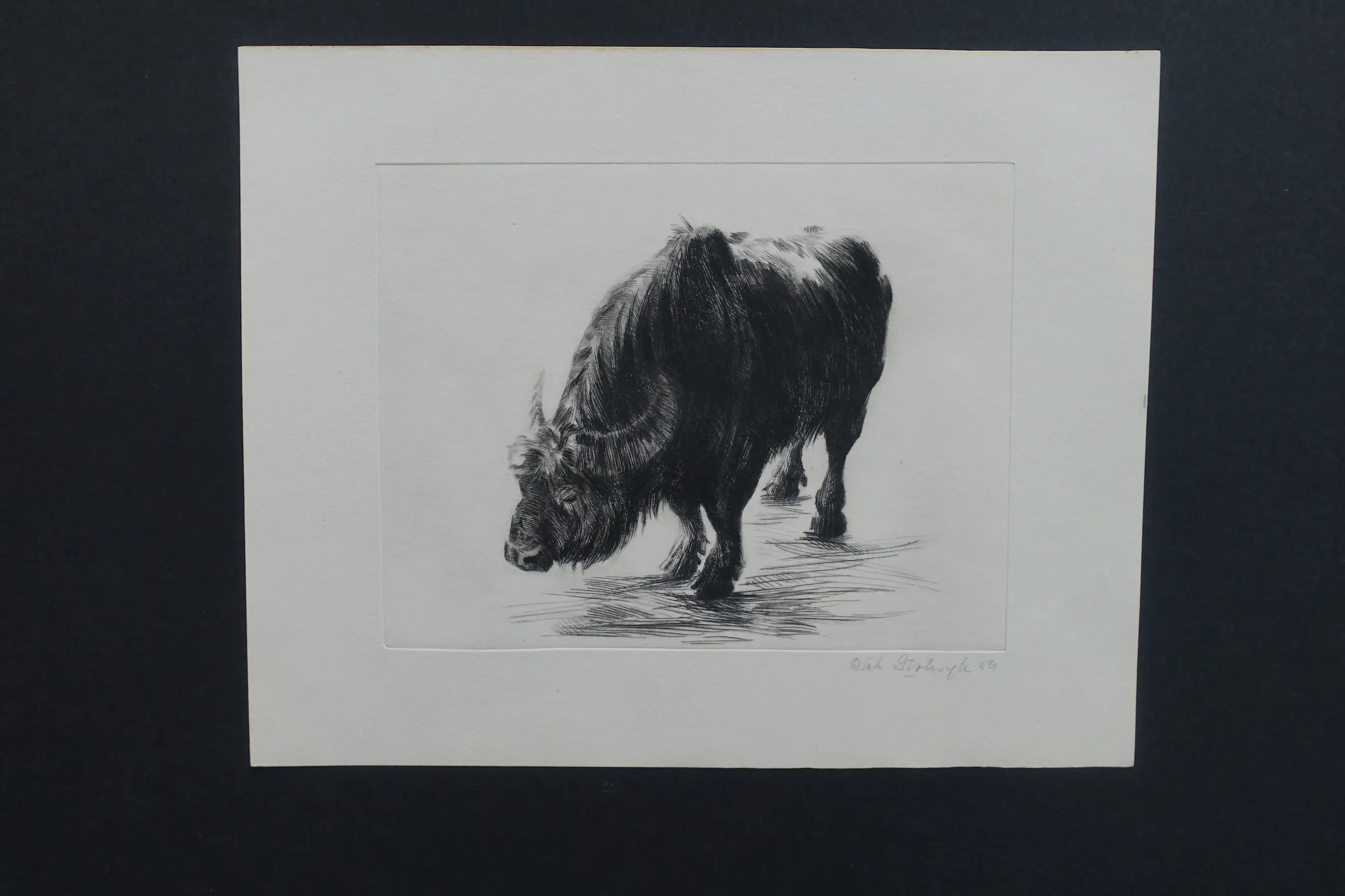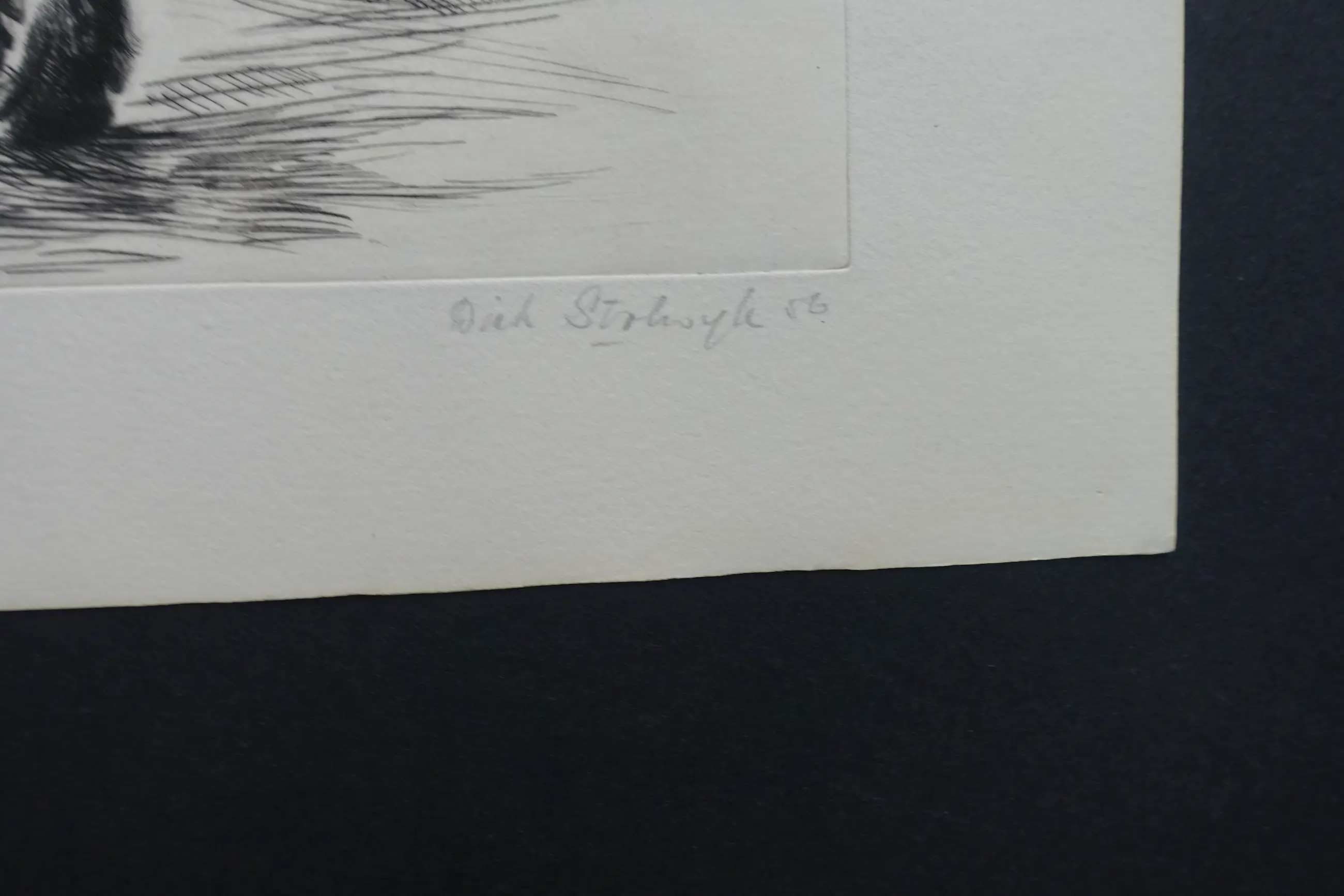 In zeer goede staat verkerende ets van Dick Stolwijk. Gesigneerd en gedateerd ( 1956) met potlood. Beeldformaat 16.5 x 21.5 cm. Formaat van het blad is 24.5 x 31 cm.