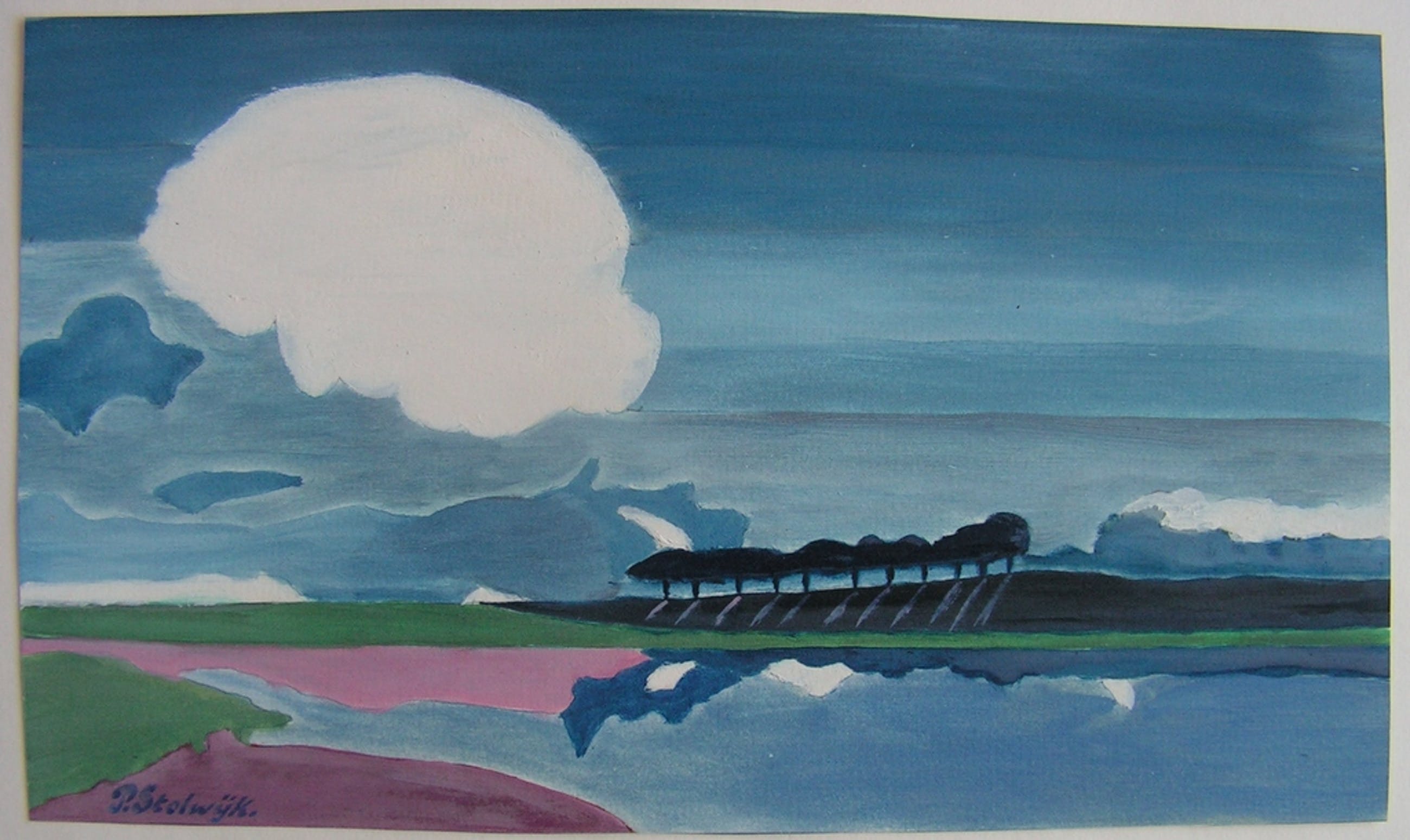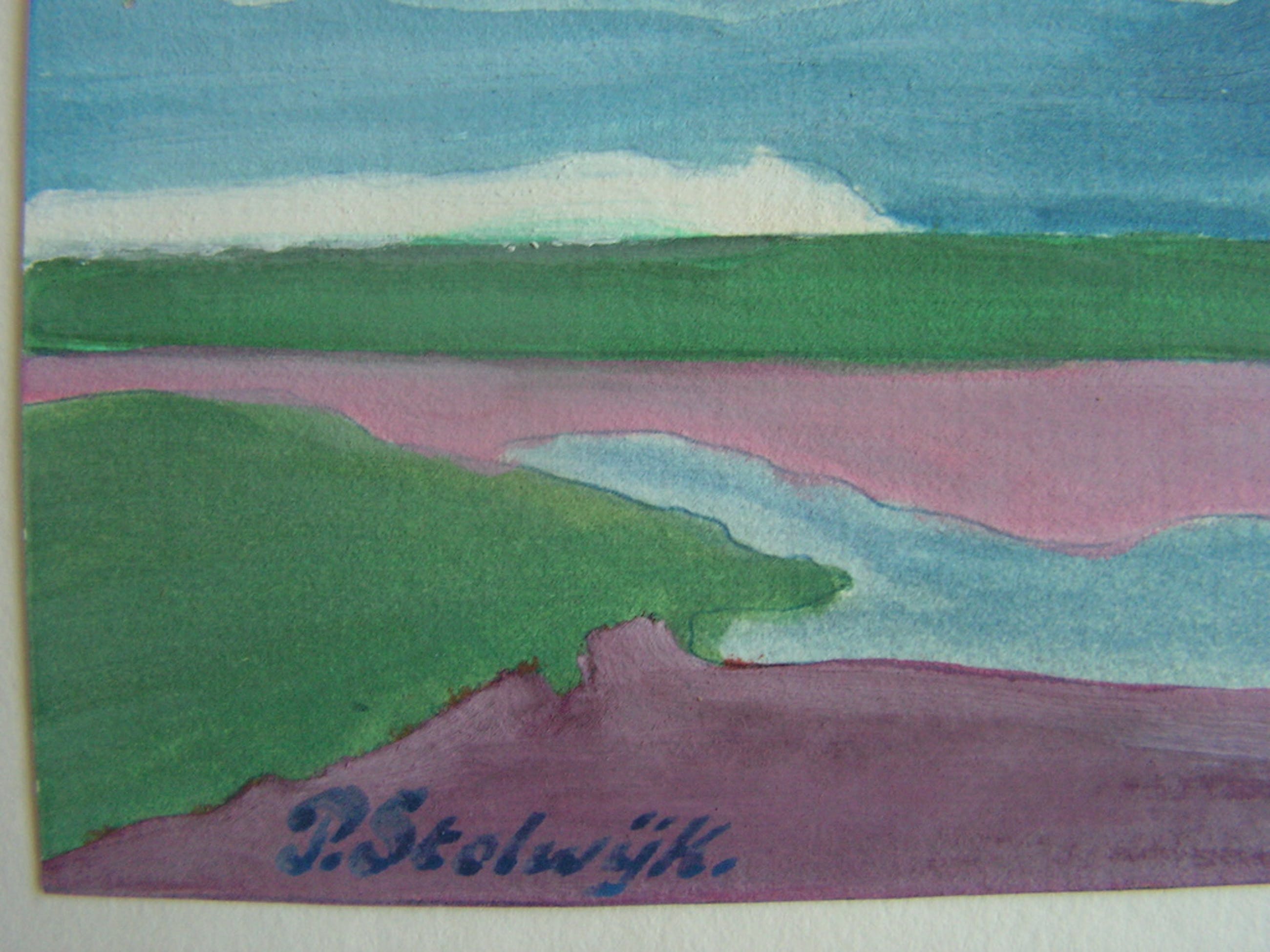 Mooi abstract landschap, gesigneerd linksonder Stolwijk. Afmetingen; 30,5 x 18 cm. Conditie is prima.