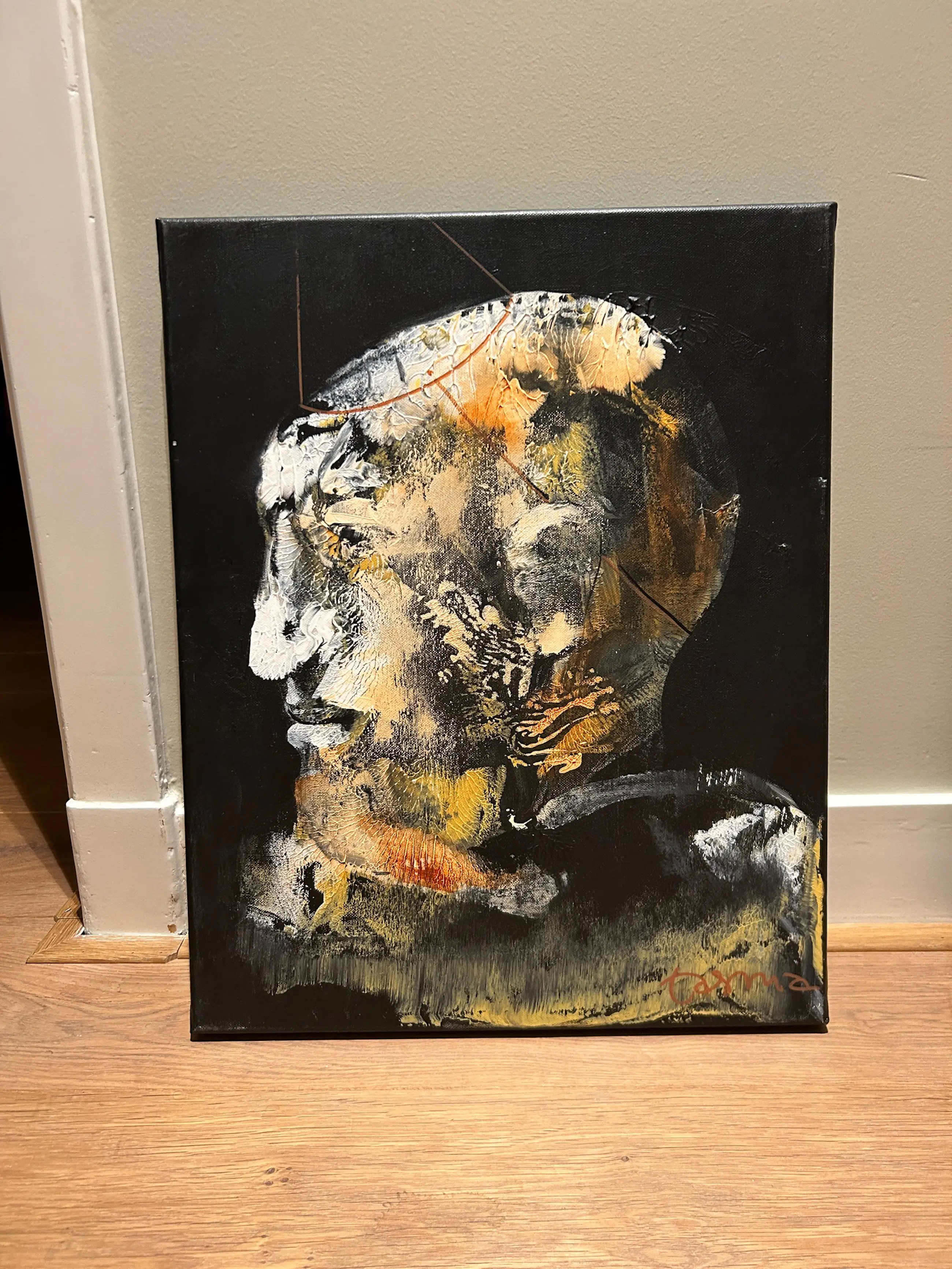 Abstract werk in iets minder typerende Tasma stijl. Daarmee bijzonder van kleur, het lichte hoofd op de donkere achtergrond geeft bij bestudering telkens meer details vrij. Het lichte hoofd bevat wel de zo typisch oranje tinten van Tasma, maar hier met veel meer nuance dan in zijn lichter of bruine werk. Voor de echte liefhebber een mooie aanvulling. Maar ook voor de gewone kunstliefhebber een bijzonder werk.