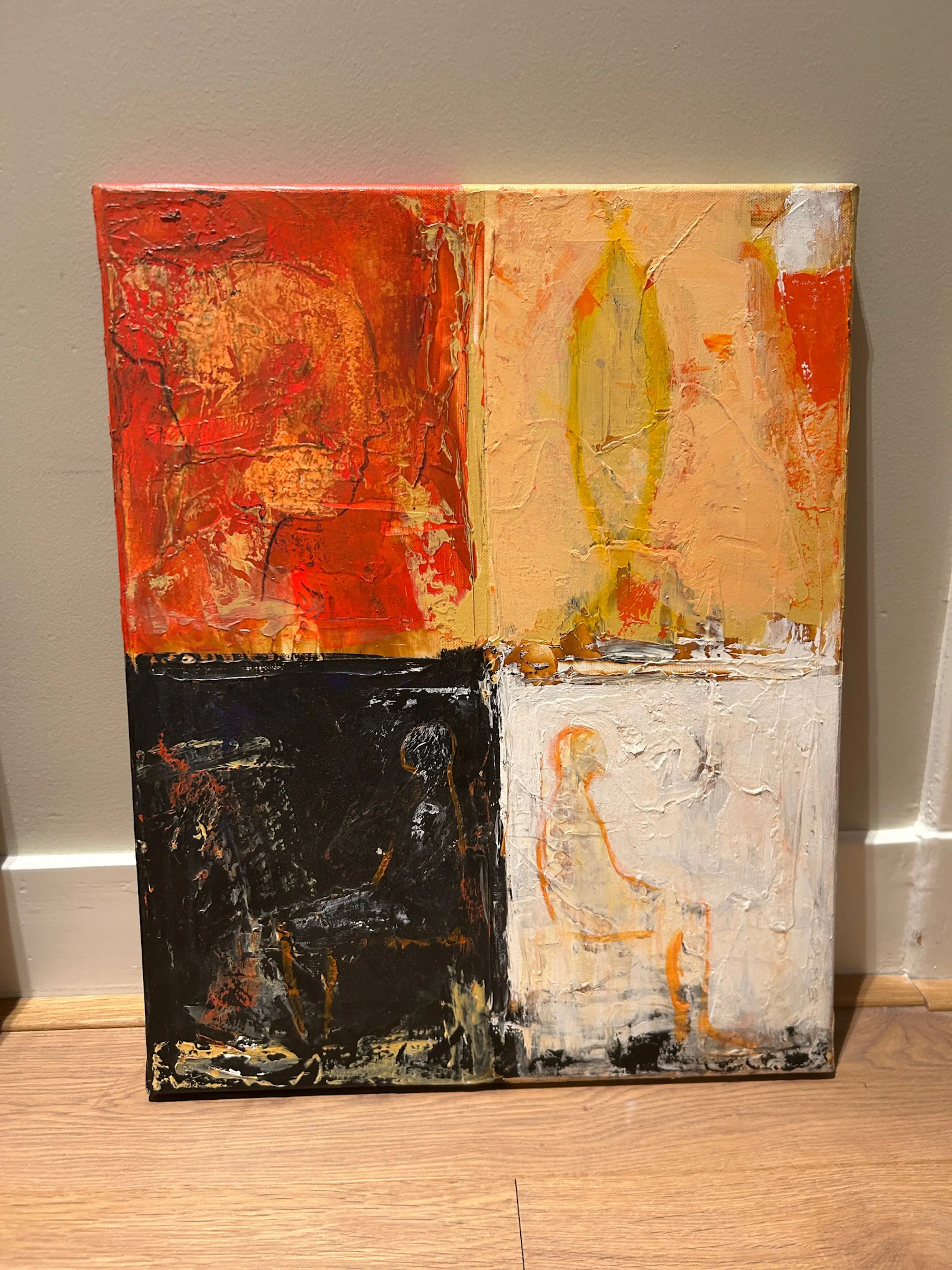 Typische Tasma kleuren ingevuld werk op doek (acryl). De vier vlakken laten in diverse kleurstellingen met nadruk op oranje en zwart/wit een duidelijke vlakverdeling zien met kleine figuurstudies die in veel van Dick Tasma zijn werk terug komen. Het werk is in goede staat, geen zichtbare beschadigingen. Een mooi werk voor een Tasma liefhebber, maar ook gewoon een prachtig werk om op te hangen. Eventueel mooie combinatie met het andere aangeboden werk van Dick Tasma