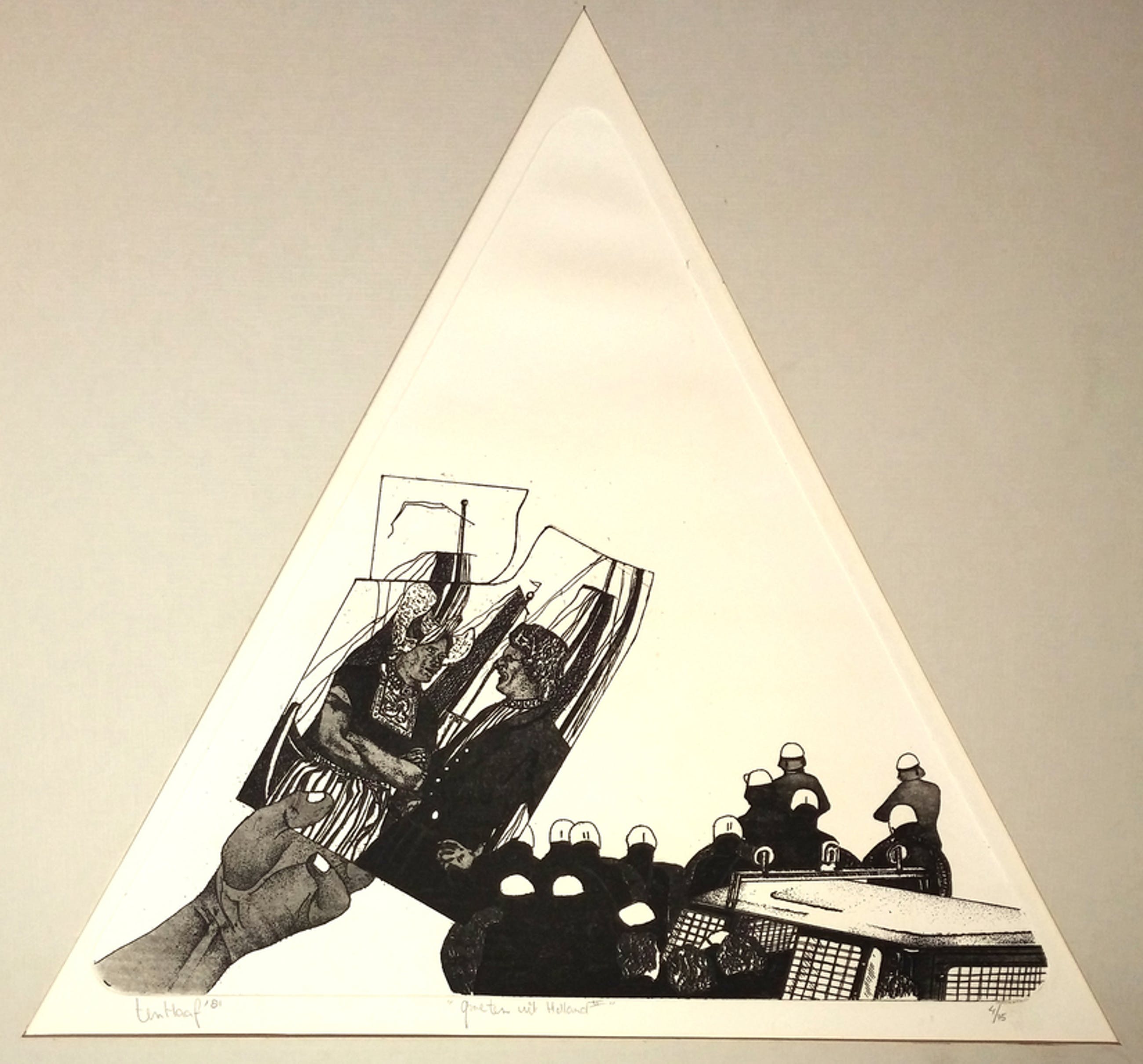 Diehoekige aquatint/ets 4/15 uit 19814 van Dick ten Haaf. Te zien is een gescheurde foto van 2 personen in Volendamse klederdracht, met daaronder een ME busje met diverse ME'ers.