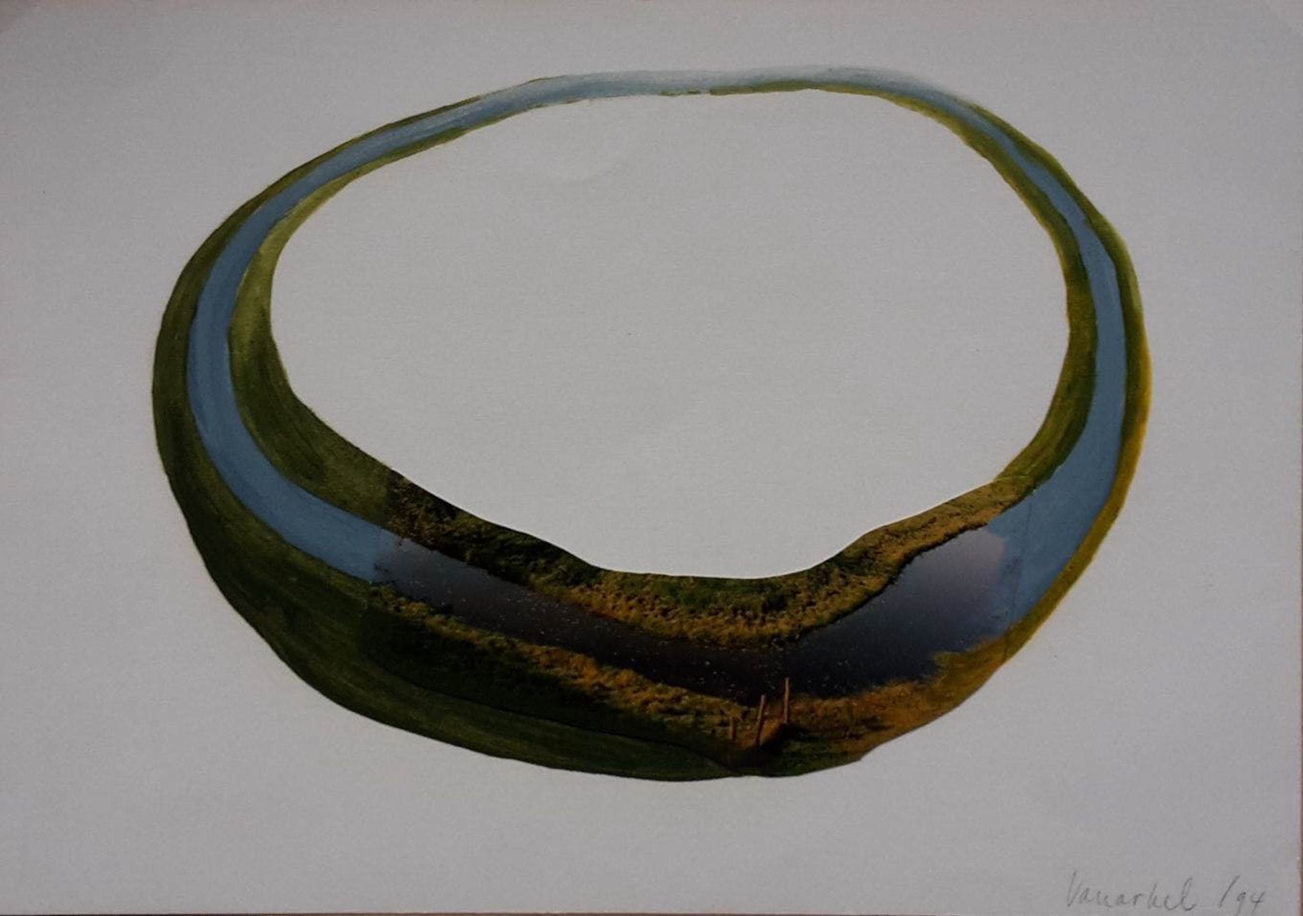 polderlandschap, gedeeltelijk overschilderd en bijgeschilderd tot een ovale ronde sloot op papier van 21,7 x 30,7 cm. gesigneerd met potlood en jaartal 1974. Het combineren van landschapsfoto's met (over)schilderingen is een typerende werkwijze van Dick van Arkel, waarbij vooral bomen en het polderlandschap centraal staan