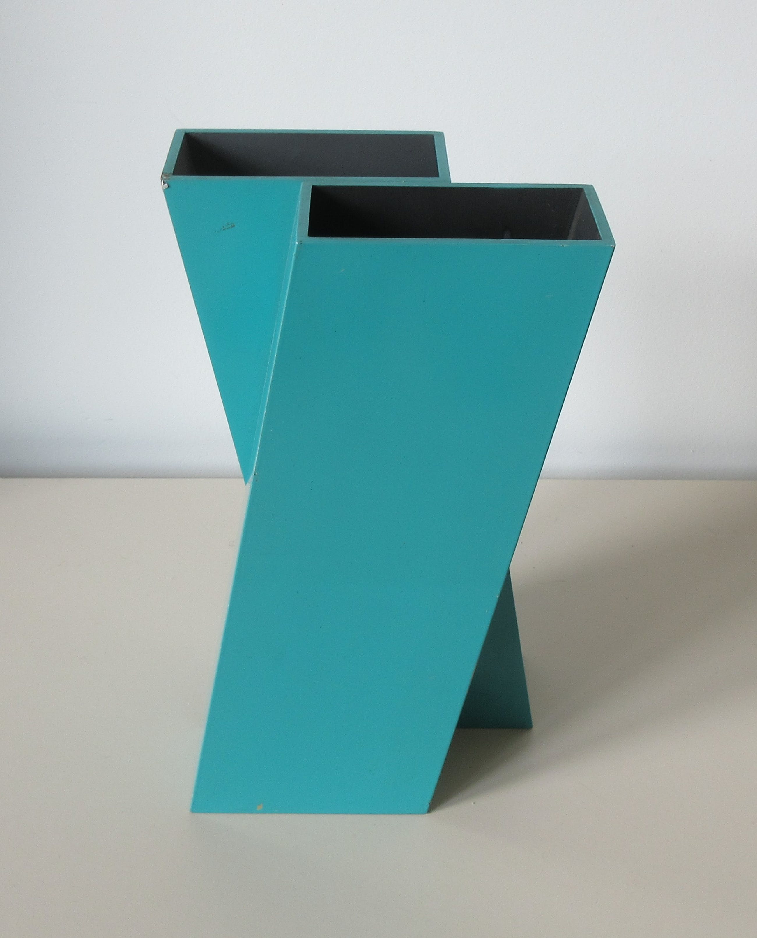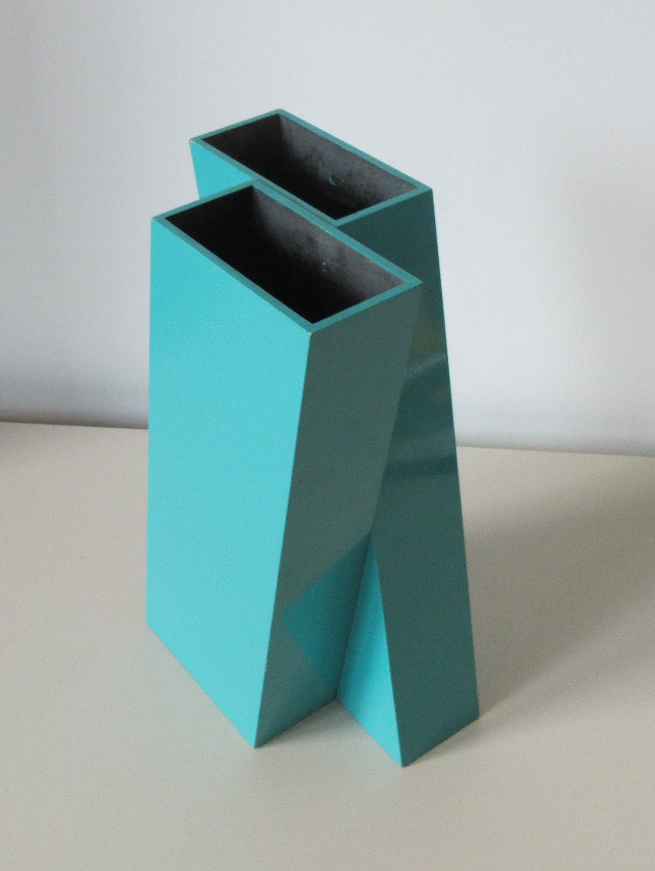 The vase has a geometrical shape and looks different from every angle; this is hard to photograph. The same goes for the turquoise-like colour, which has a warmth which is hard to capture. Inside coated in black