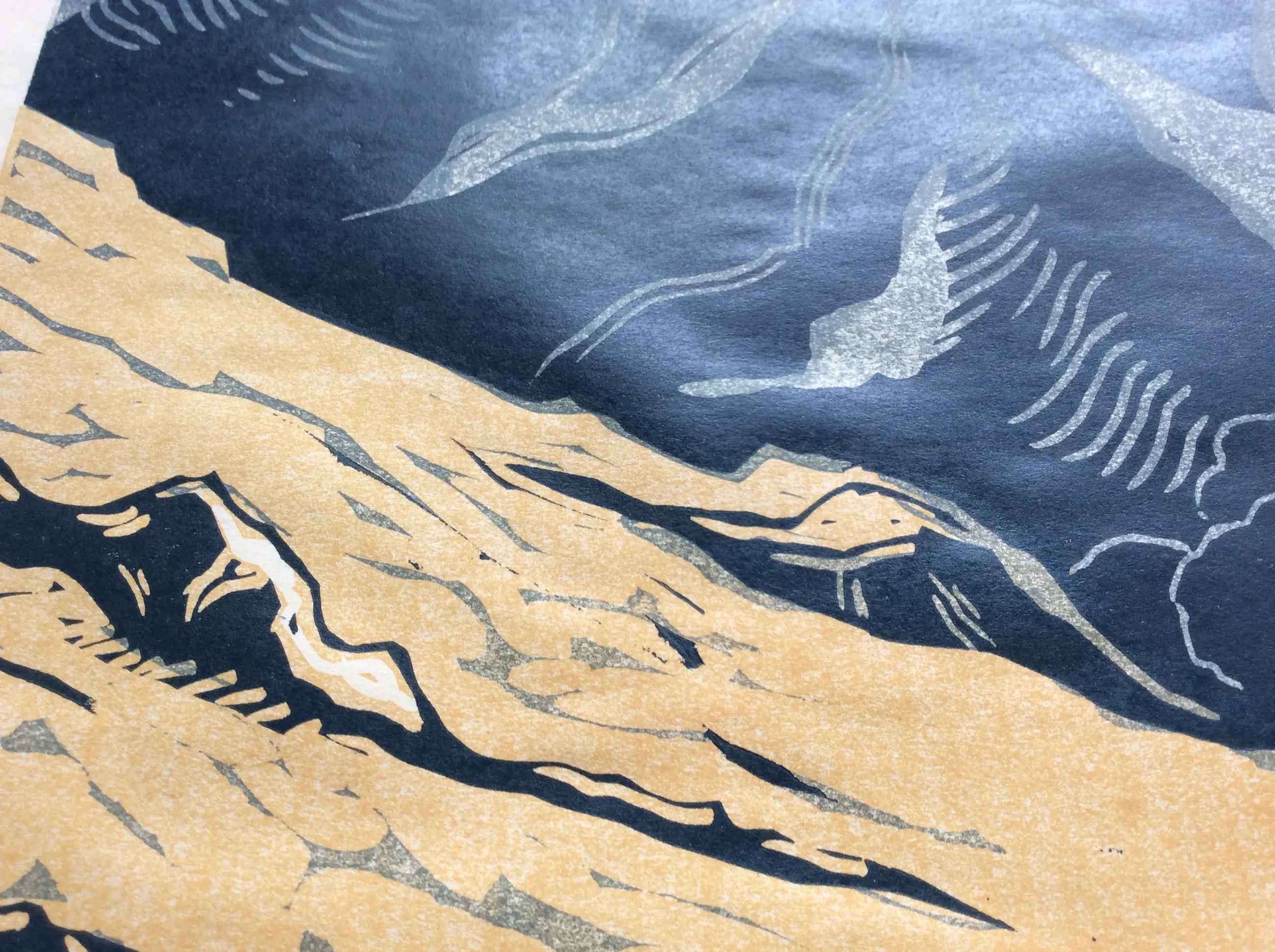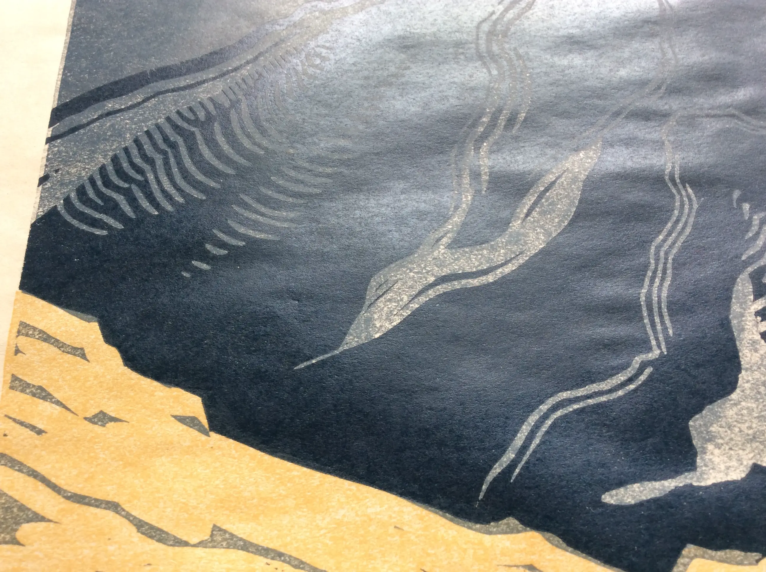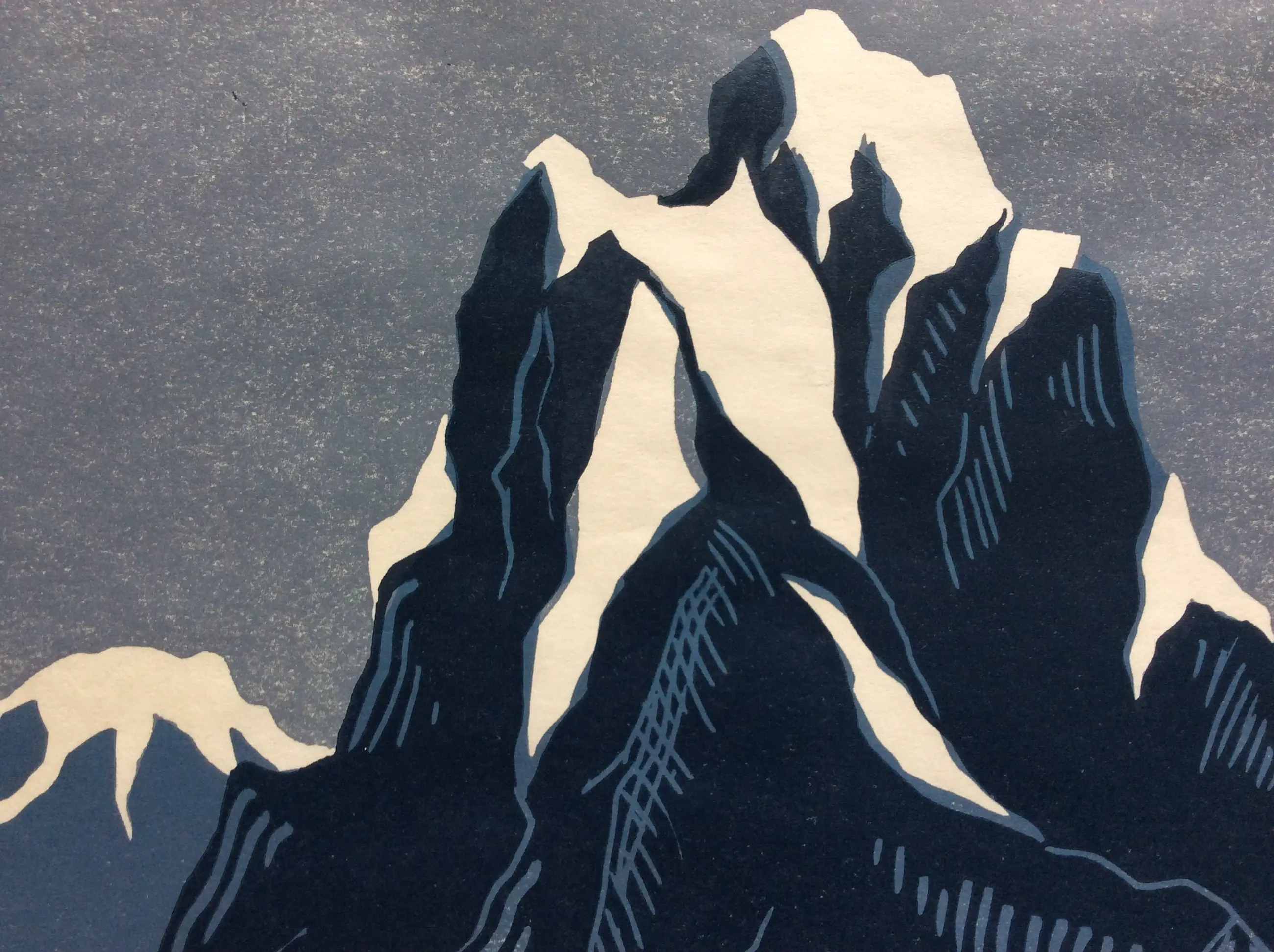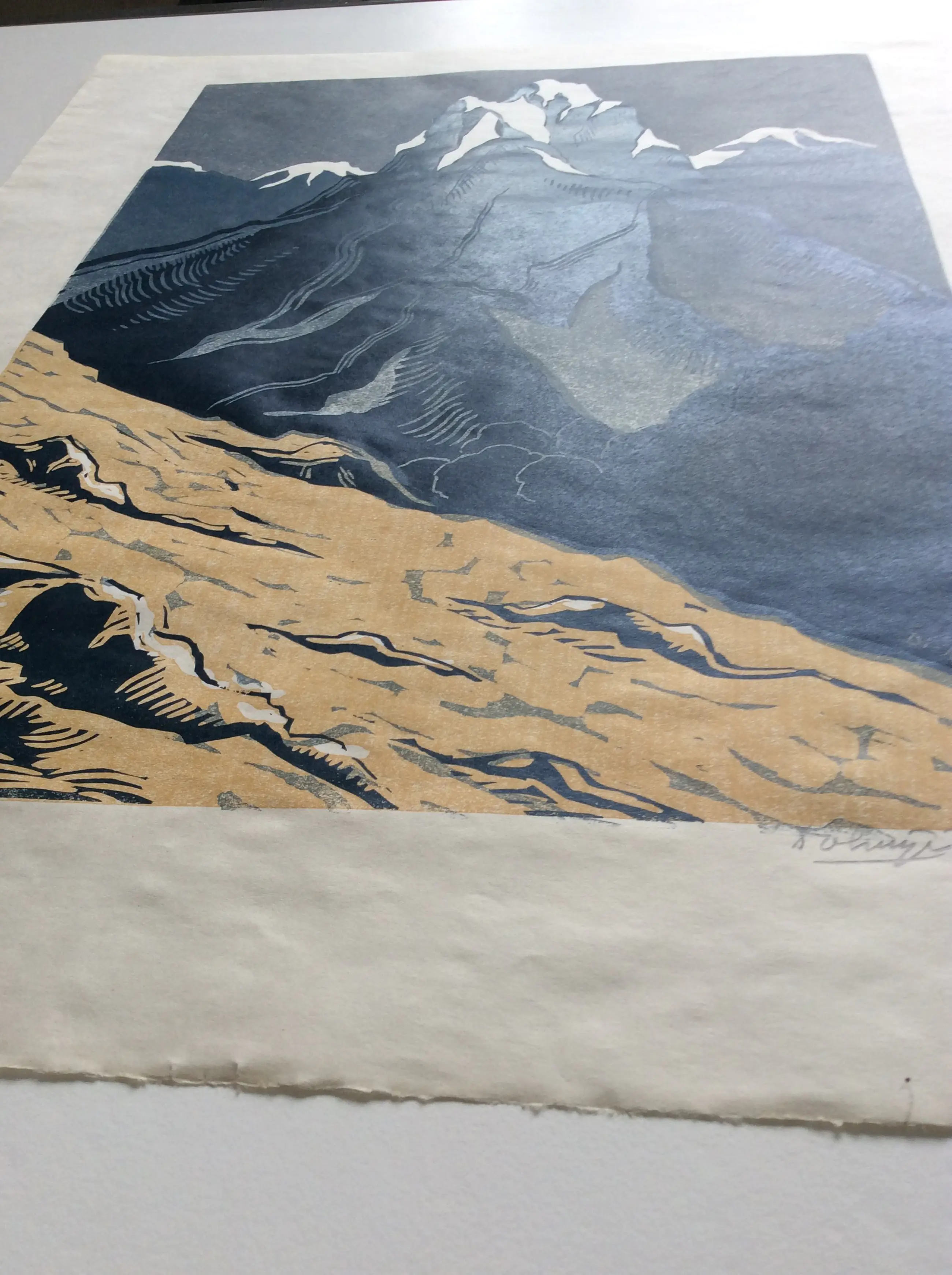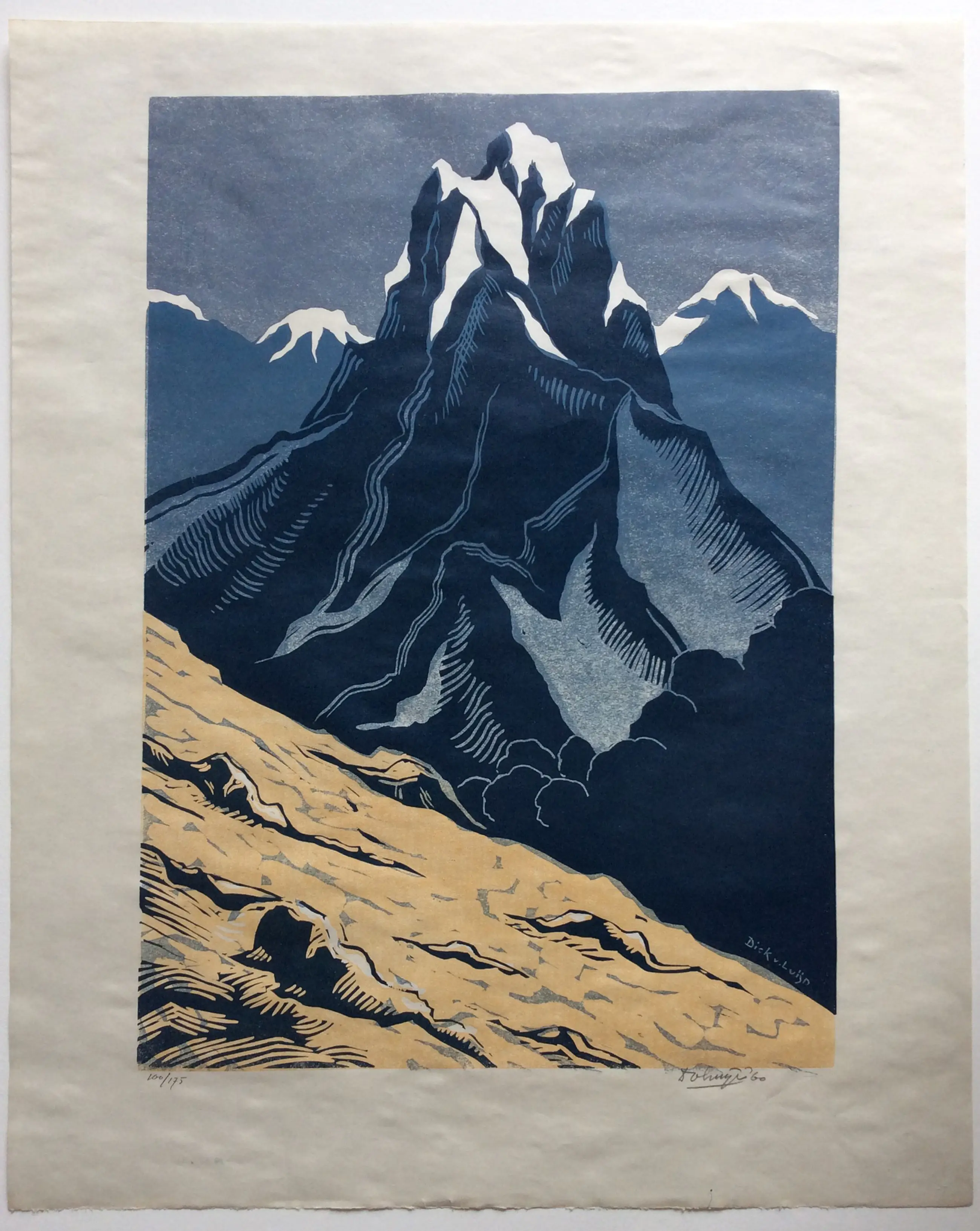 Kenmerkende kleuren linodruk van Dick van Luijn uit 1960: Berglandschap met sneeuwtoppen. Formaat druk: 33 x47 cm, incl. witrand: 46 x 57 cm. Potlood gesigneerd r.o. plus in de druk. Oplage 100/175. In prima conditie.