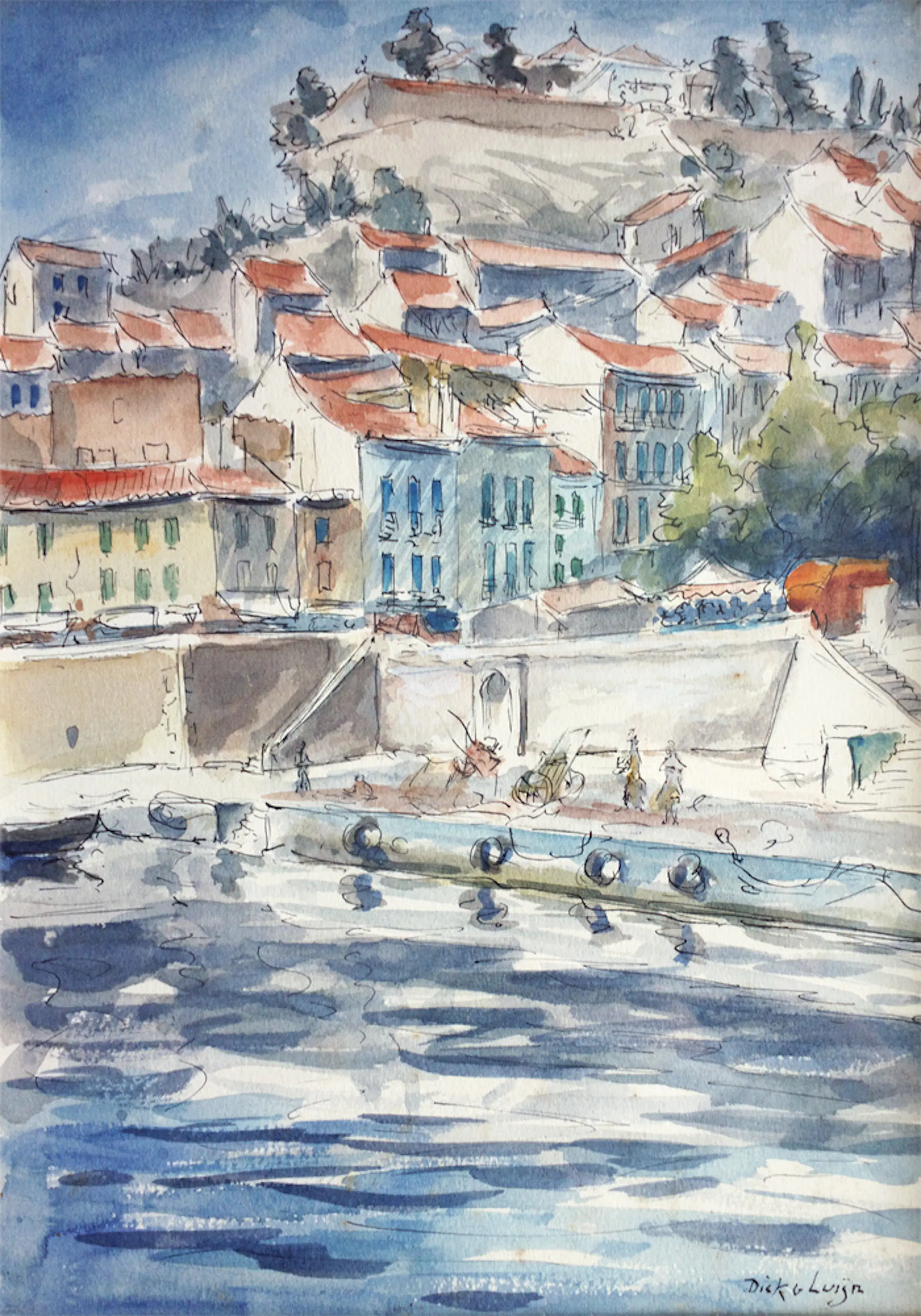 Over het werk: Aquarel van de Nederlandse kunstenaar Dick van Luijn. Afgebeeld is de haven van Port-Vendres in het zuiden van Frankrijk. Het werk is rechtsonder gesigneerd met 'Dick van Luijn'.