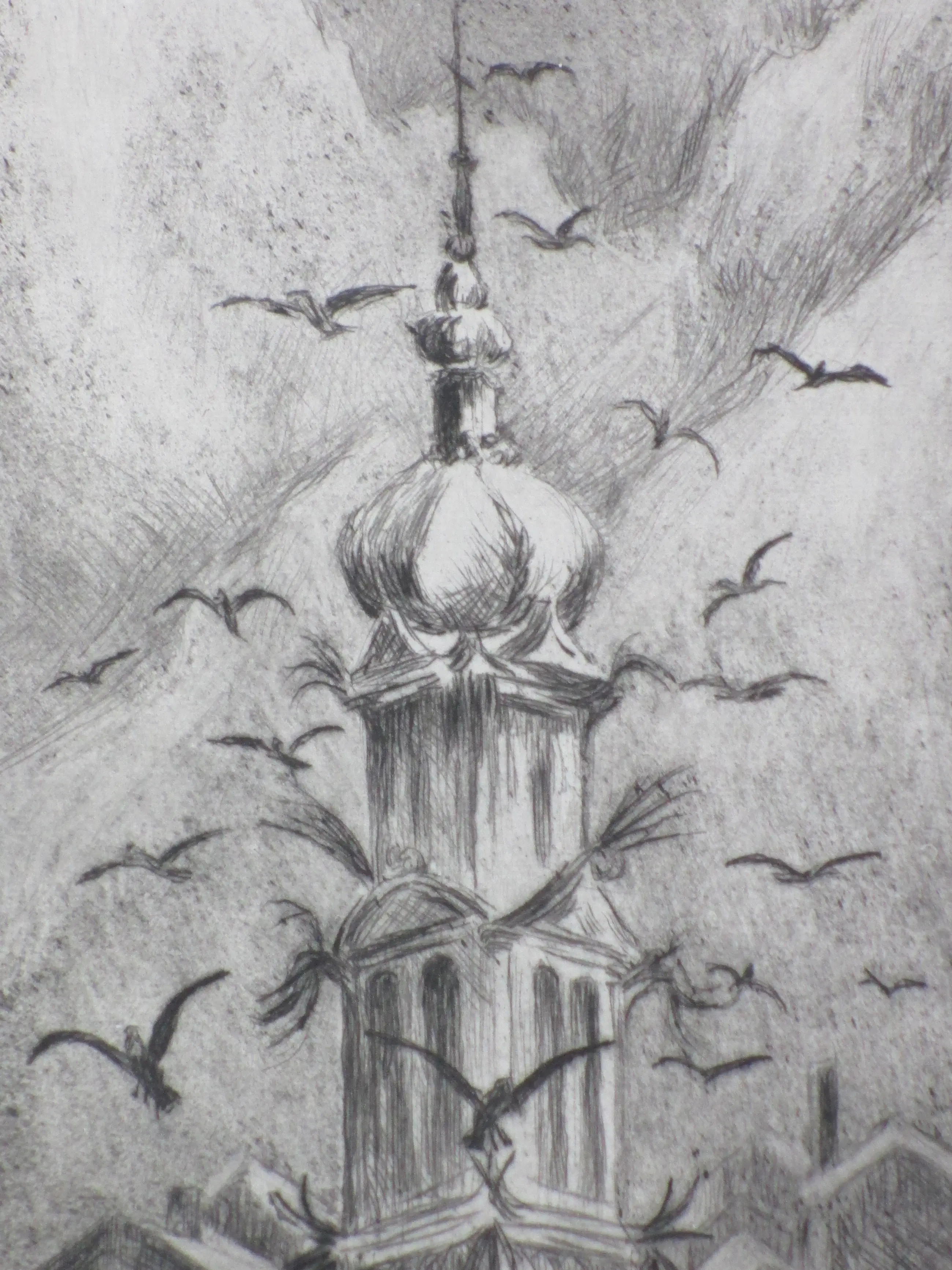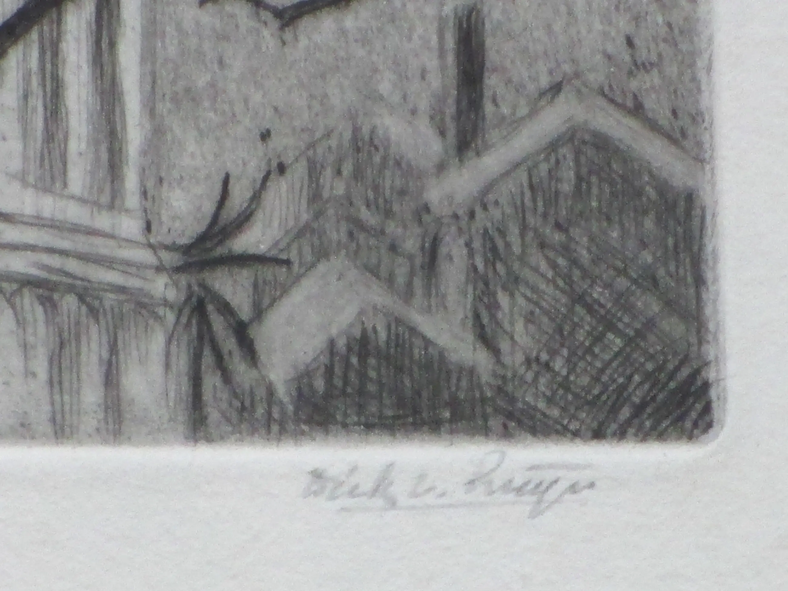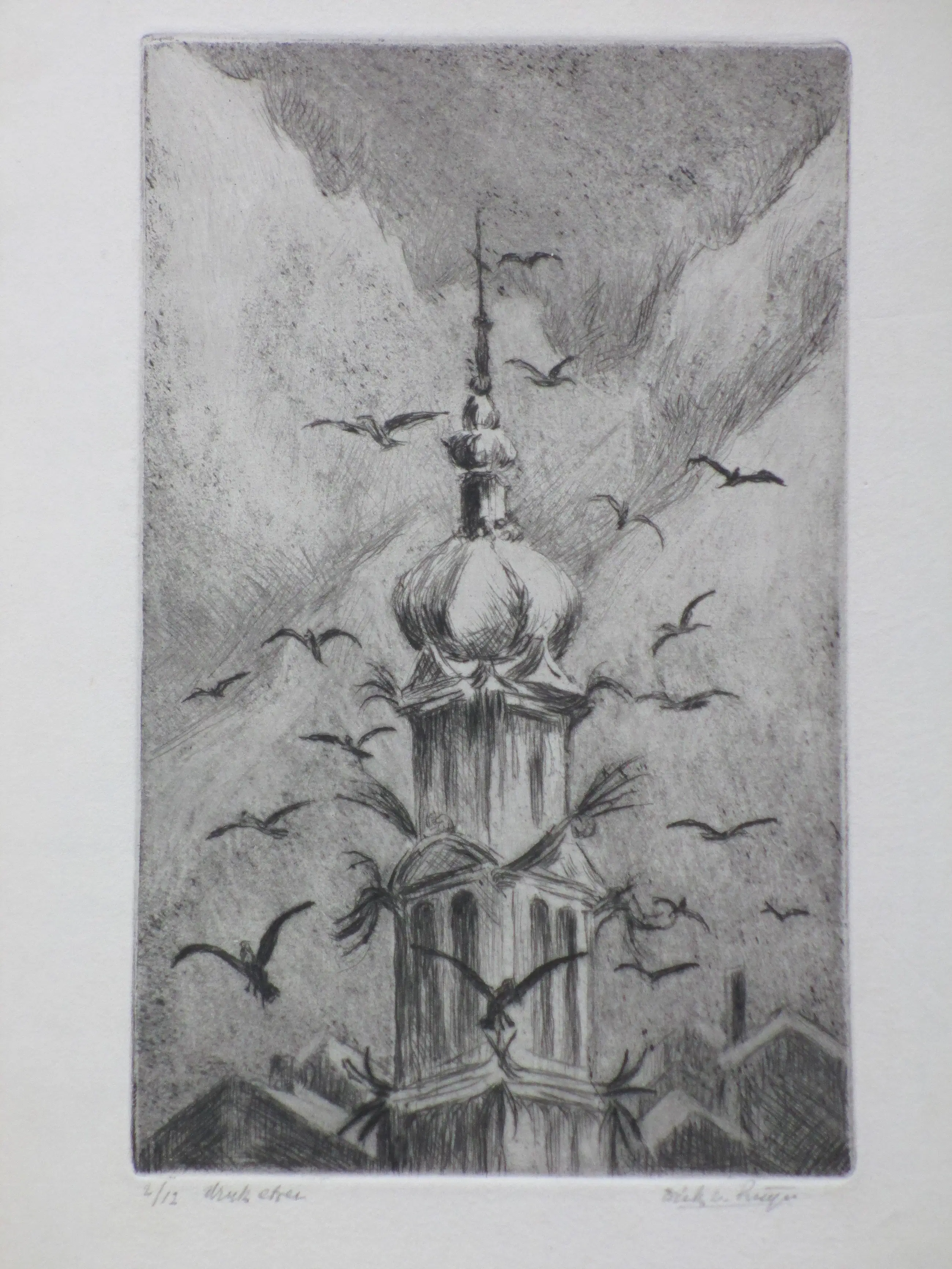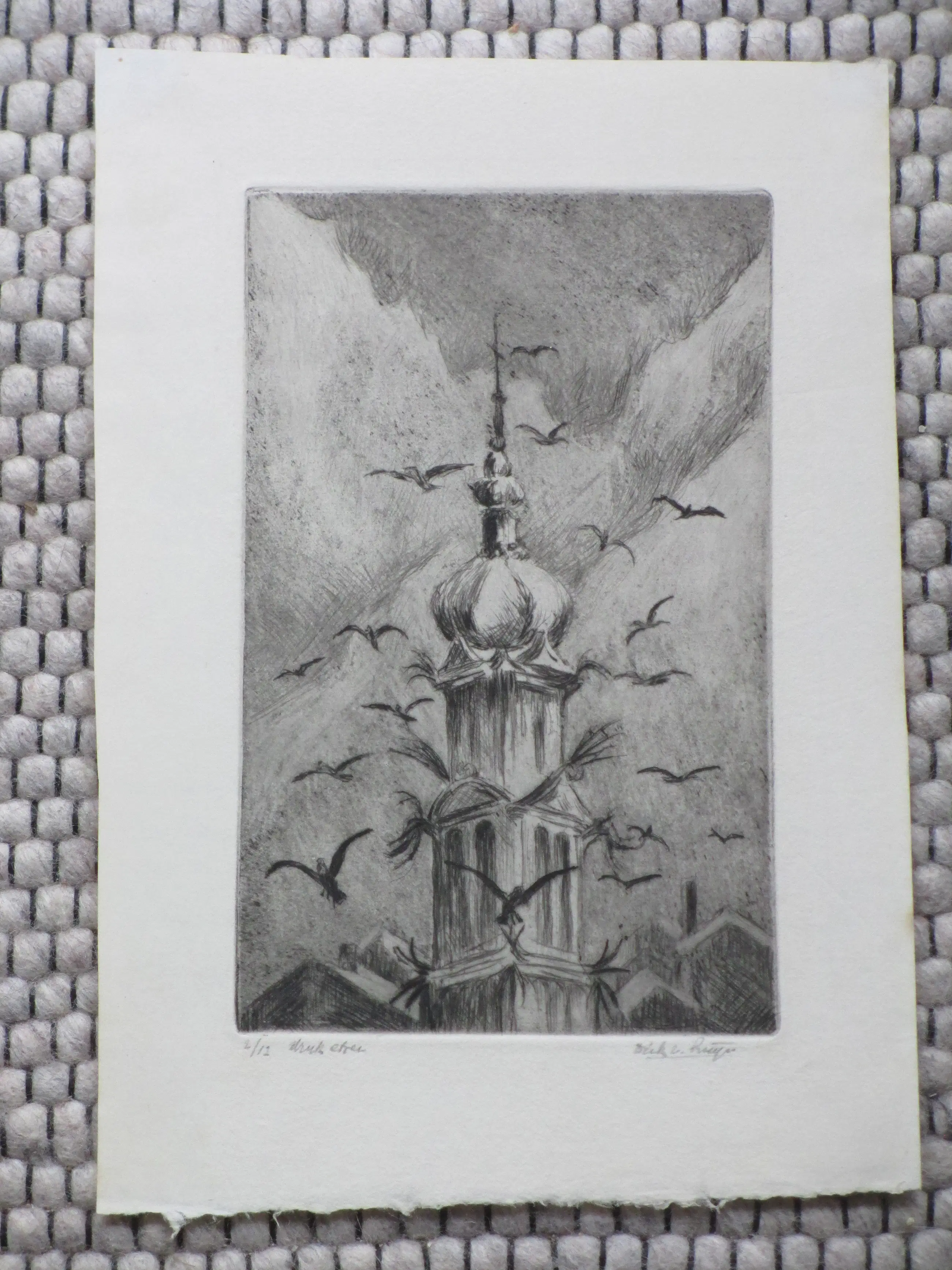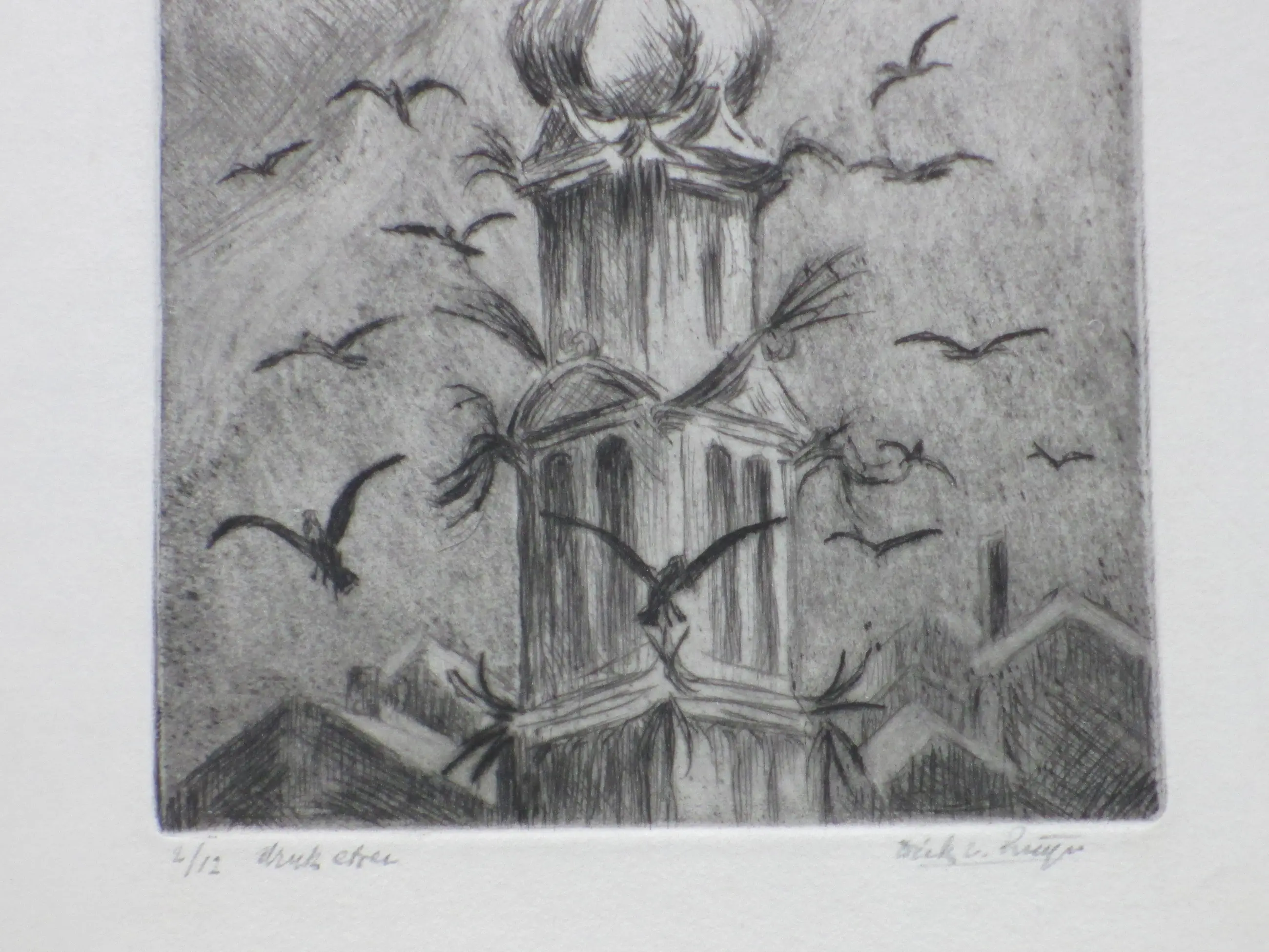 Ets door Dick van Luijn Voorstelling van rondcirkelende vogels om een kerk Losbladig, beeldmaat 20x12, bladmaat 27x19 Gesigneerd in potlood r.o.: 'Dick v. Luijn' Kleine oplage Genummerd in potlood l.o.: '2/12' en 'druk etser' Authenticiteit volledig gegarandeerd