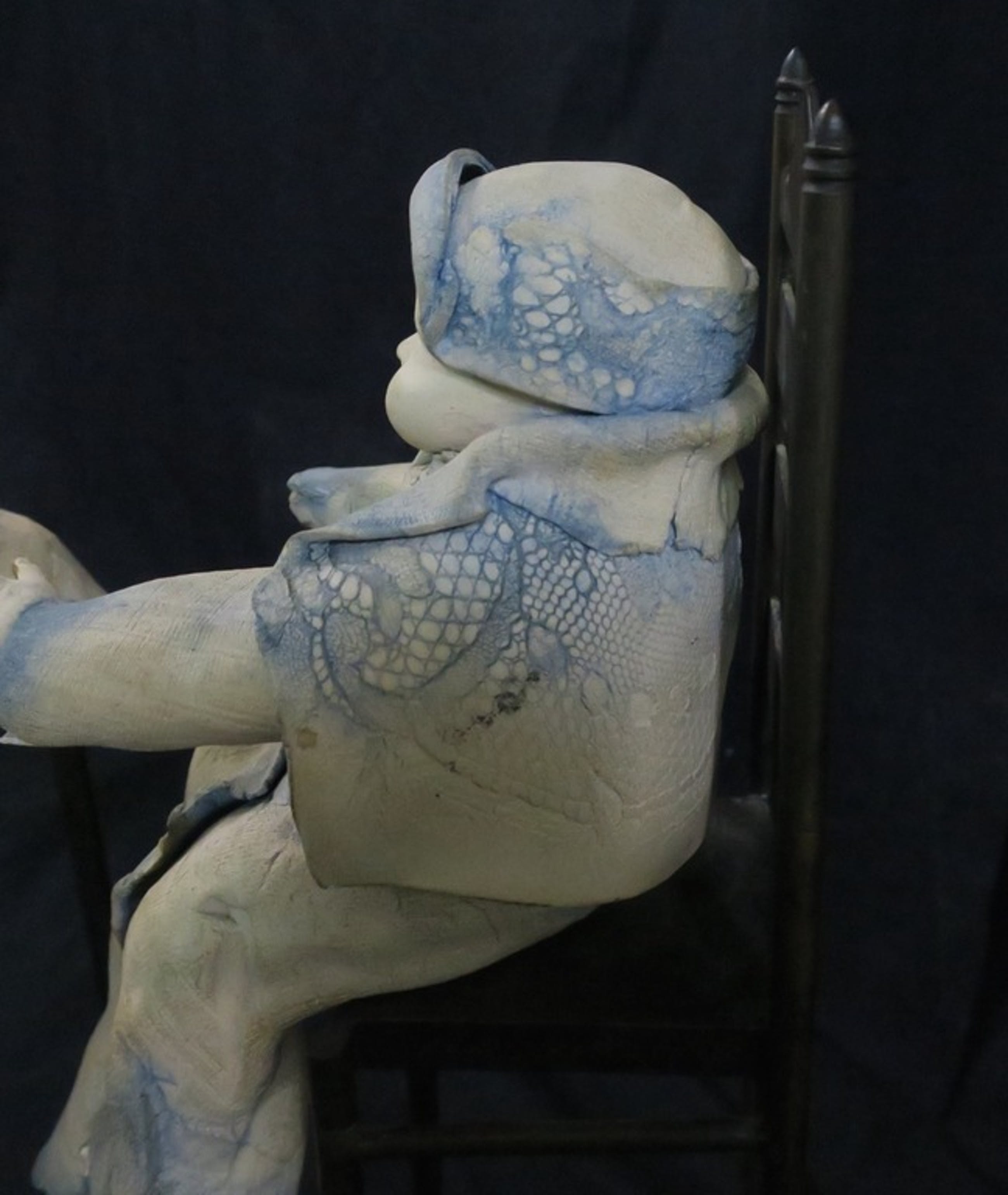 Conditie: In redelijk goede staat. Klein stukje keramiek is afgebroben aan onderkant van het manteltje.