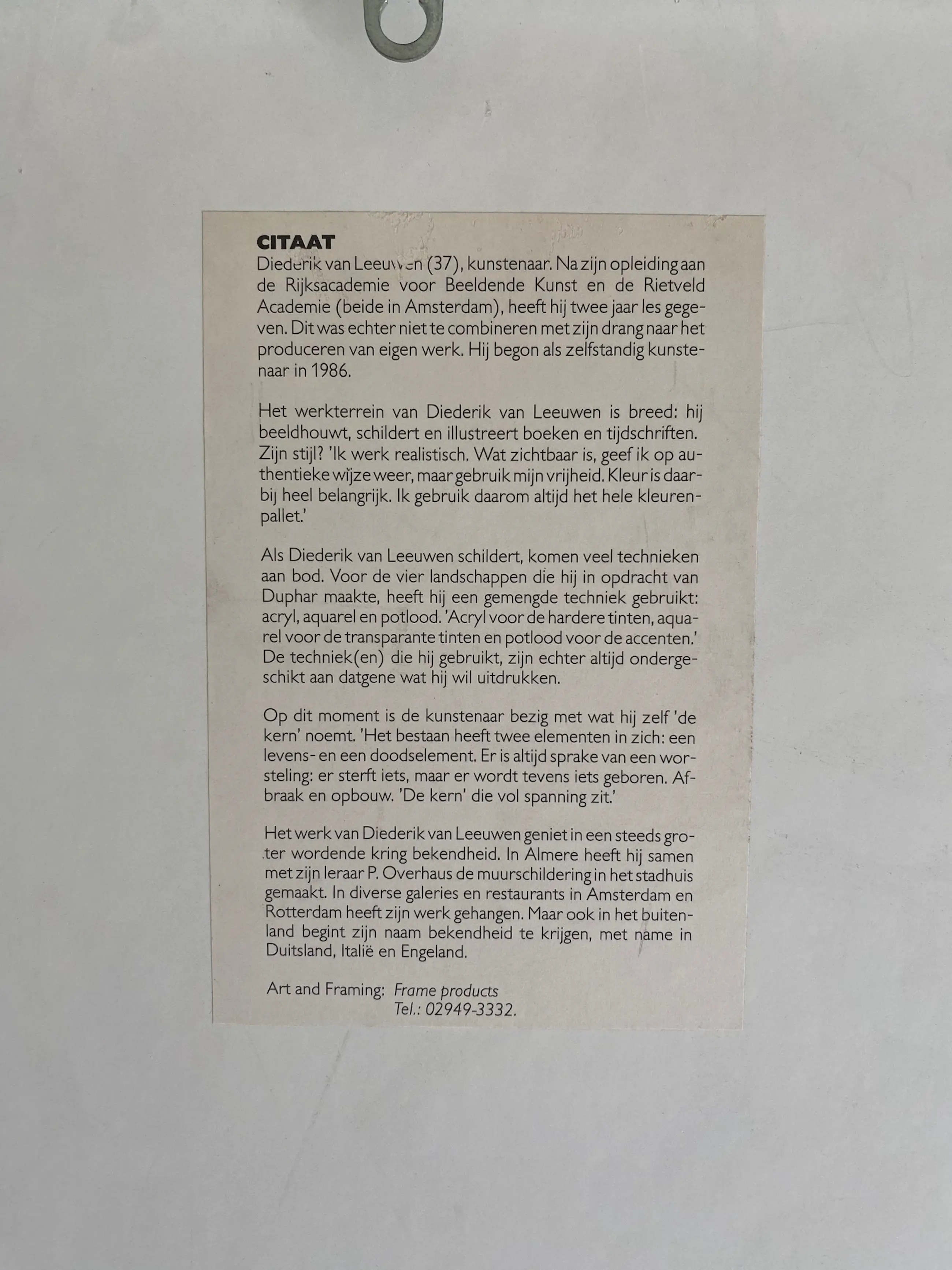 Foto in passe-partout. Glansdrukfoto, aangebracht op passe-partout. Ingelijst achter glas. Werk en passe-partout in uitstekende conditie. Van het wit-metalen frame is hier en daar de lak er af. Op de achterkant van het werk een toelichtende levensbeschrijving van Diederik van Leeuwen. Zie foto's