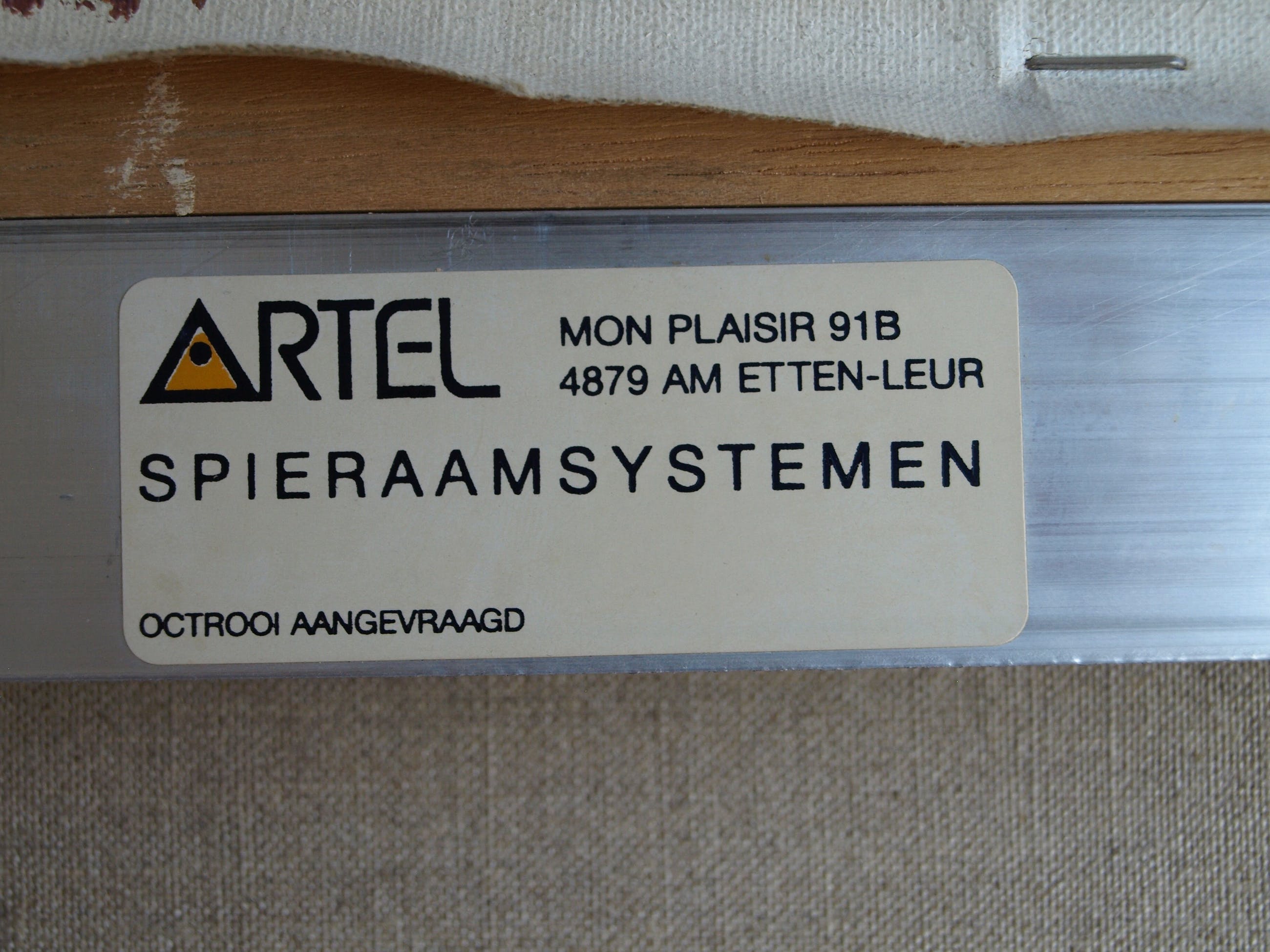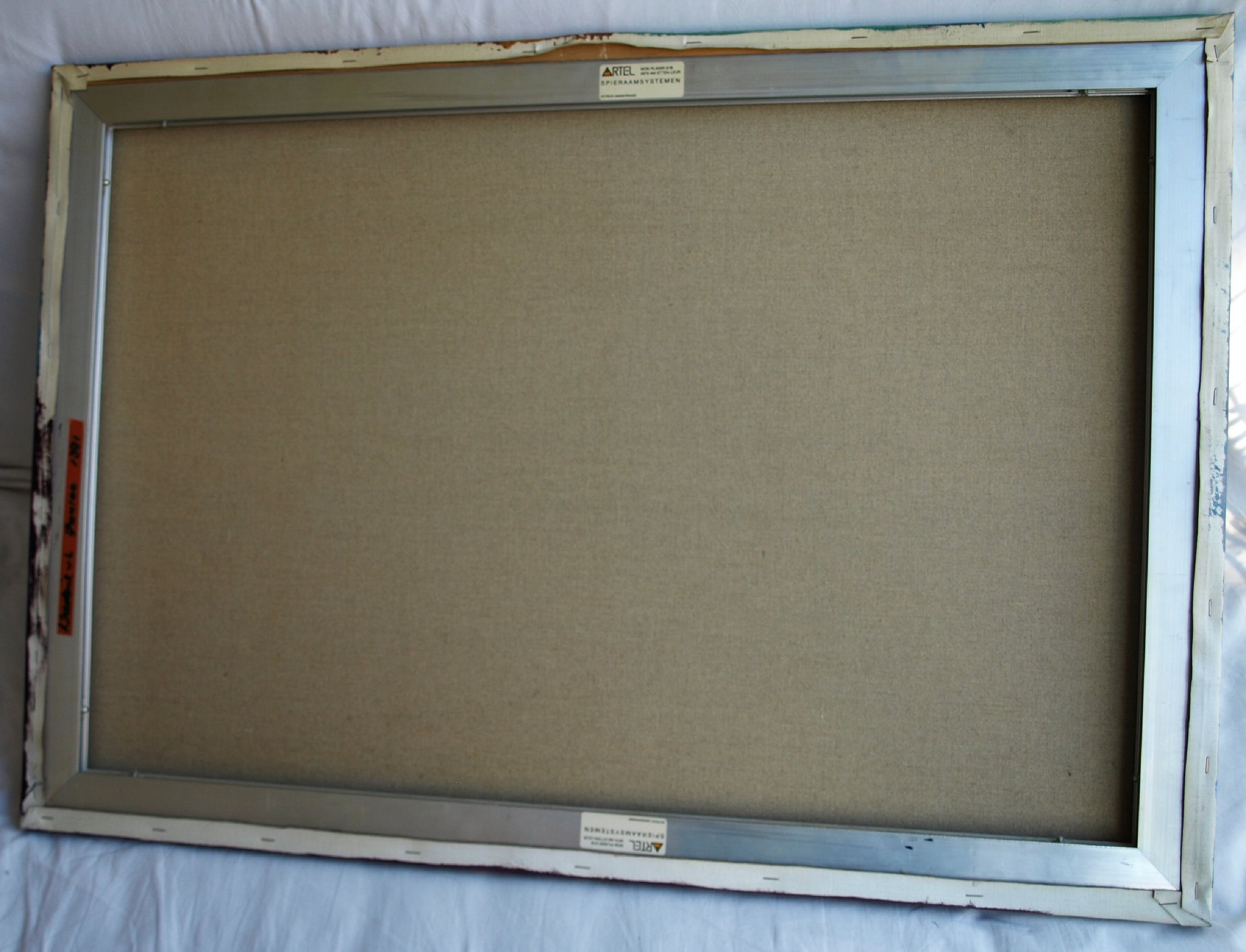 -Goed en strak opgespannen op een gedeeltelijk houten en metalen spieraamsysteem van Artel. De zijkanten zijn meegeschilderd en het werk is bedoeld om zo aan de muur te hangen.