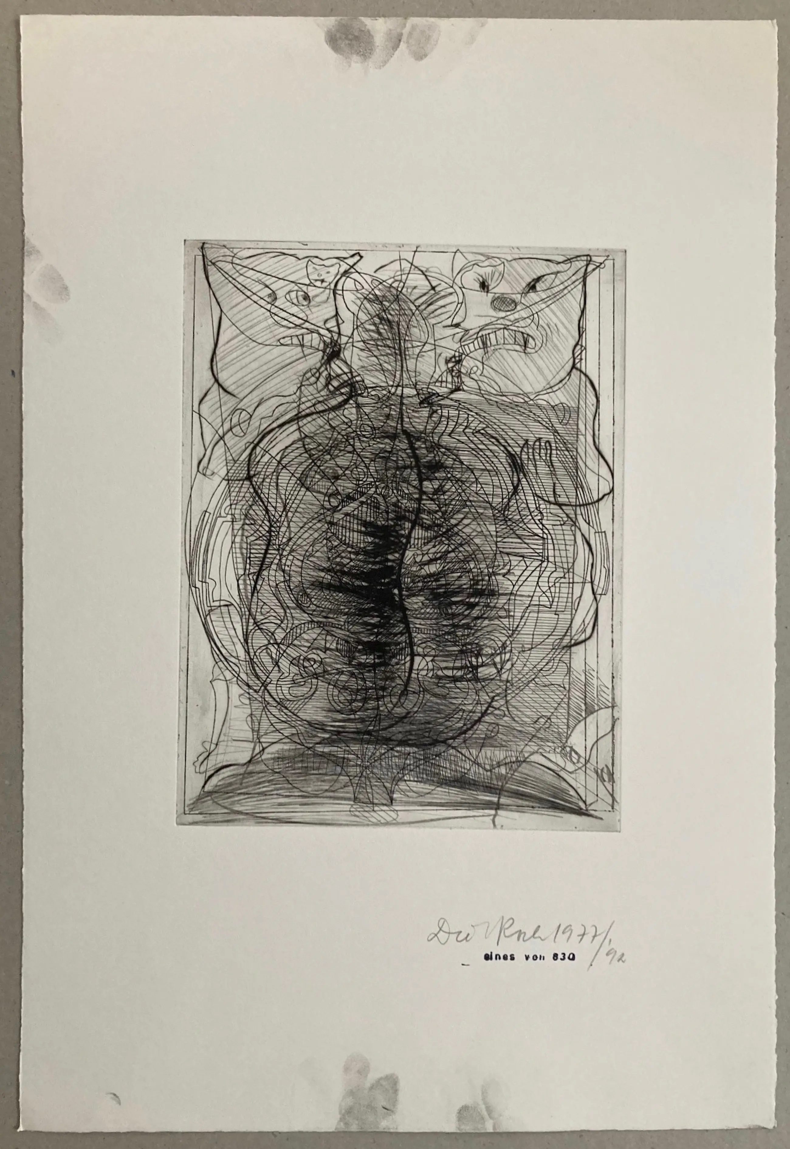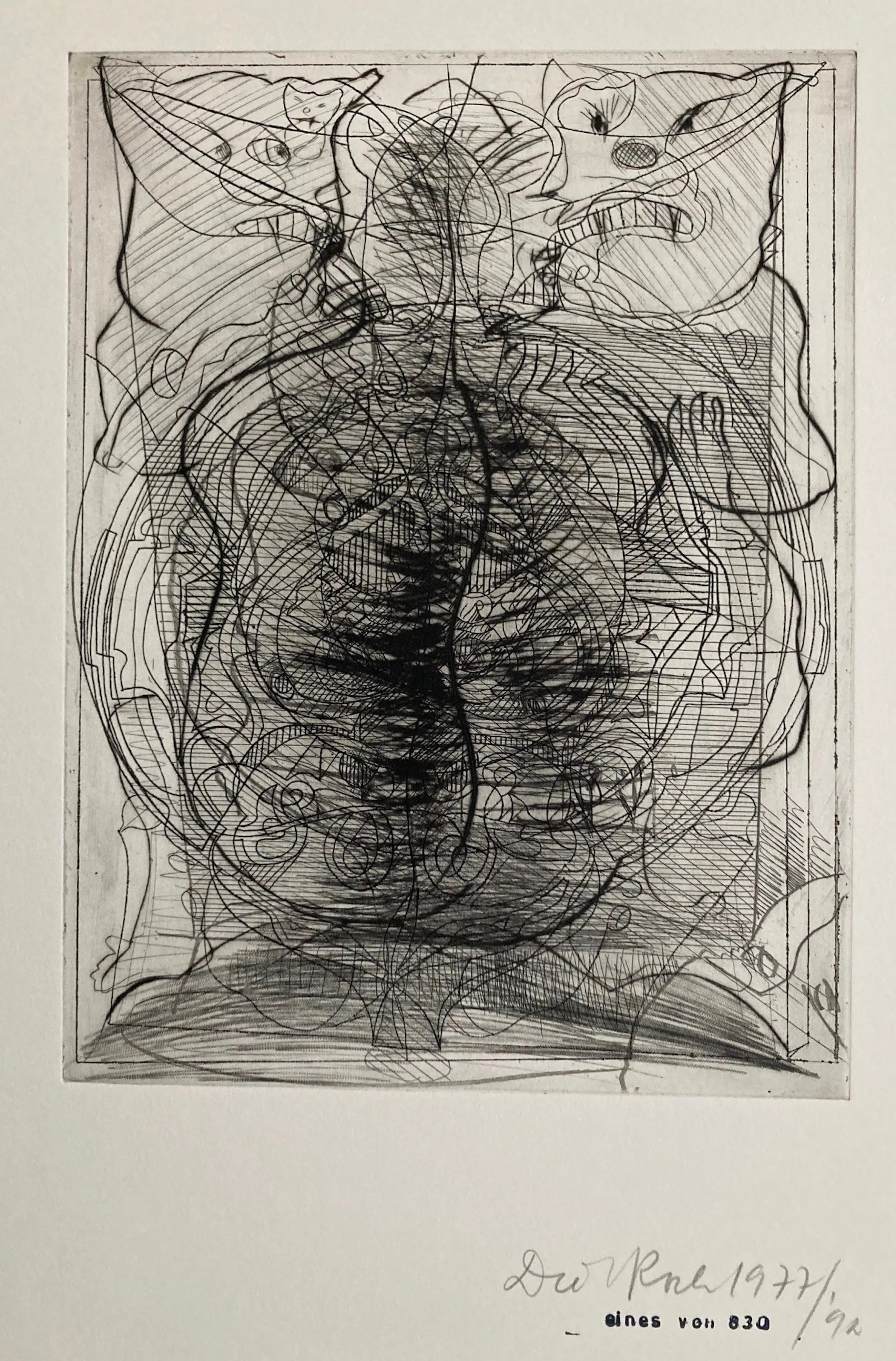 Gesigneerde originele ets met de verplichte vingerafdrukken van de internationaal belangrijke actie- en objectkunstenaar en belangrijke vertegenwoordiger van de concrete poëzie