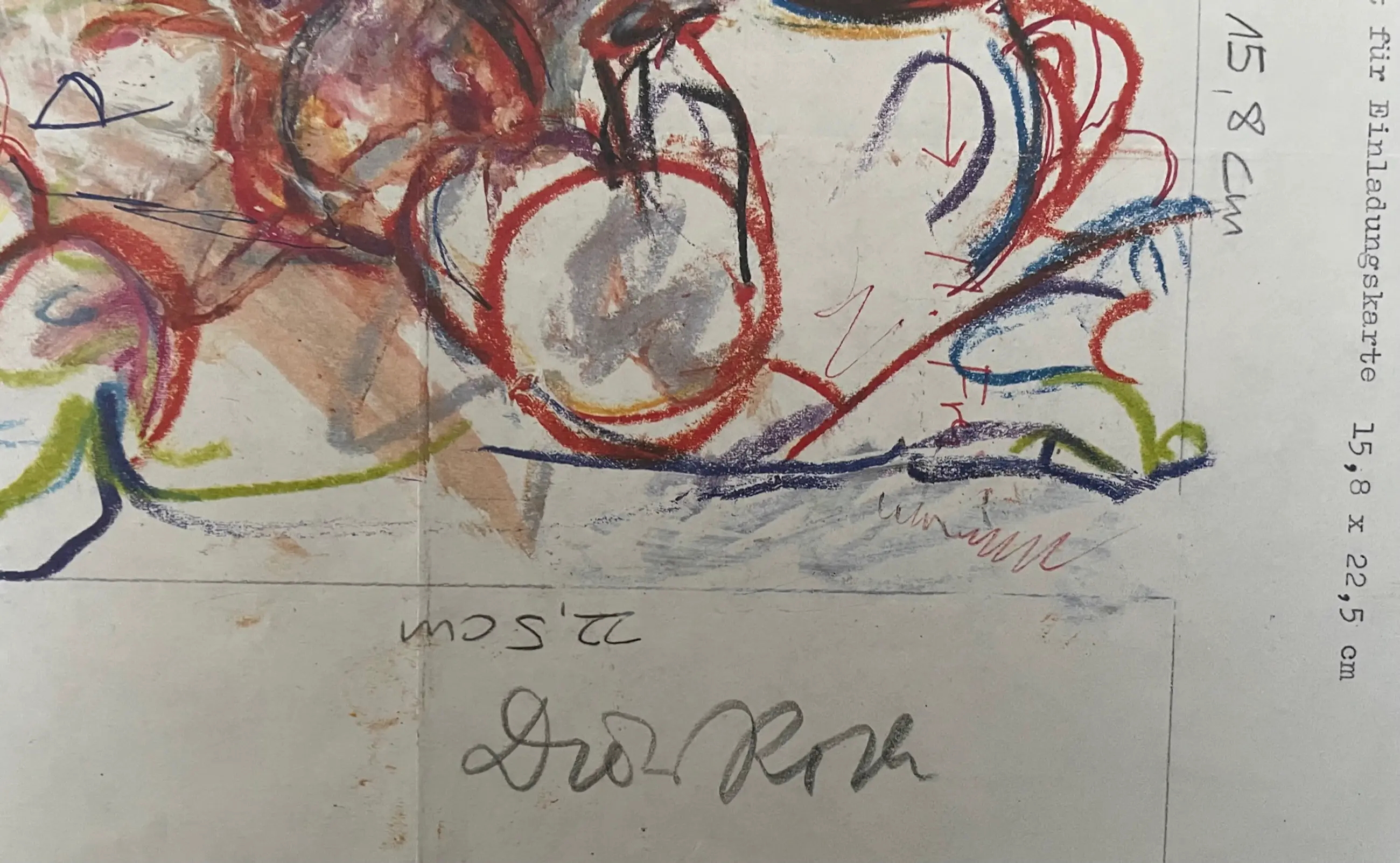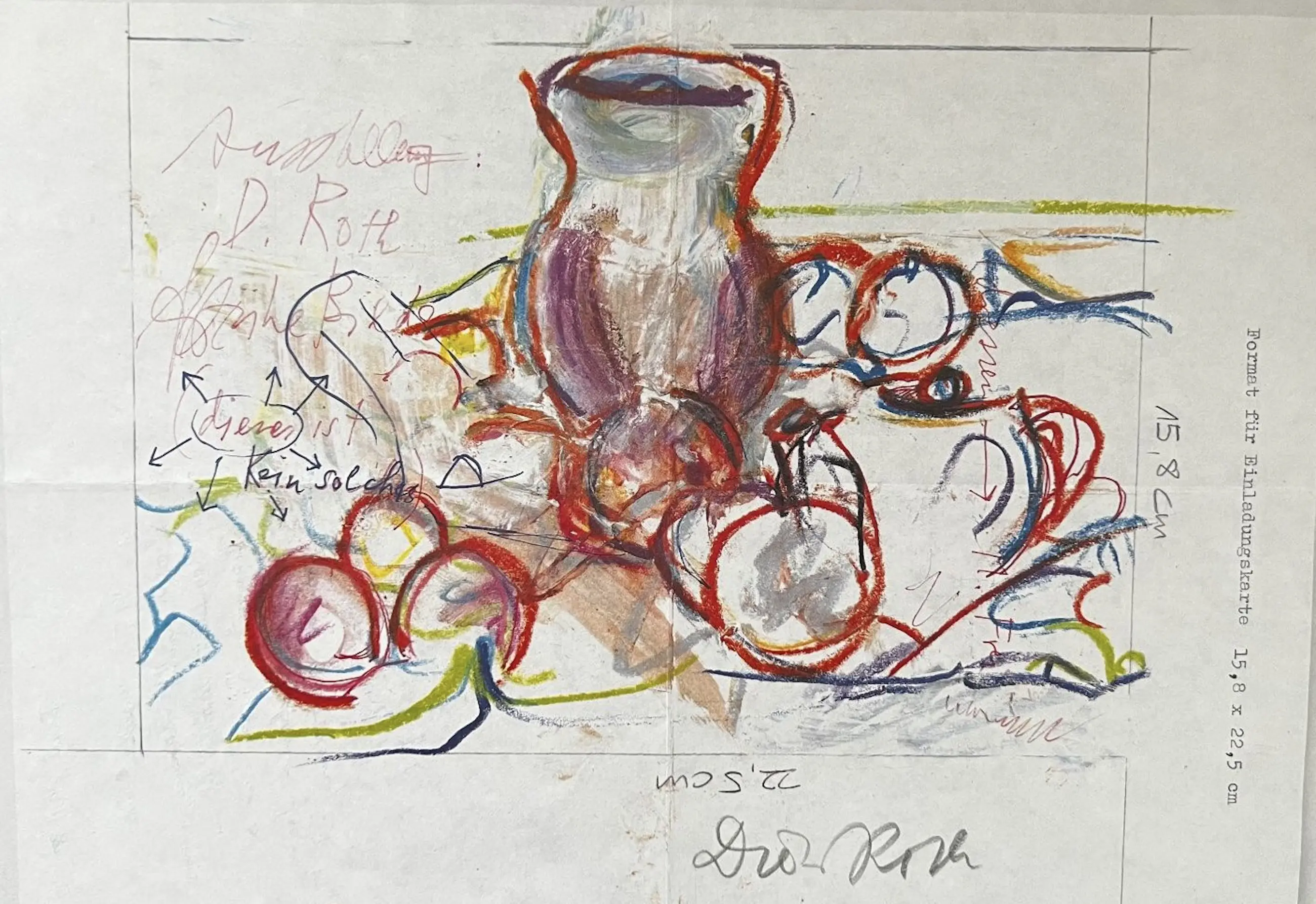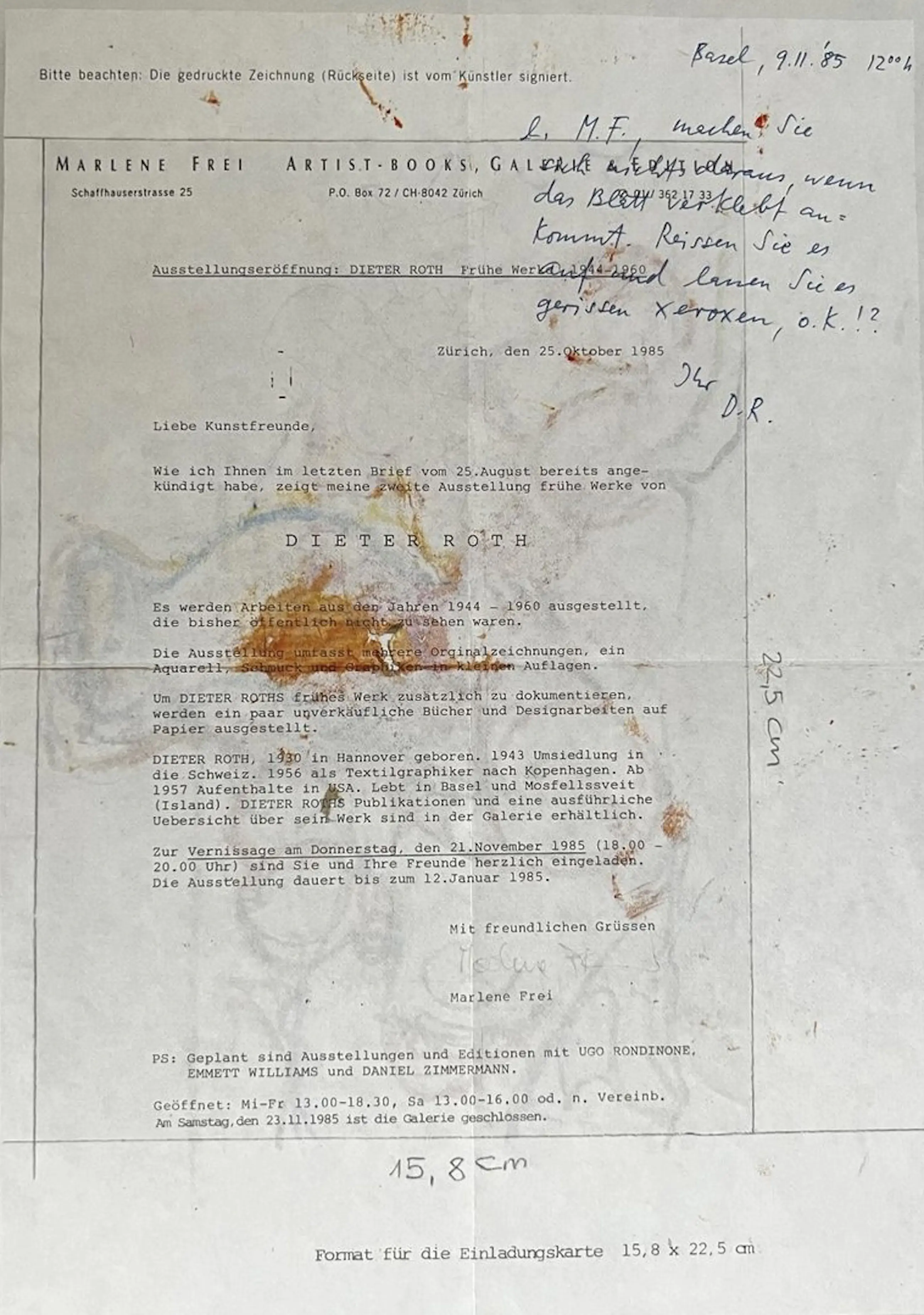 Bewijs van de uitnodigingskaart voor de tentoonstelling van Dieter Roth voor de galerie Marlene Frei Zürich 1985 gesigneerd Dubbel gevouwen zoals uitgegeven verso tekst van de uitnodigingskaart en handgeschreven notities door Dieter Roth 21x30cm Conditie: goed Voor zendingen vanuit Zwitserland kunnen douanekosten van toepassing zijn