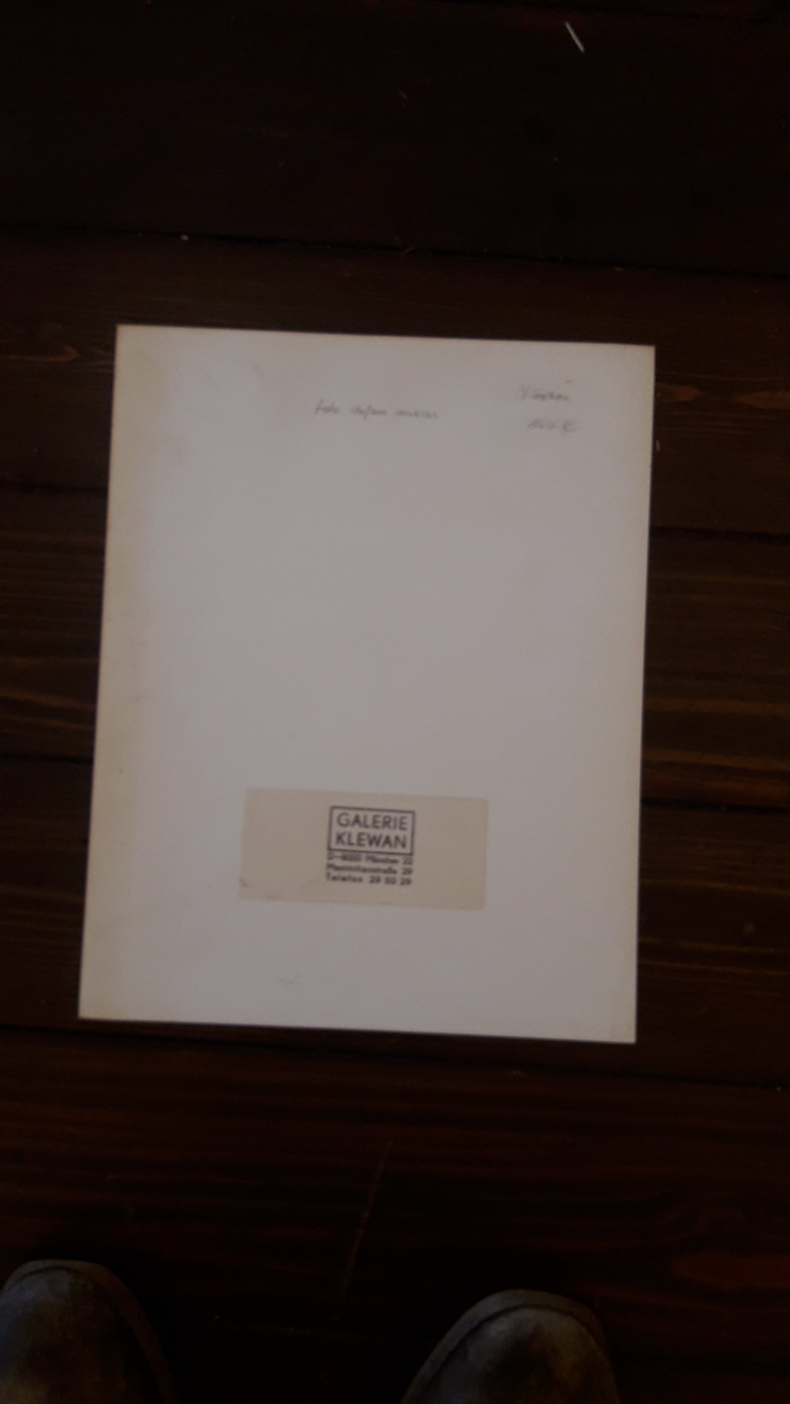 Persfoto van Dieter Roth Gemaakt door de Poolse fotograaf Stefan Moses. met potlood geschreven foto: stefan Moses Gemaakt tijdens een tentoonstelling van Dieter Roth bij Galerie Klewan. Linkerachterkant iets verkleurd De foto zelf in goede staat