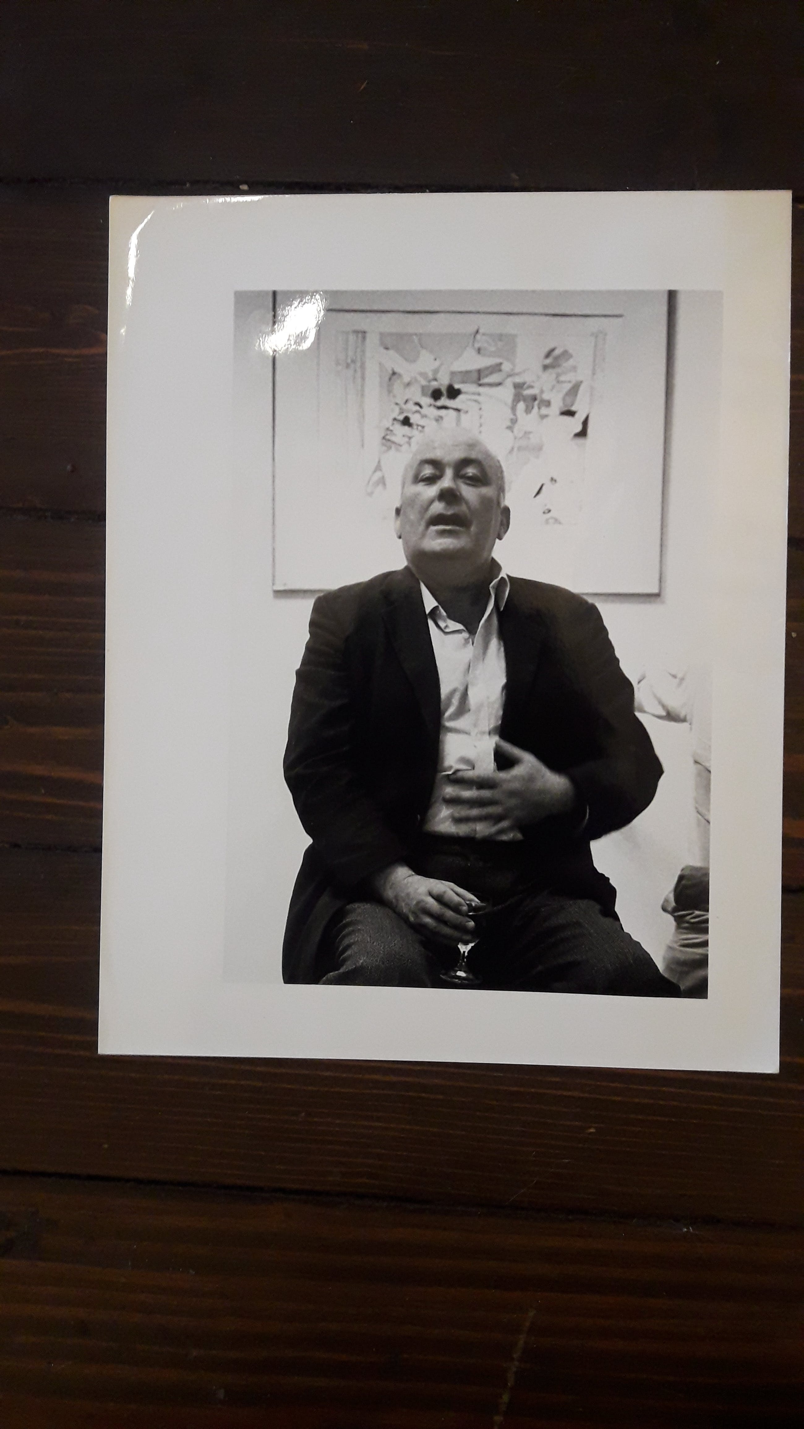Persfoto van Dieter Roth Gemaakt door de Poolse fotograaf Stefan Moses. met potlood geschreven foto: stefan Moses Gemaakt tijdens een tentoonstelling van Dieter Roth bij Galerie Klewan. Linkerachterkant iets verkleurd De foto zelf in goede staat
