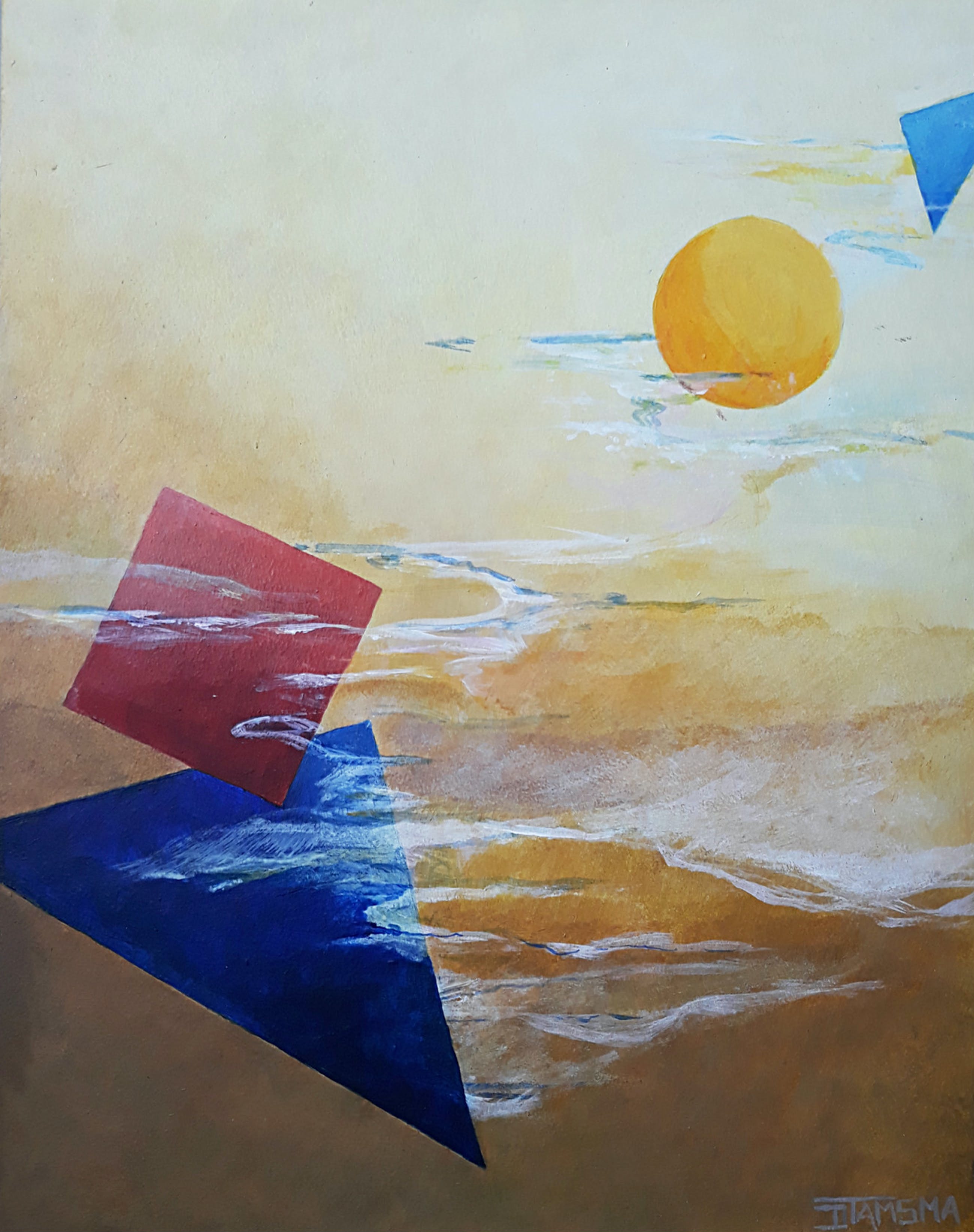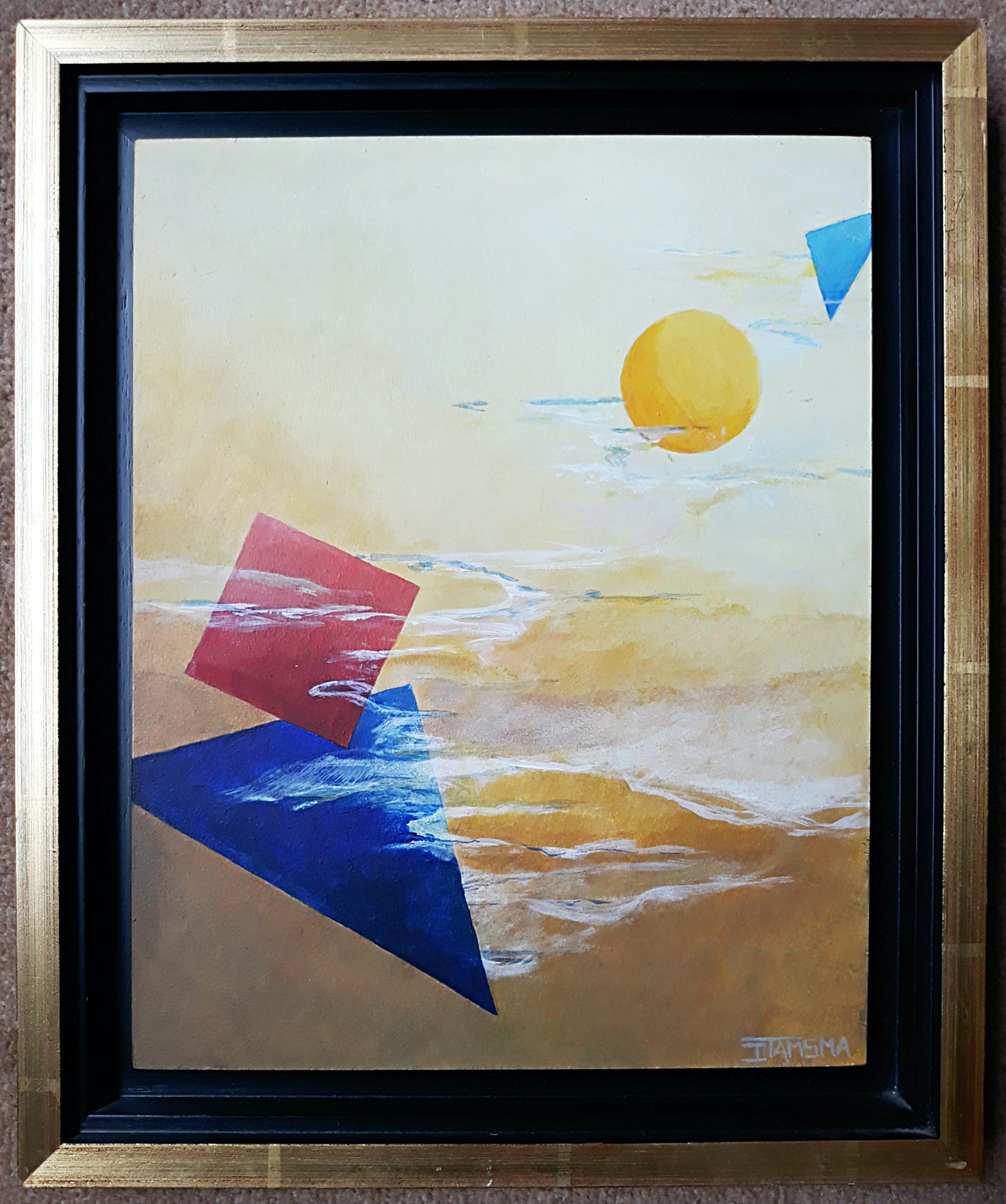 Leuk abstract werk van Dieuwke Tamsma. Acrylverf op paneel (board), gesigneerd rechtsonder. In mooi houten baklijstje. Alles in zeer goede conditie.