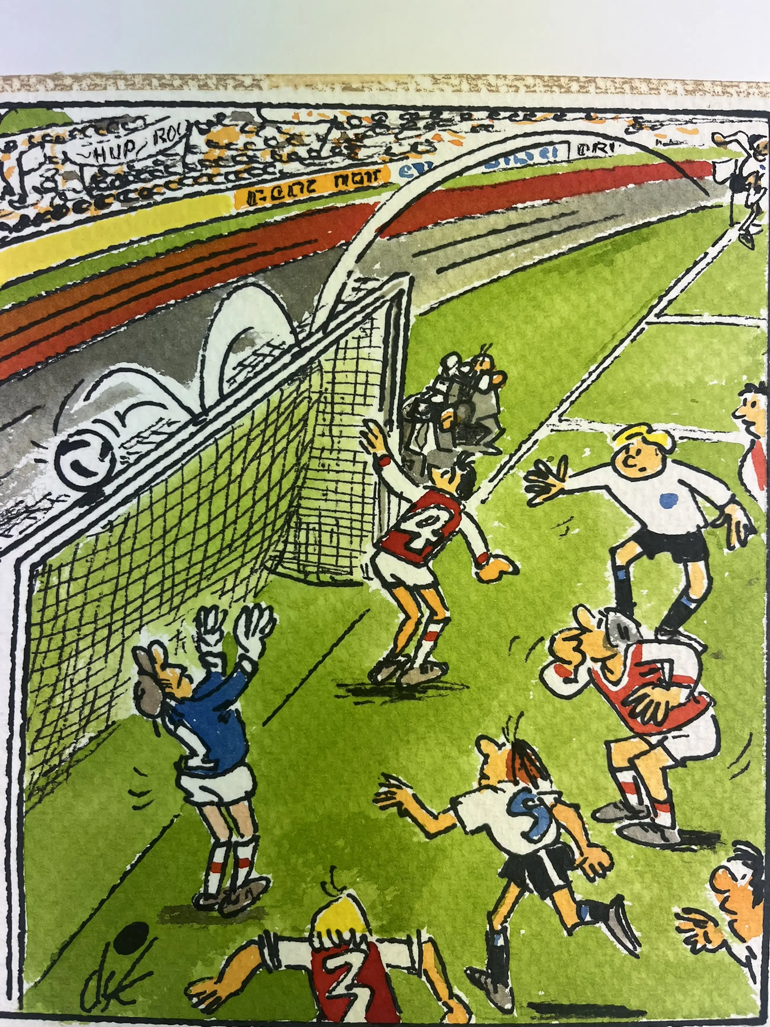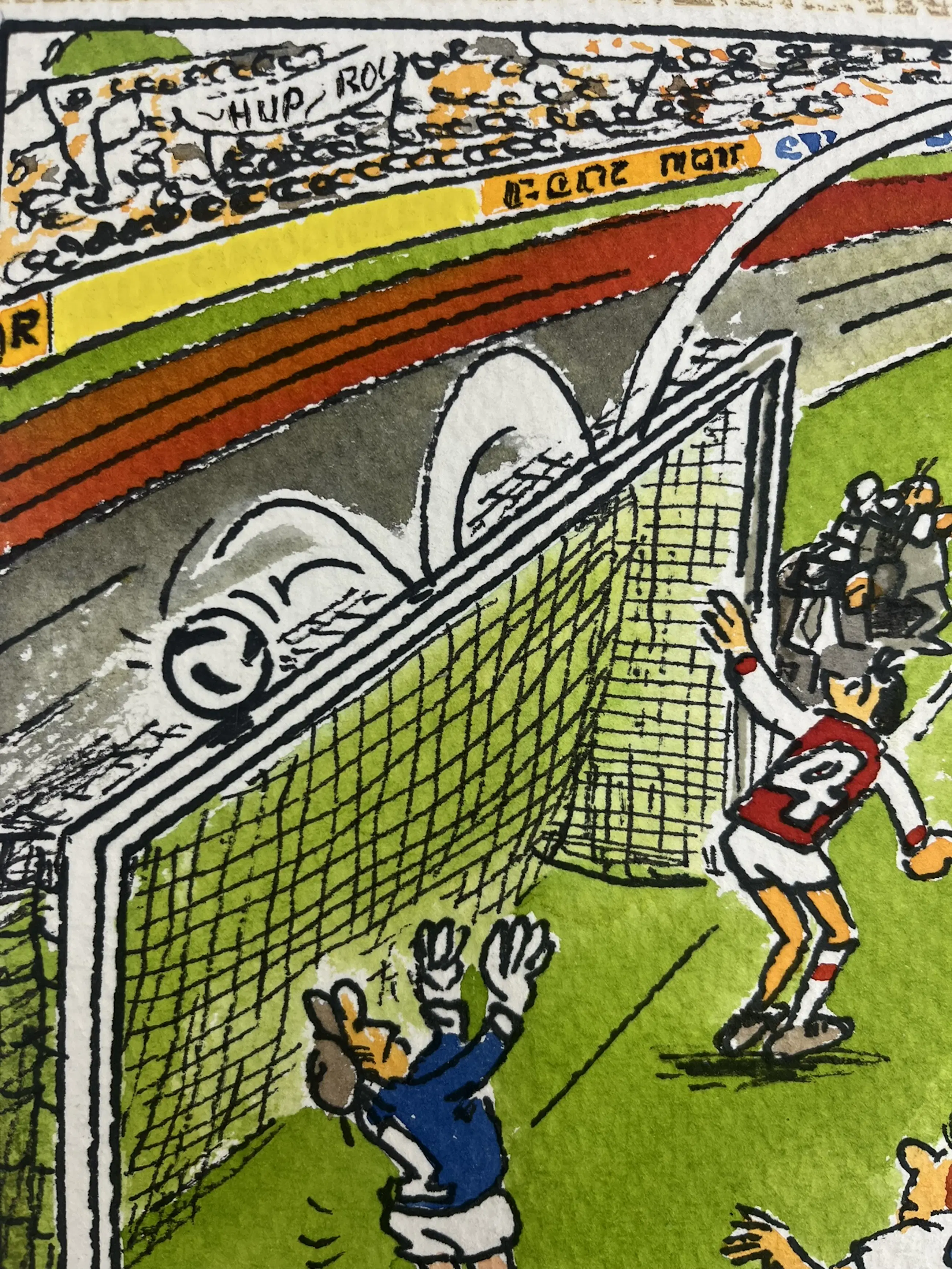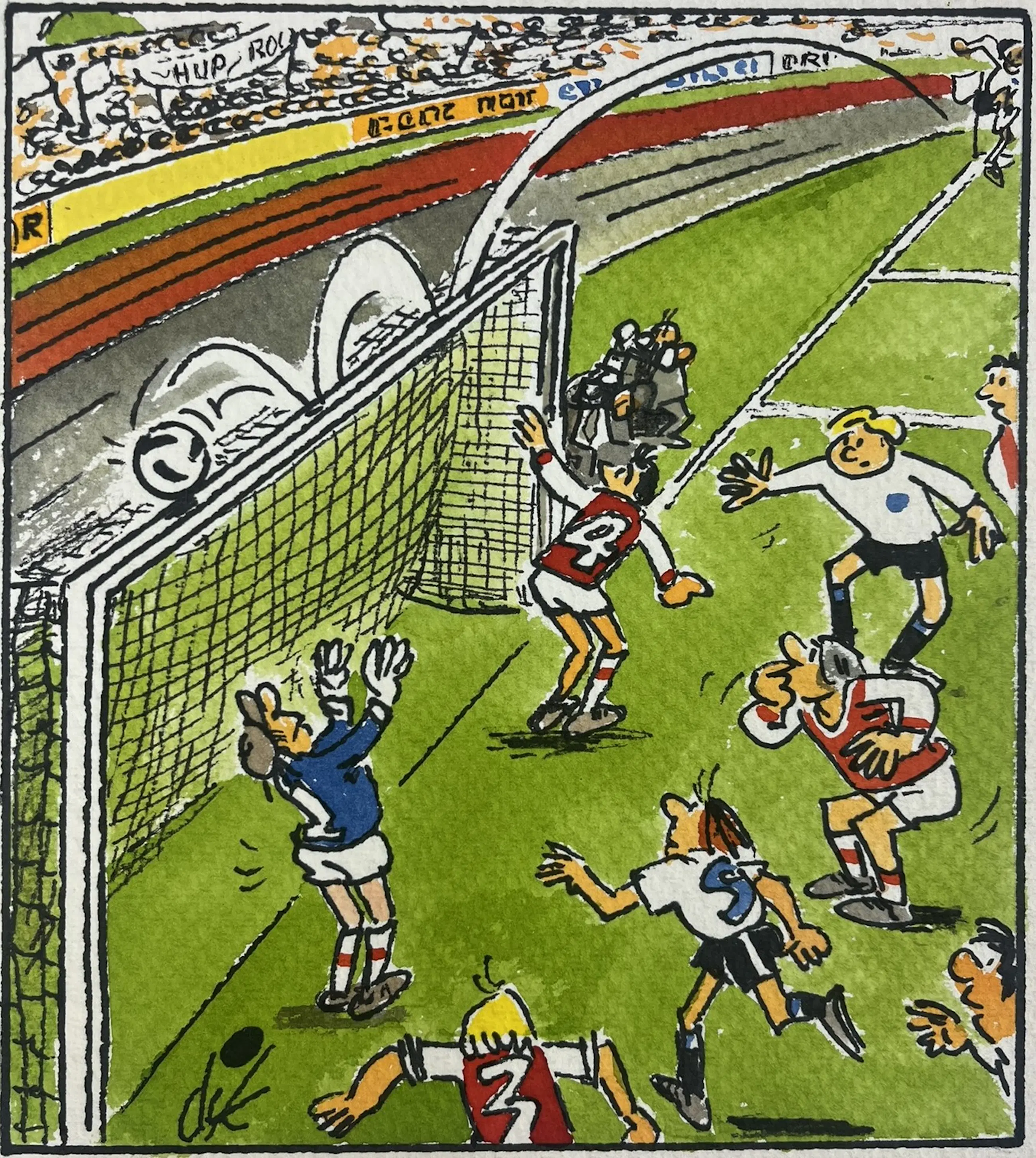 Dik Bruynesteyn - originele tekening 'Spanning en sensatie, de bal op de lat'