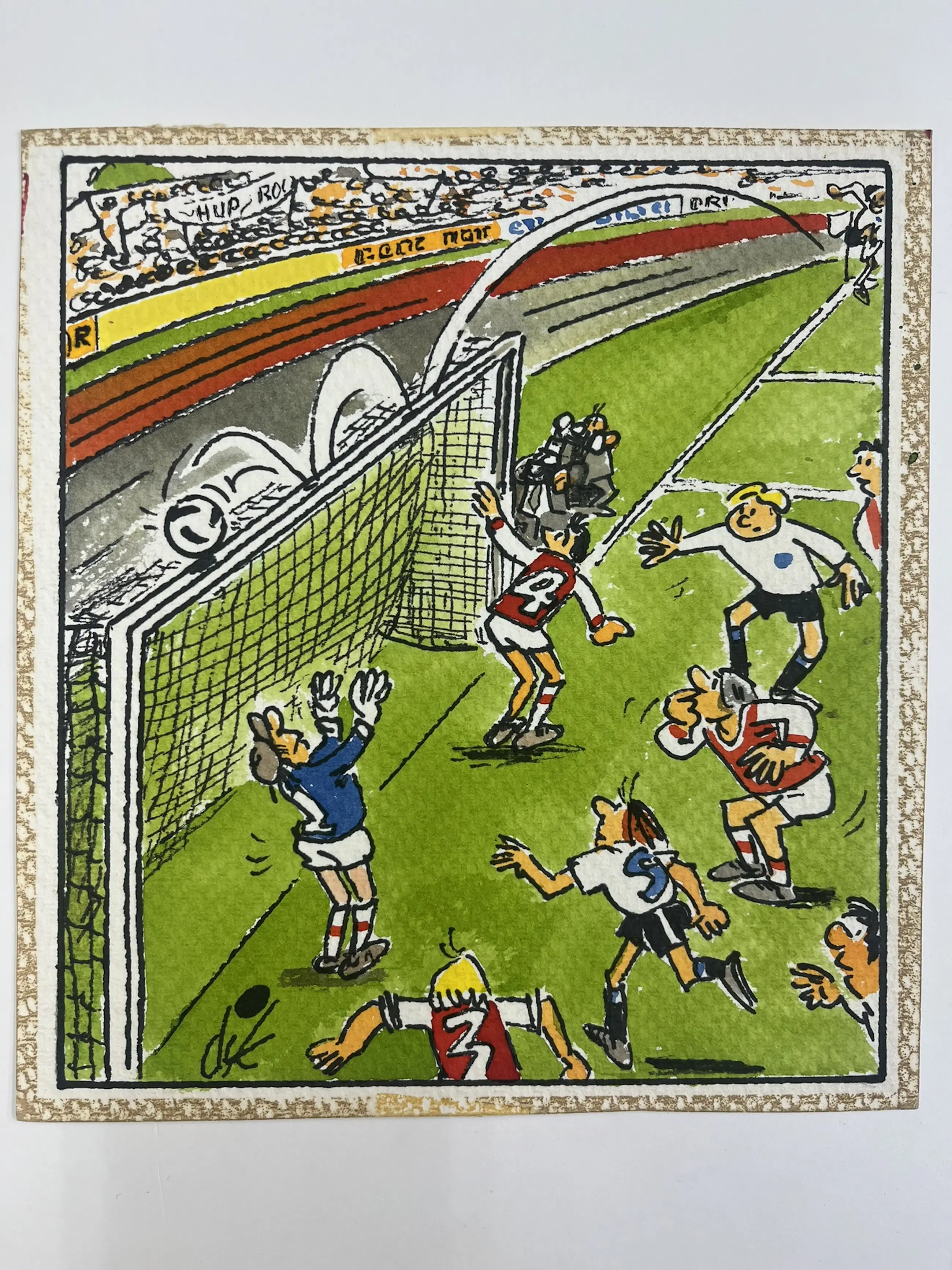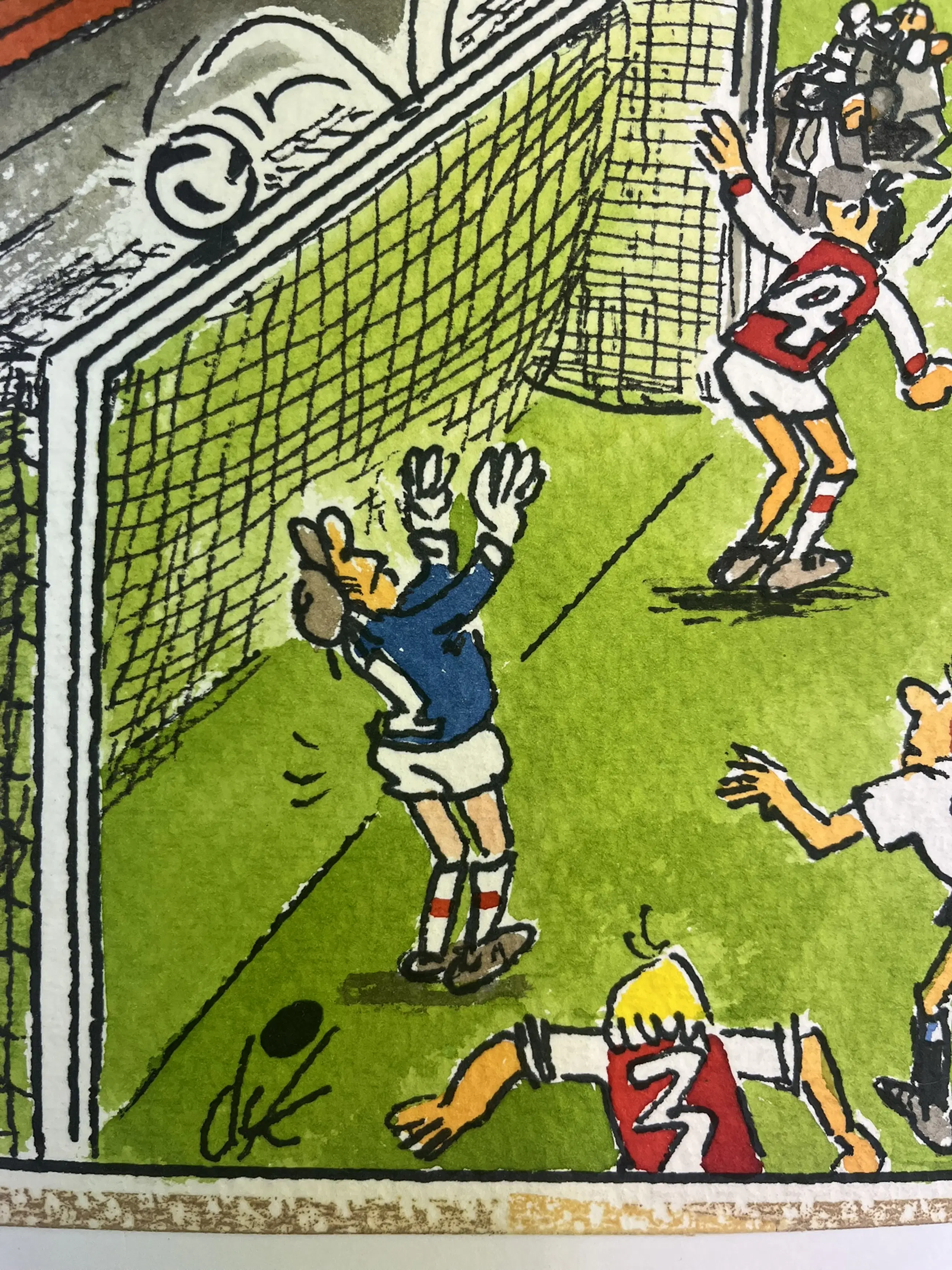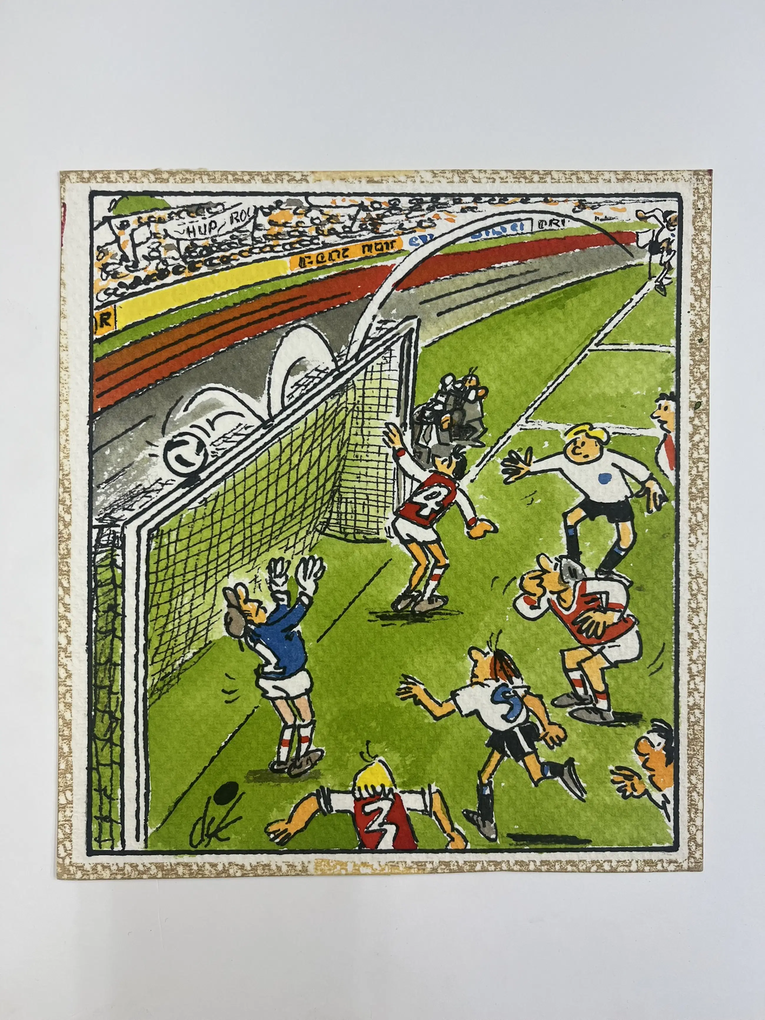 Dik Bruynesteyn - originele tekening 'Spanning en sensatie, de bal op de lat'