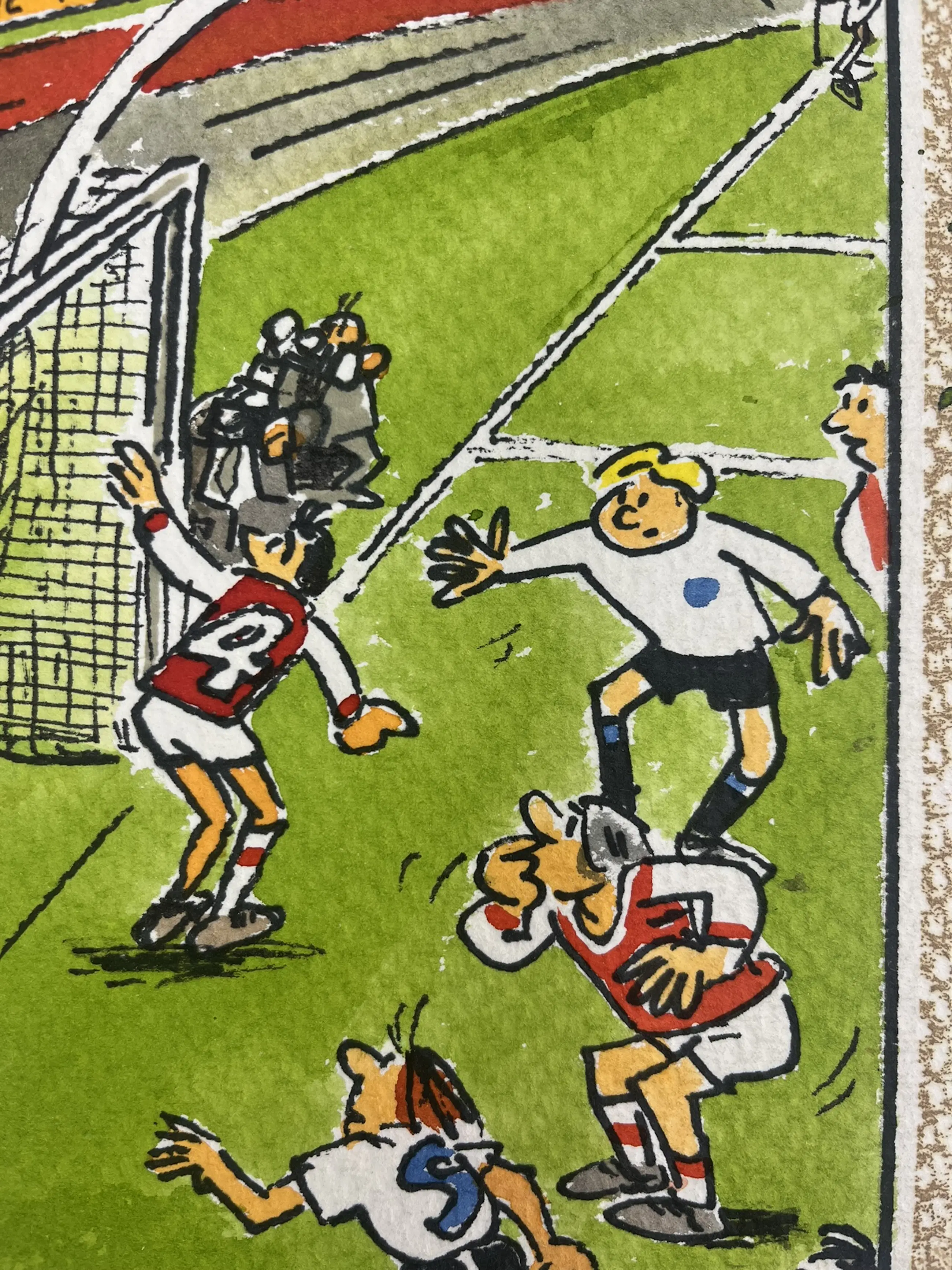 Originele tekening voor één van de voetbalstrips door Dik Bruynesteyn.