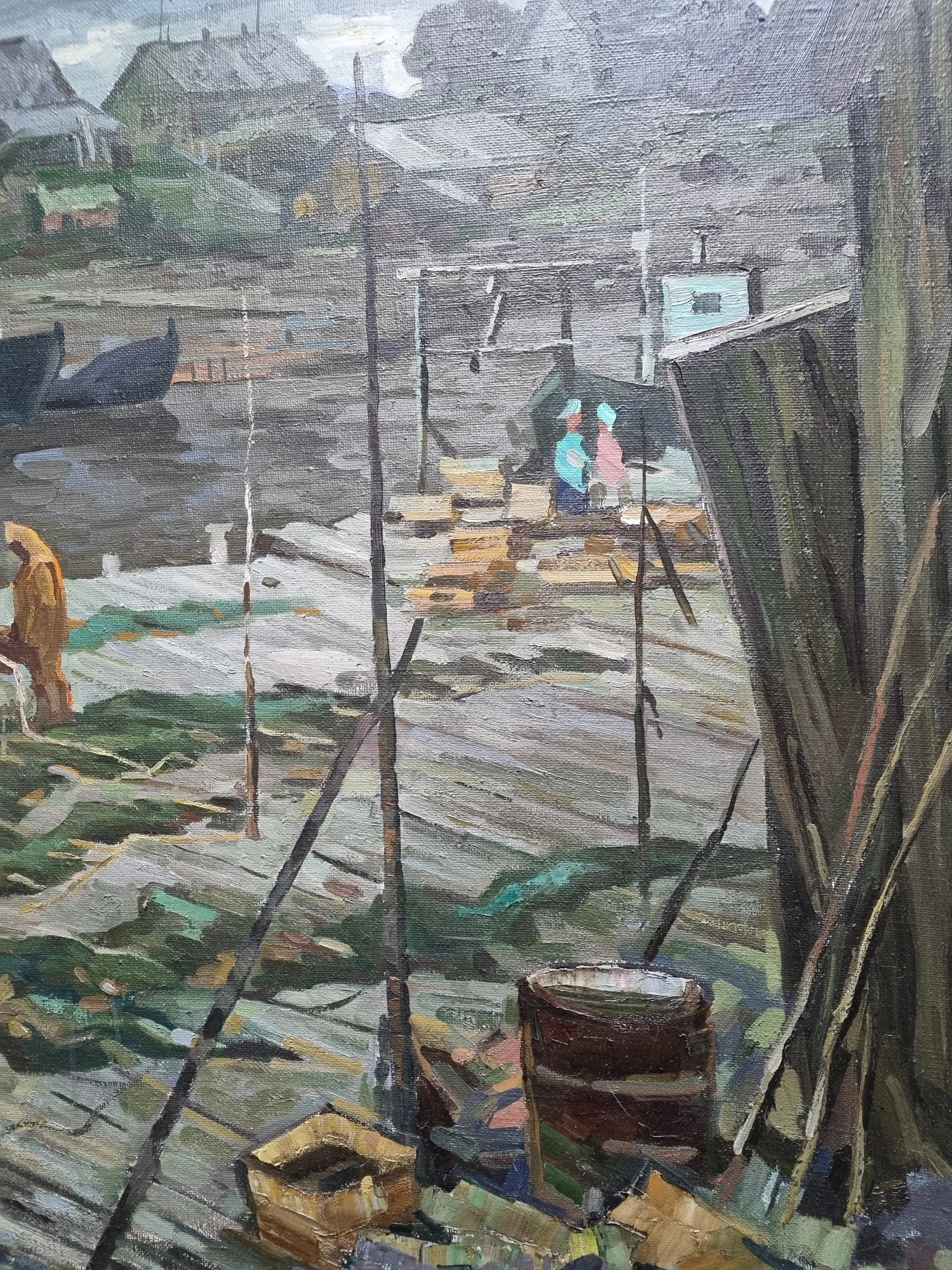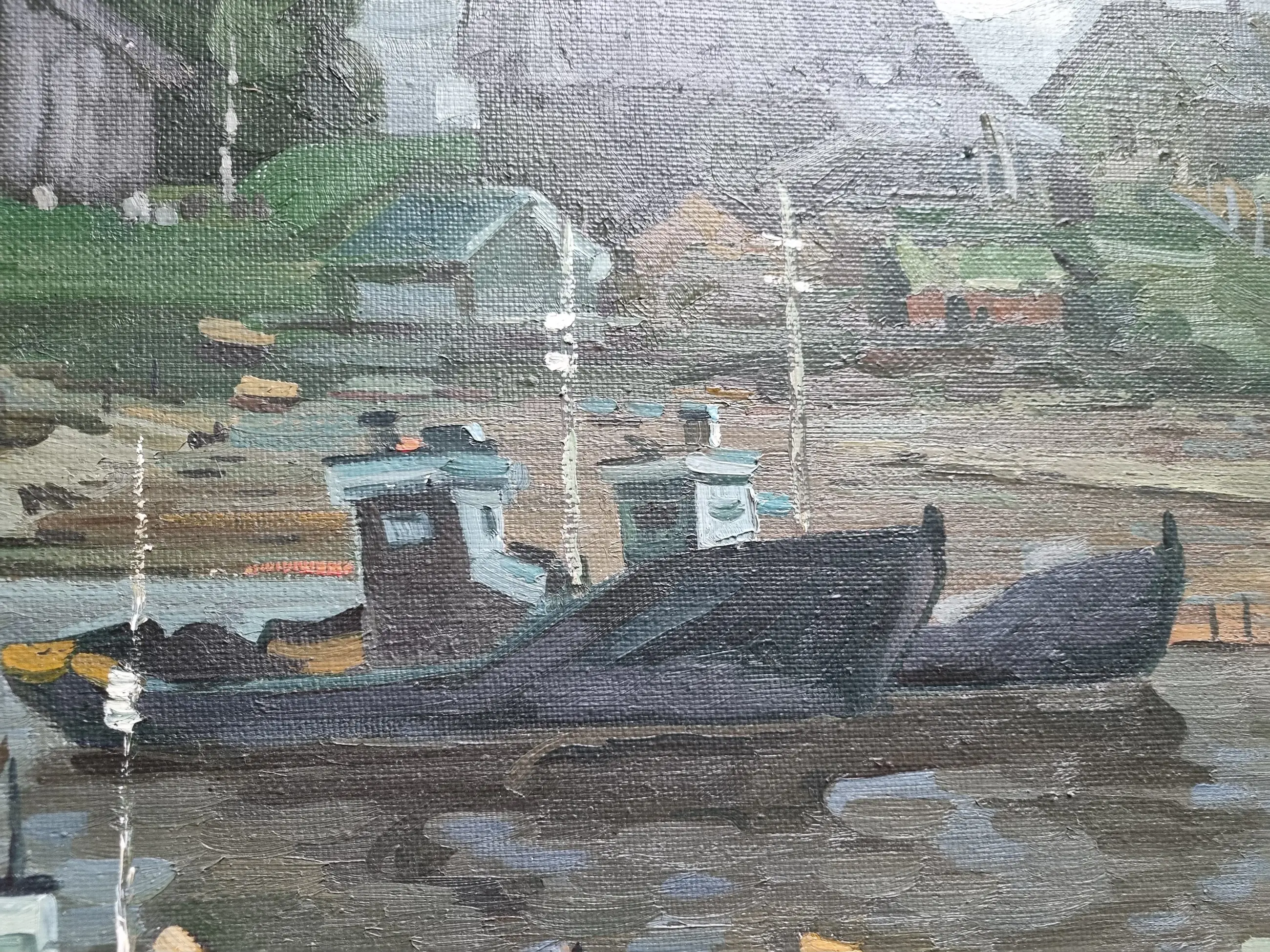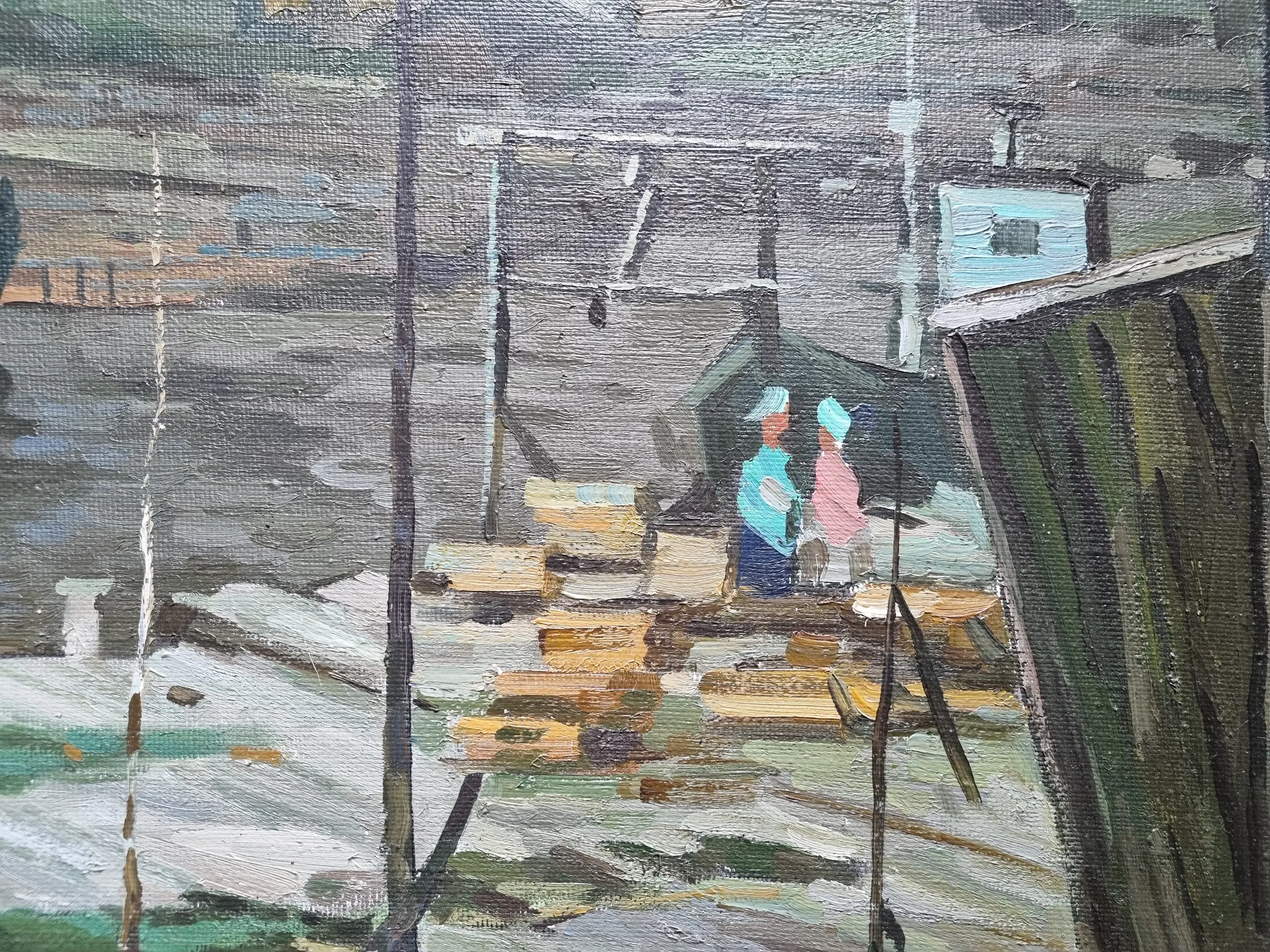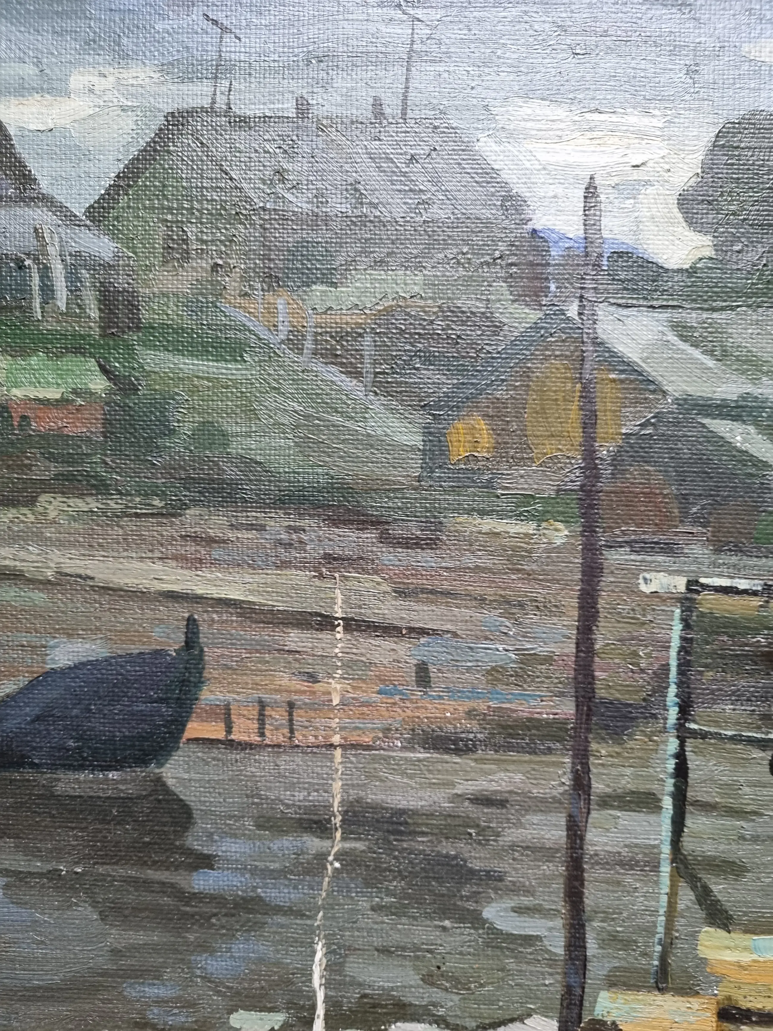 Typerend werk van Dimitri Vorontzov (1931). Afgebeeld is een noordelijk Russische haven, waarschijnlijk Moermansk. De grauwe werkelijkheid van deze streken wordt door Vorontzov sterk neergezet. Gesigneerd aan achterzijde, zoals gebruikelijk bij veel Russische kunstenaars.
