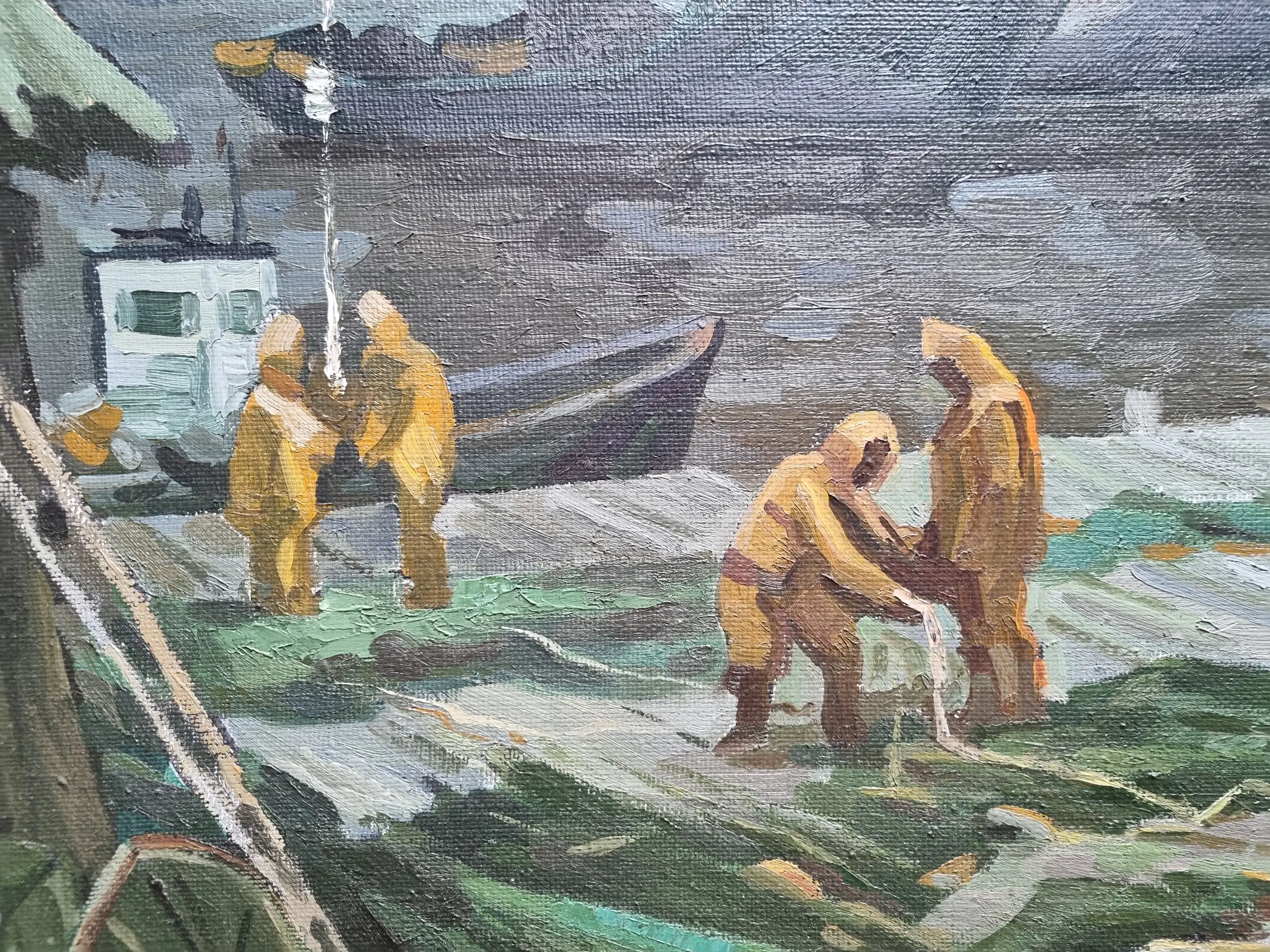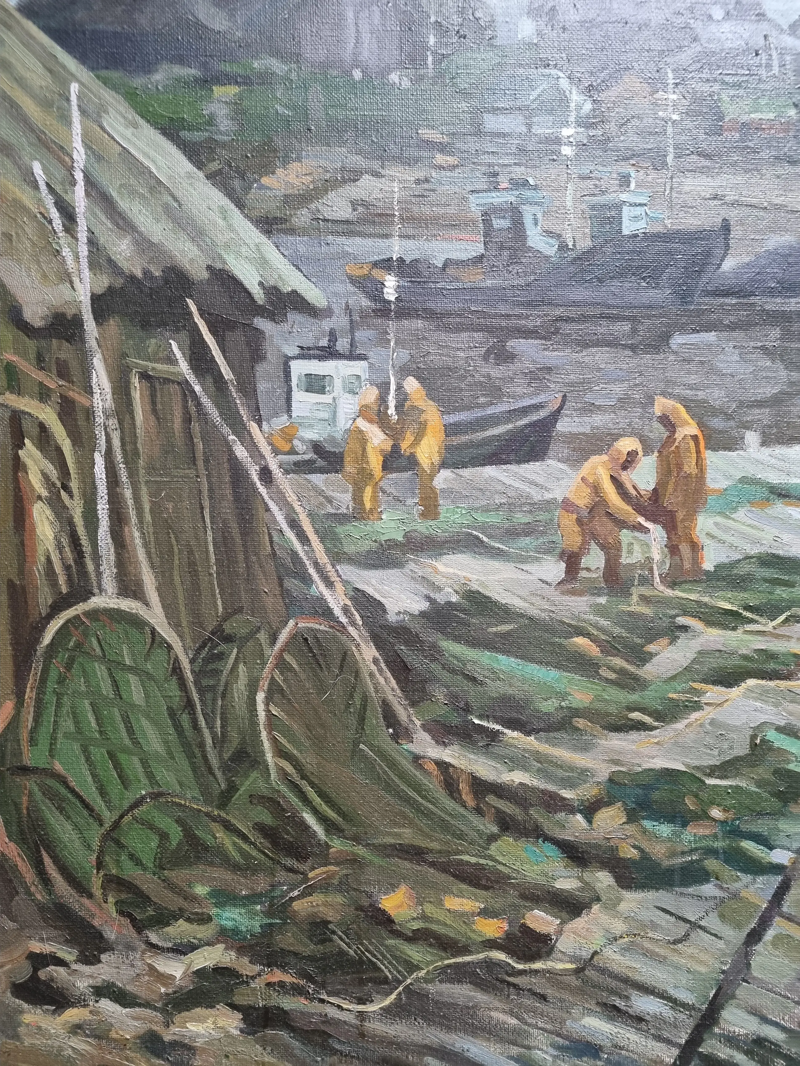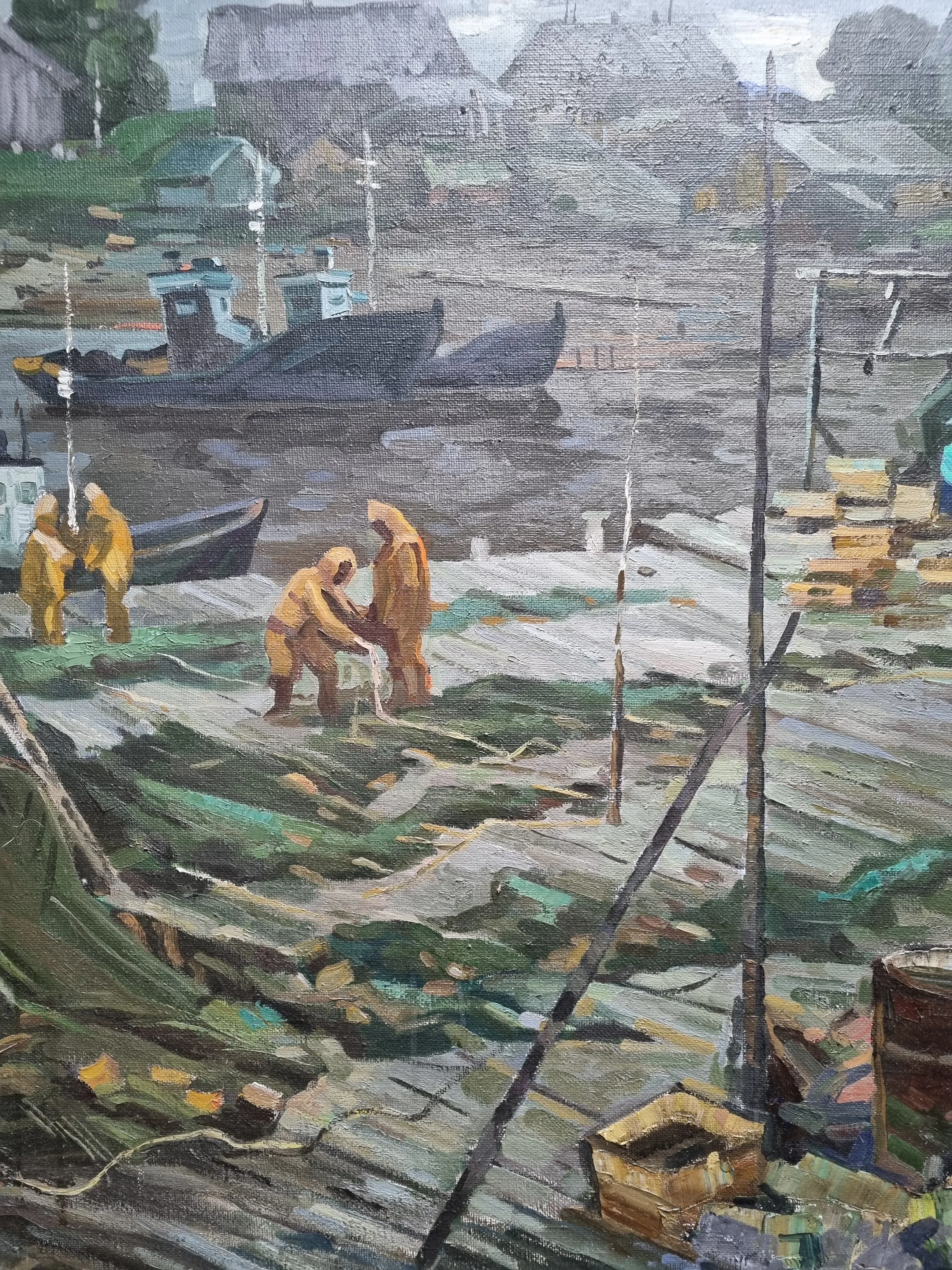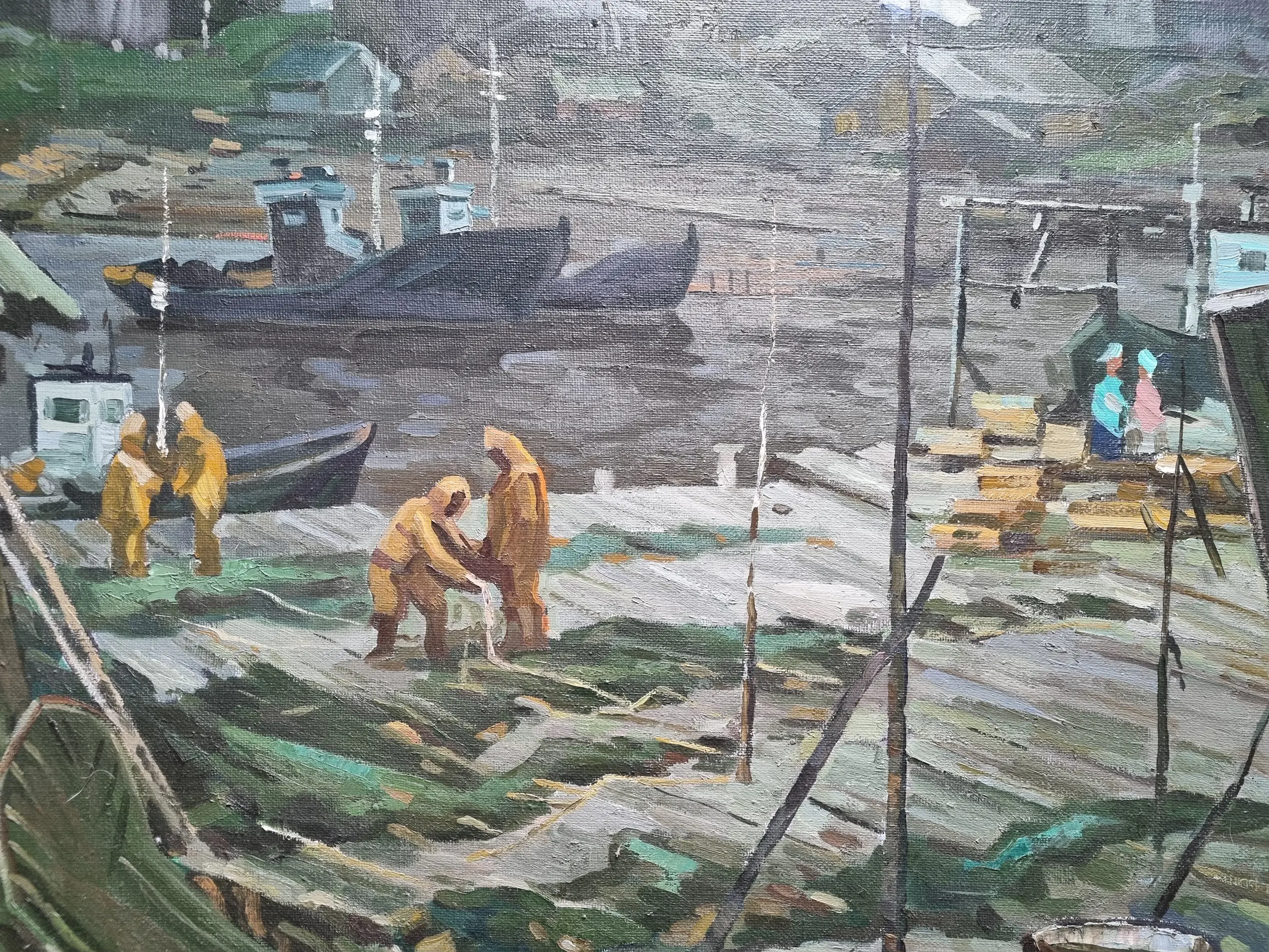 Typerend werk van Dimitri Vorontzov (1931). Afgebeeld is een noordelijk Russische haven, waarschijnlijk Moermansk. De grauwe werkelijkheid van deze streken wordt door Vorontzov sterk neergezet. Gesigneerd aan achterzijde, zoals gebruikelijk bij veel Russische kunstenaars.