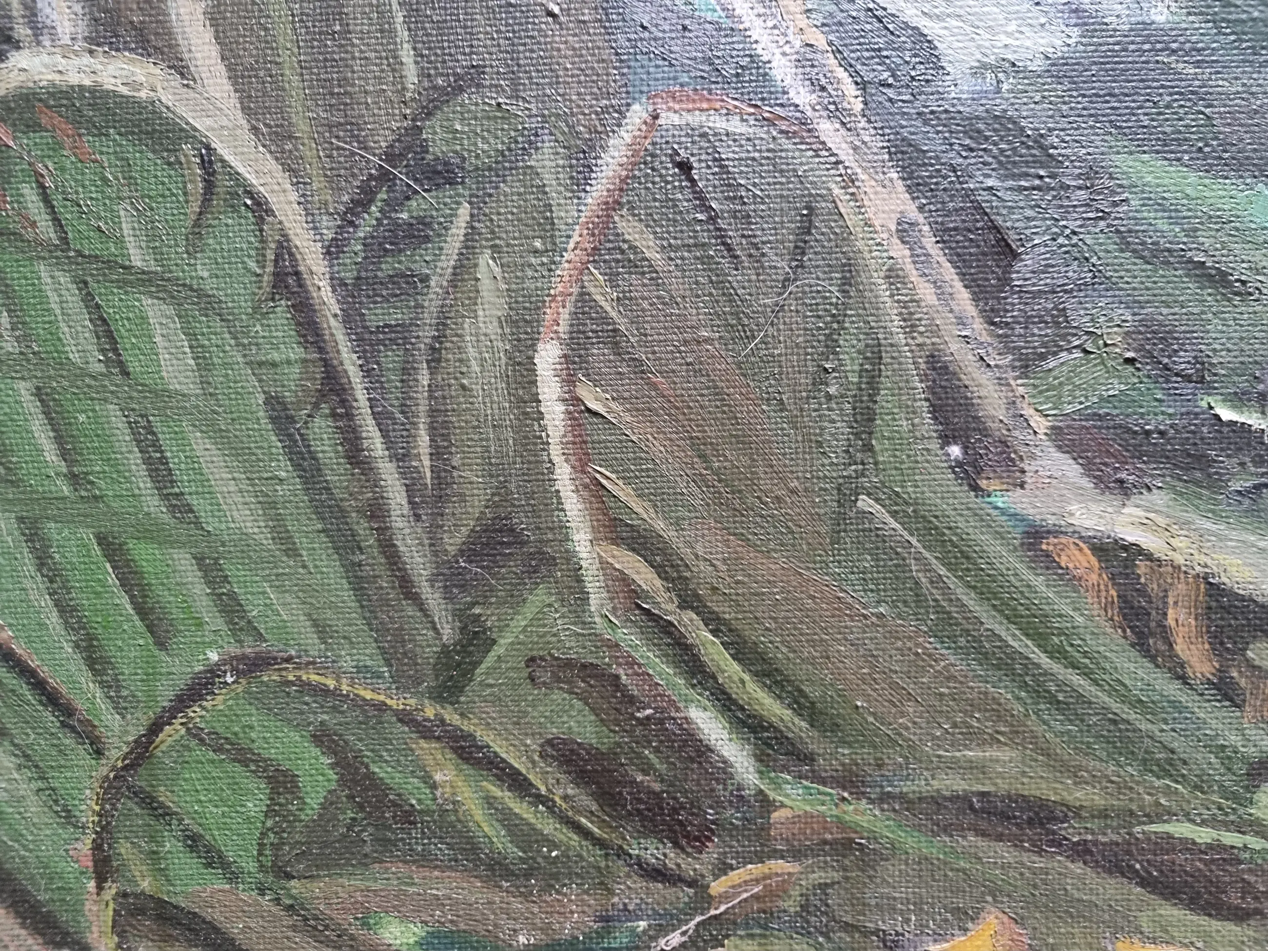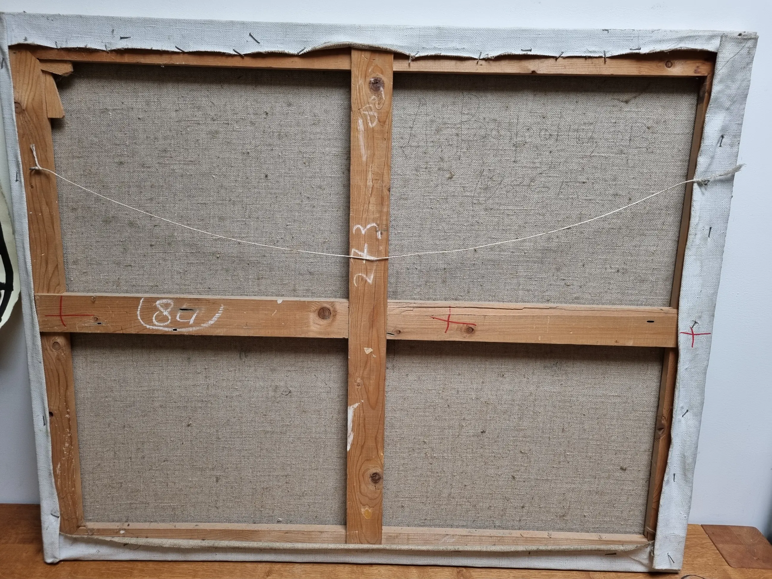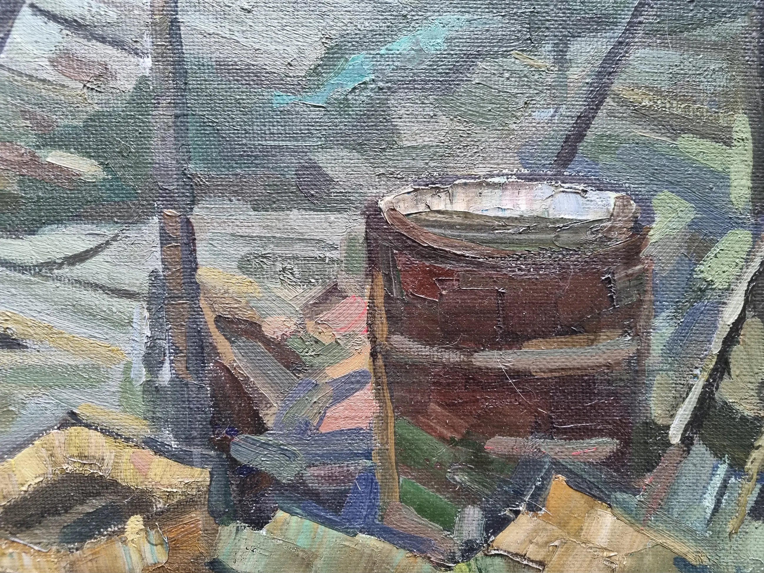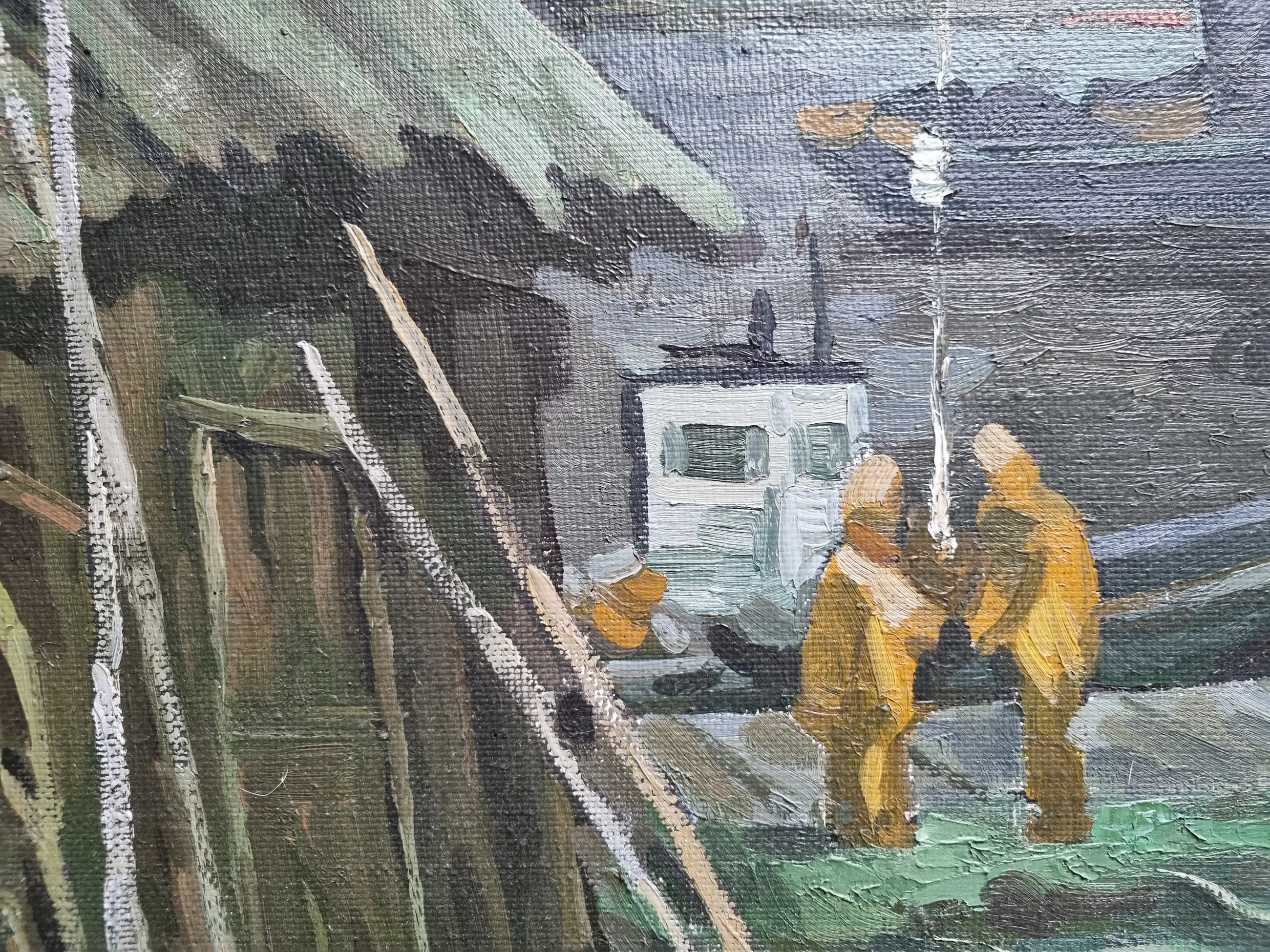 Typerend werk van Dimitri Vorontzov (1931). Afgebeeld is een noordelijk Russische haven, waarschijnlijk Moermansk. De grauwe werkelijkheid van deze streken wordt door Vorontzov sterk neergezet. Gesigneerd aan achterzijde, zoals gebruikelijk bij veel Russische kunstenaars.