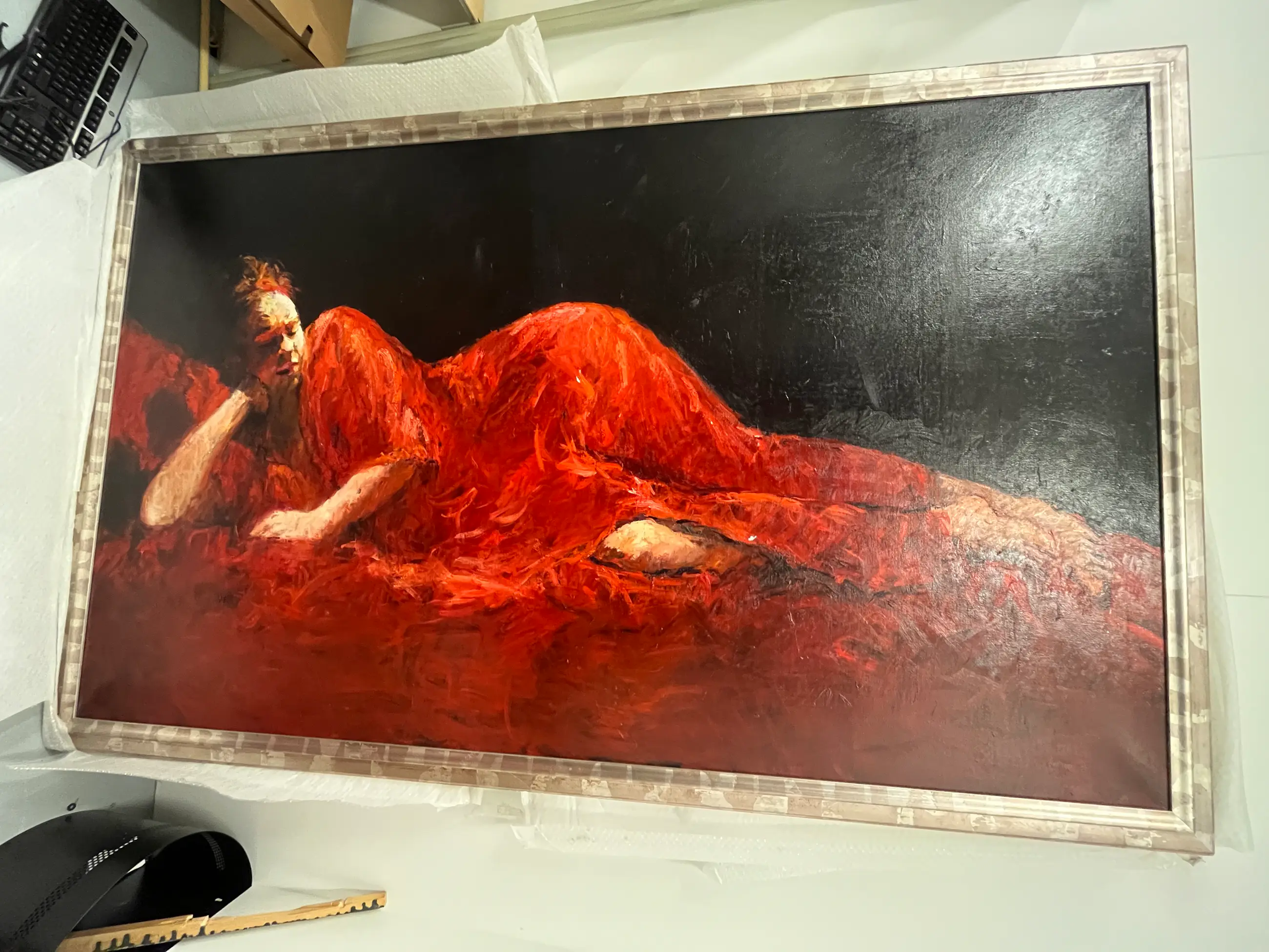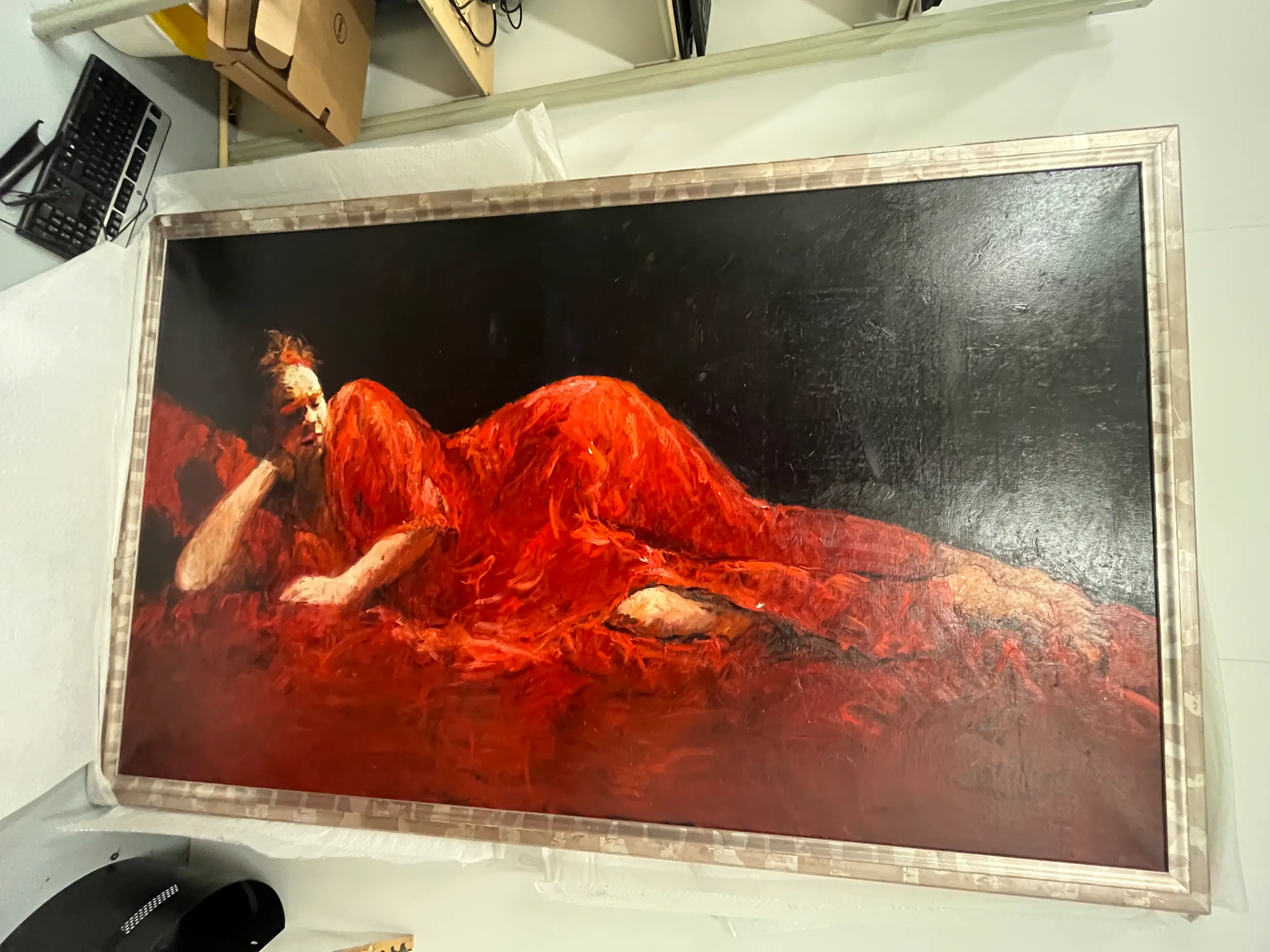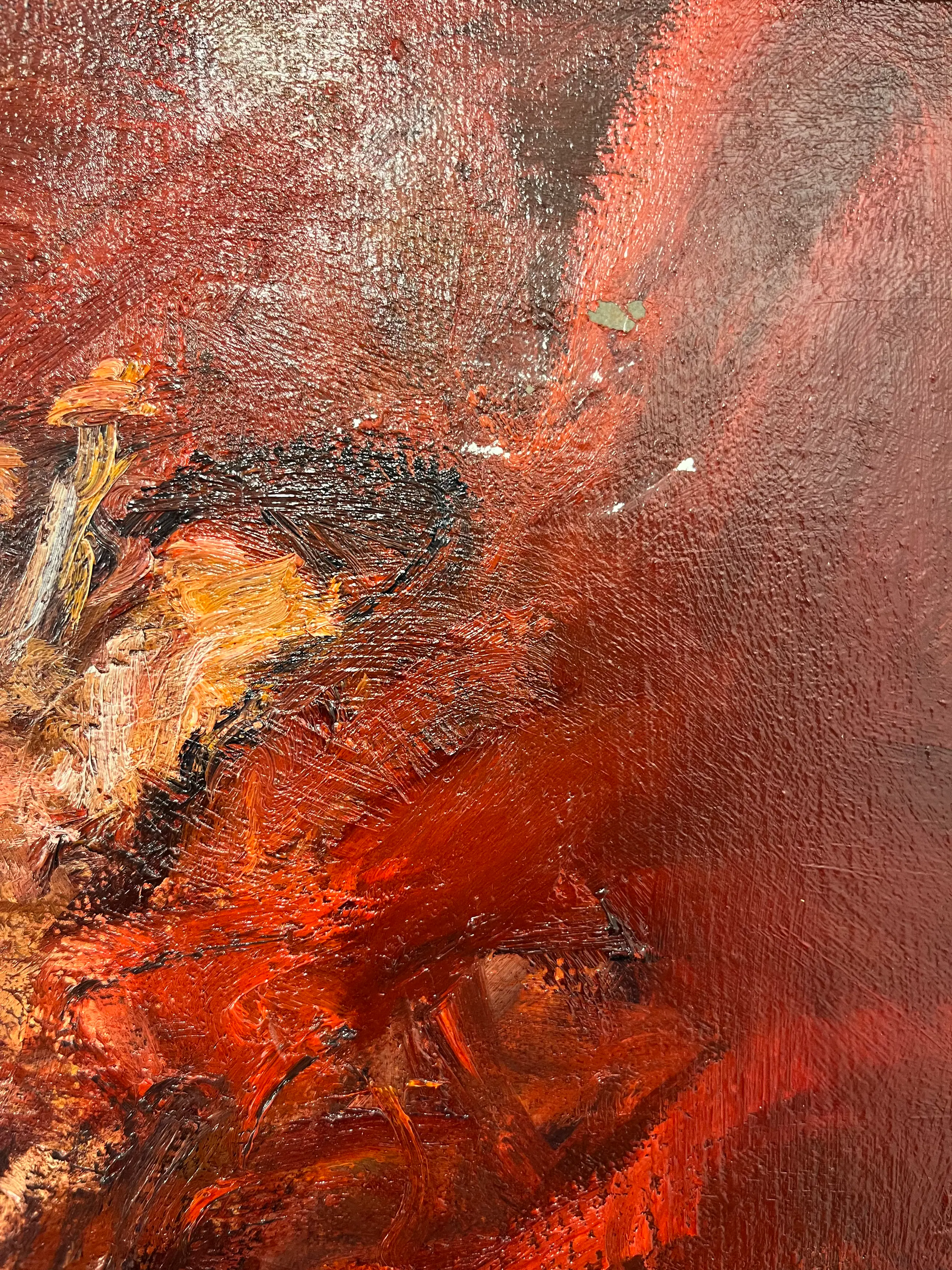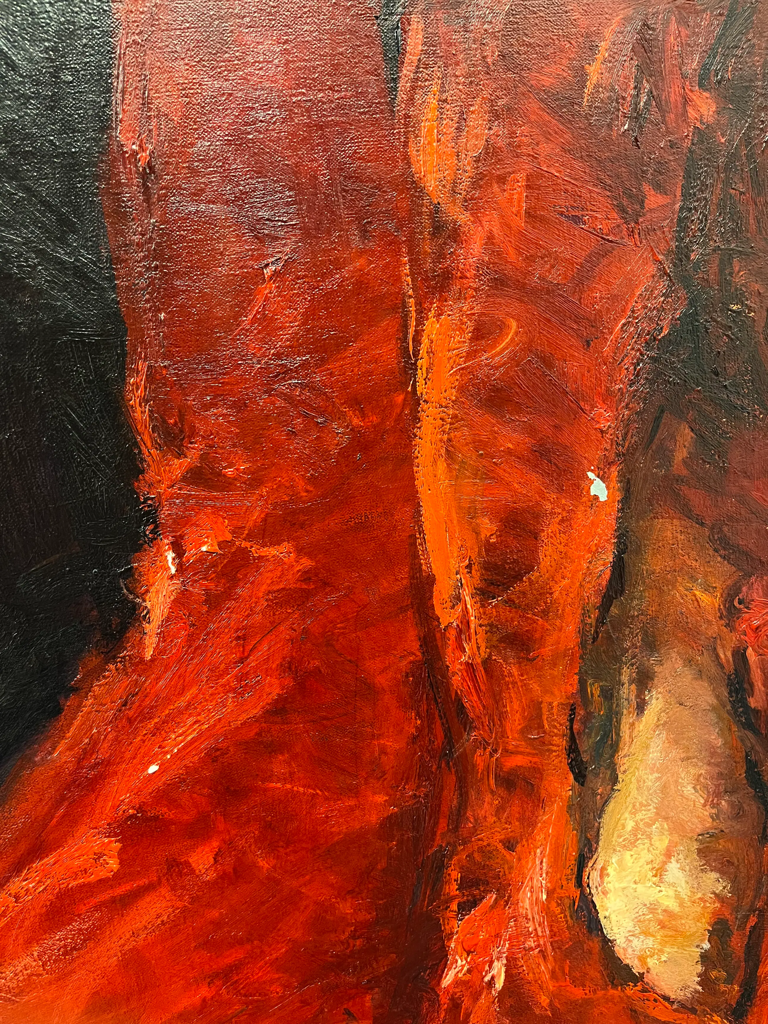 Krachtig en expressief werk uit de late jaren ’90 van Dinie Boogaart, waarin haar kenmerkende figuratieve stijl en emotionele intensiteit duidelijk naar voren komen. De compositie toont een liggende of rustende figuur, opgebouwd uit dynamische, pasteuze penseelstreken in diep rood en zwart. De dramatische kleurcontrasten en het energieke impasto geven het werk een sterke fysieke aanwezigheid en roepen een gevoel van beweging en innerlijke spanning op.