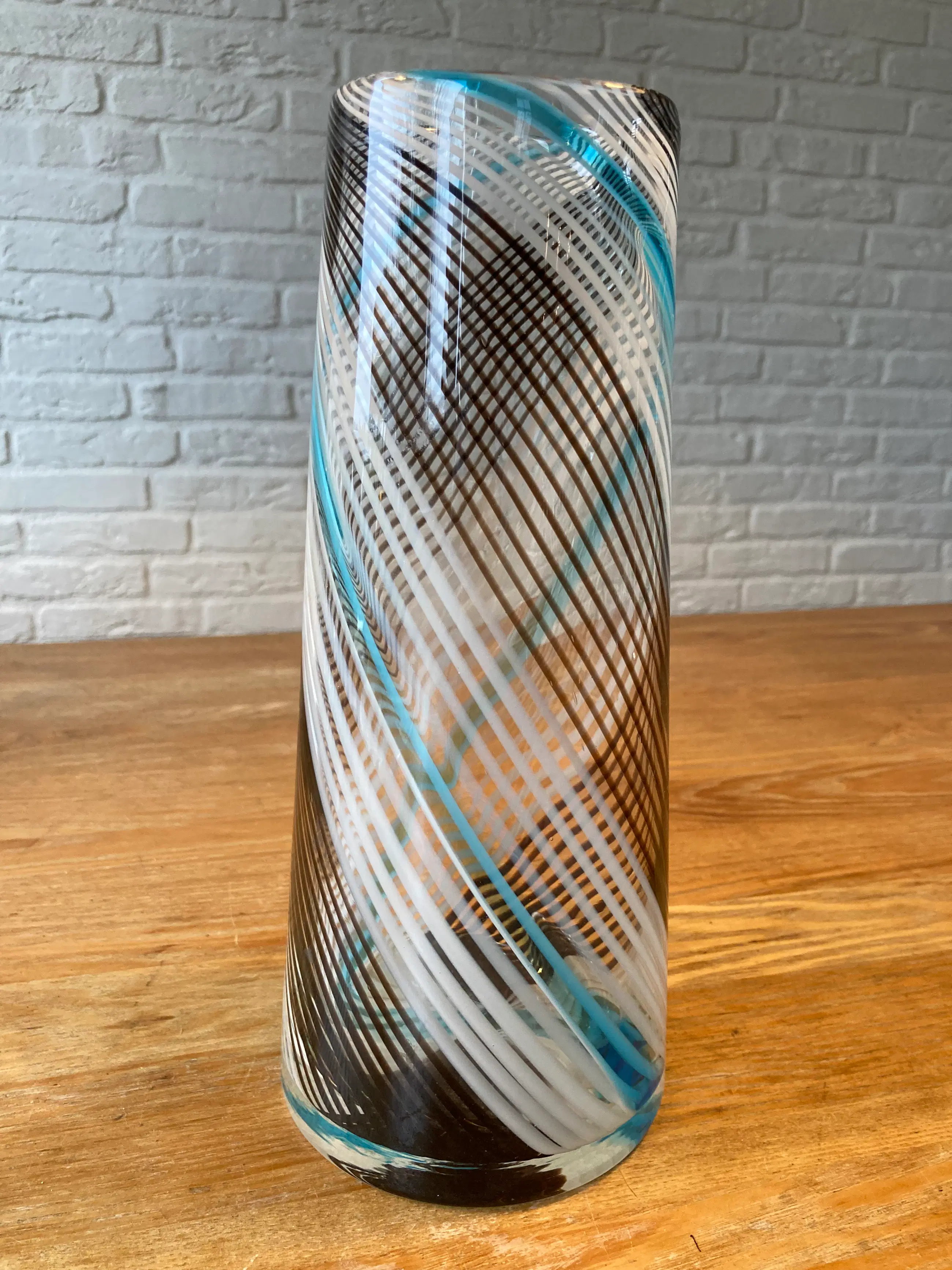 Een geweldige klassieker van Murano glaswerk. Een “Trina" vaas, ontworpen door Dino Martens voor Aureliano Toso. Transparant glas met wit, blauw en koper filigraan. 27cm hoog, basis 11.5cm, opening 8 cm.