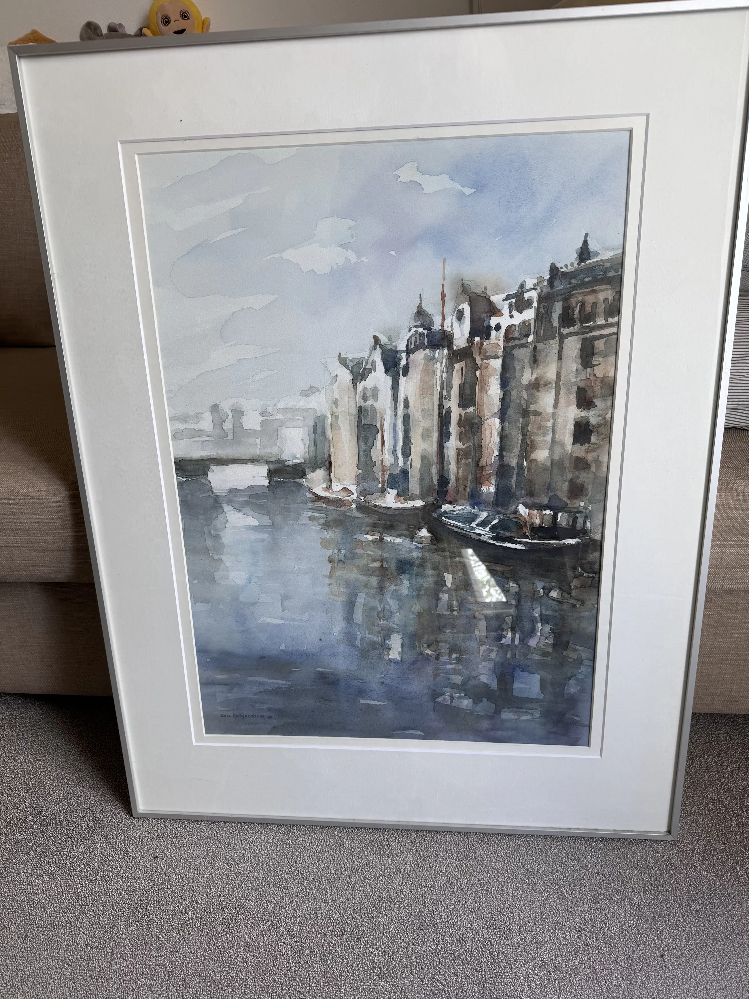 Aquarel van Dio Konijnenberg. Ik heb me laten vertellen dat het een afbeelding van een gracht in Amsterdam is.