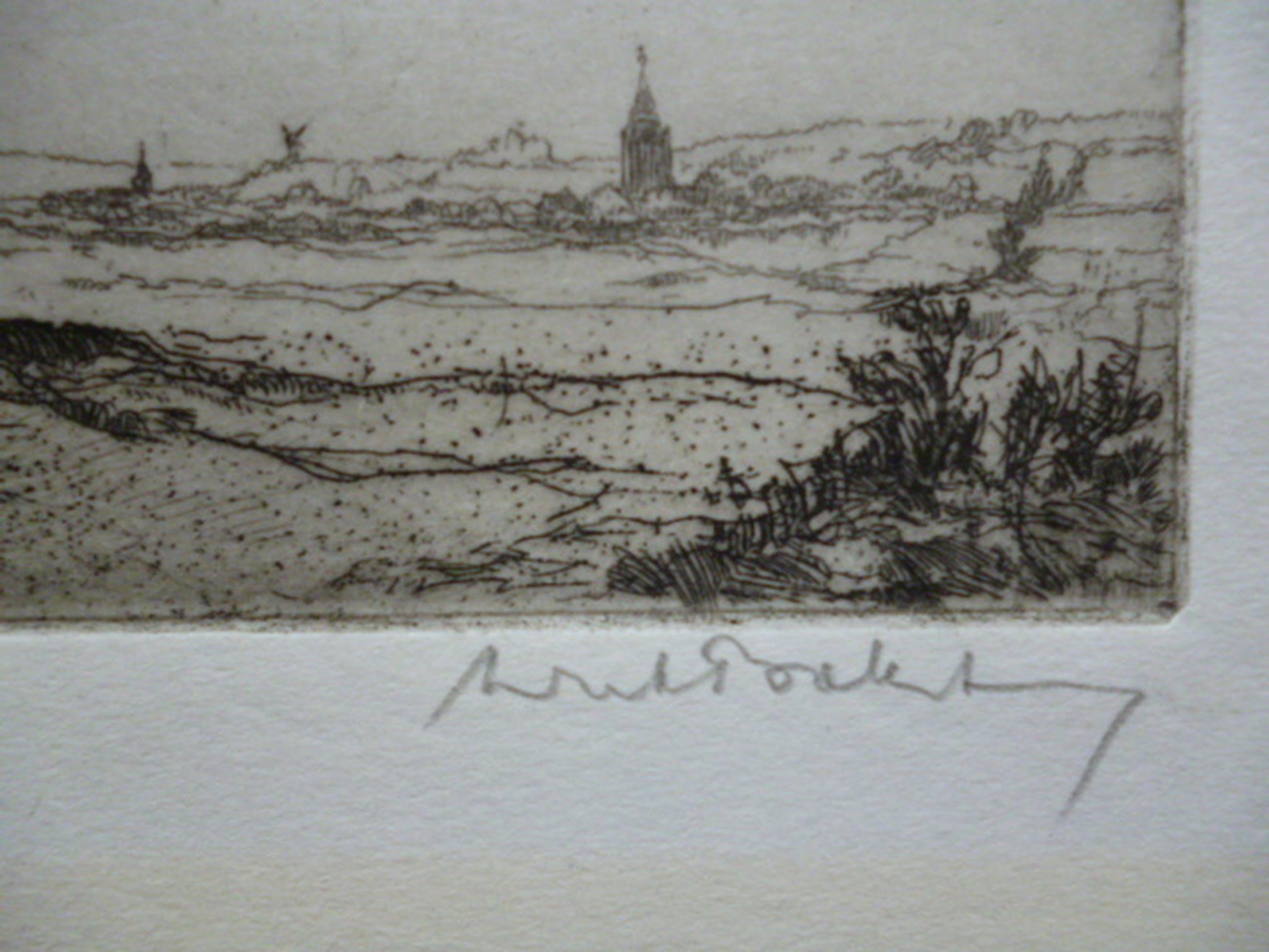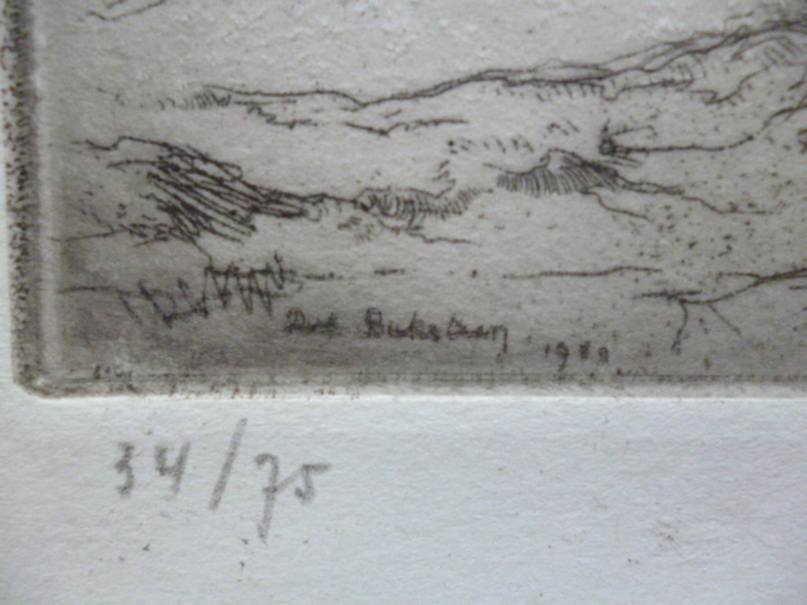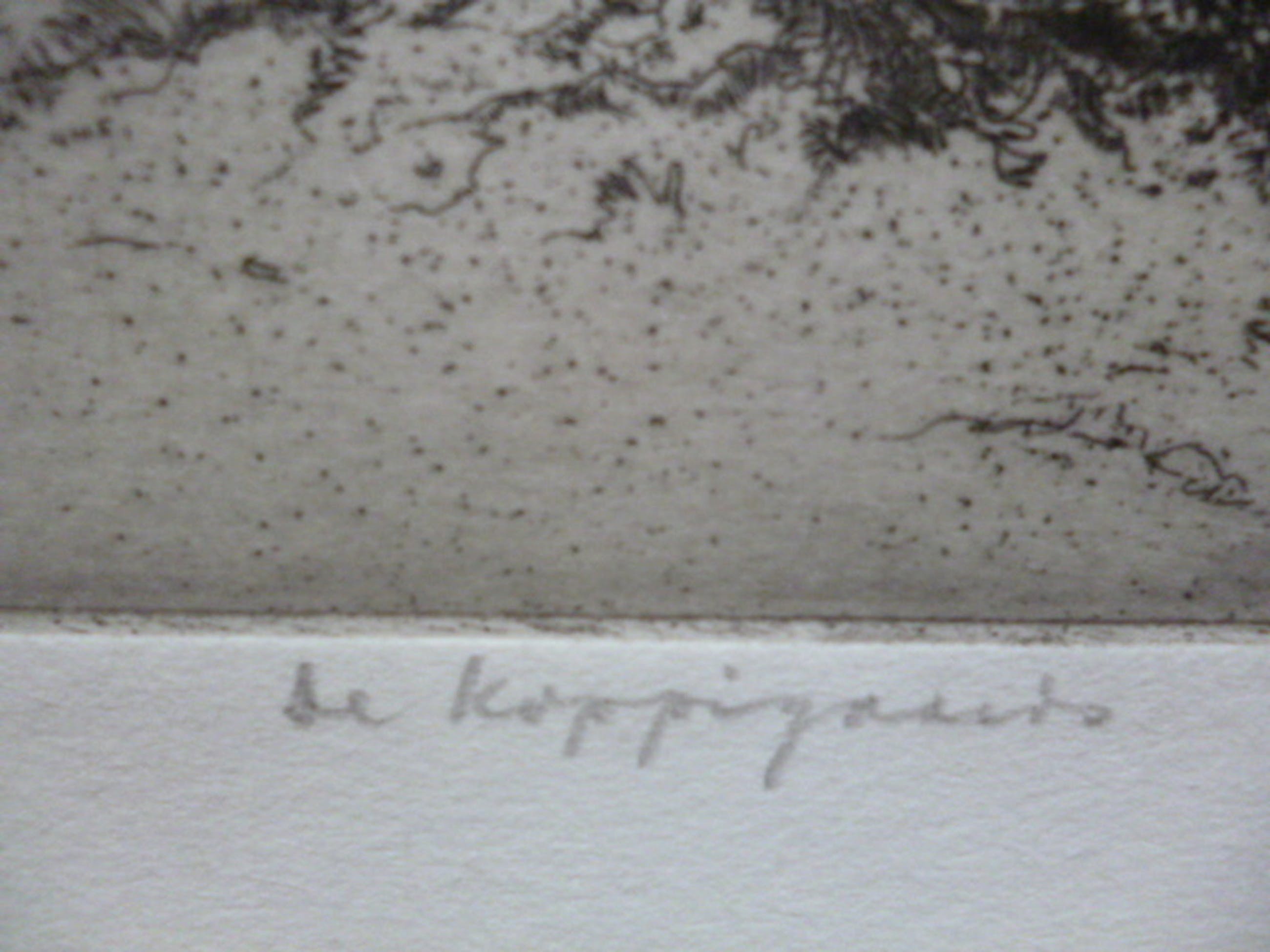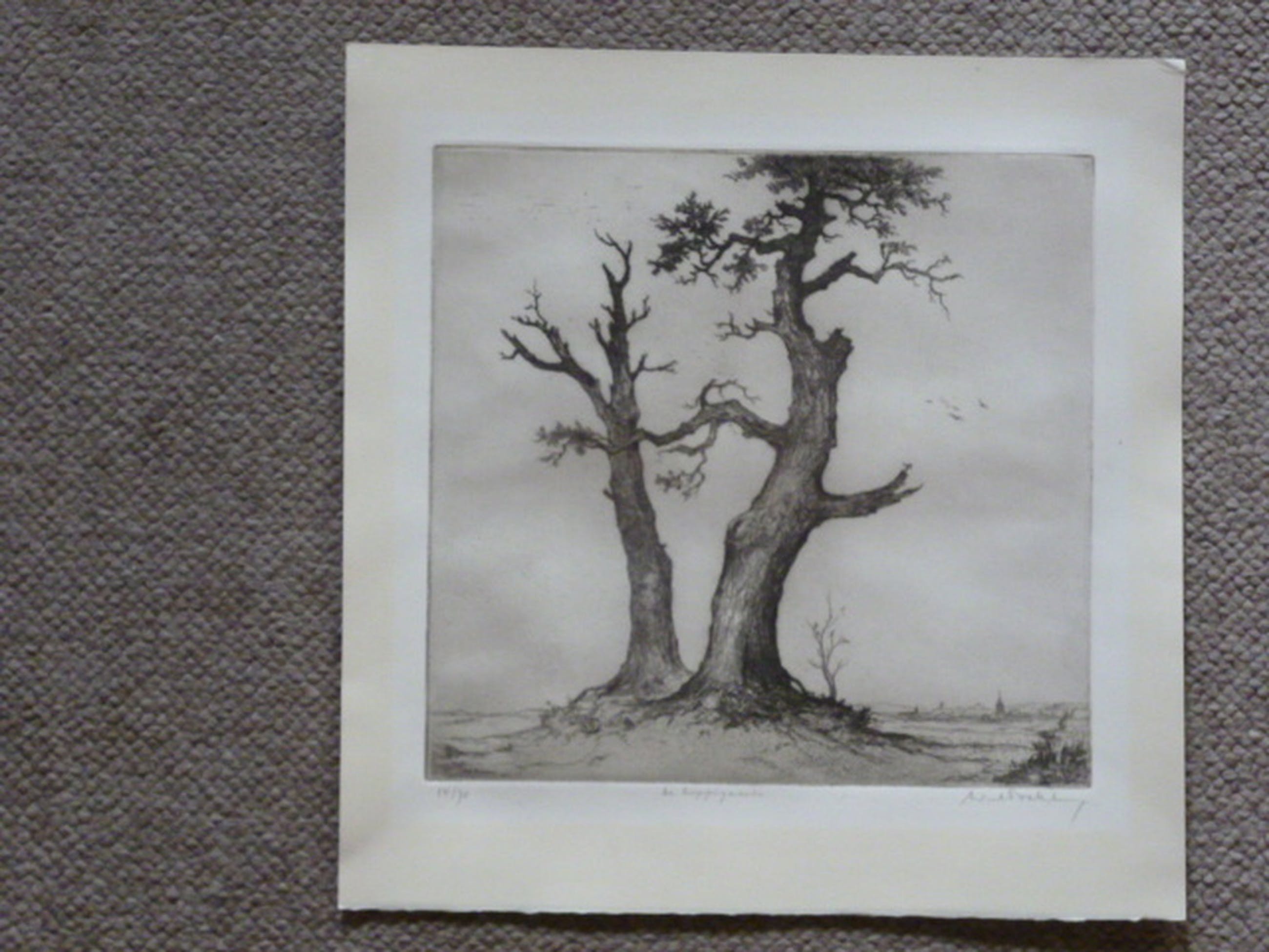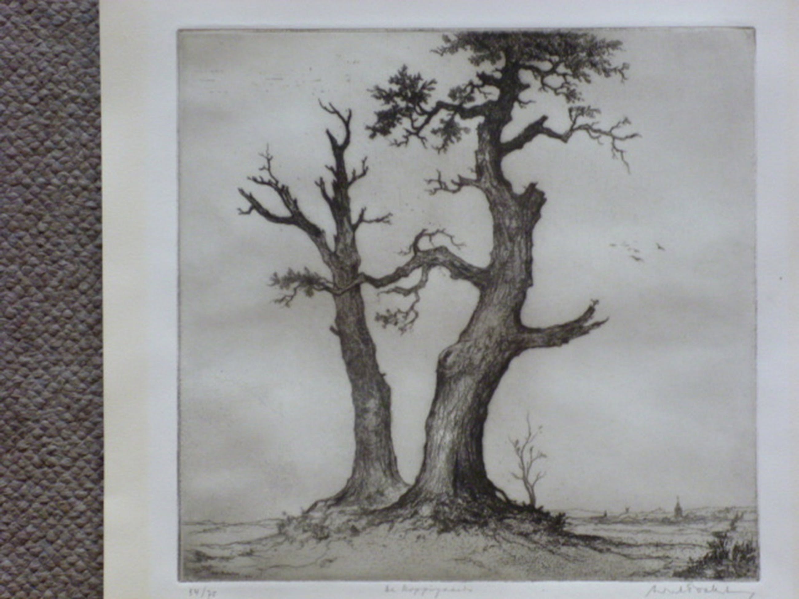 Ets uit 1950, potlood gesigneerd rechtsonder. Getiteld middenonder. Genummerd 34/75 linksonder.