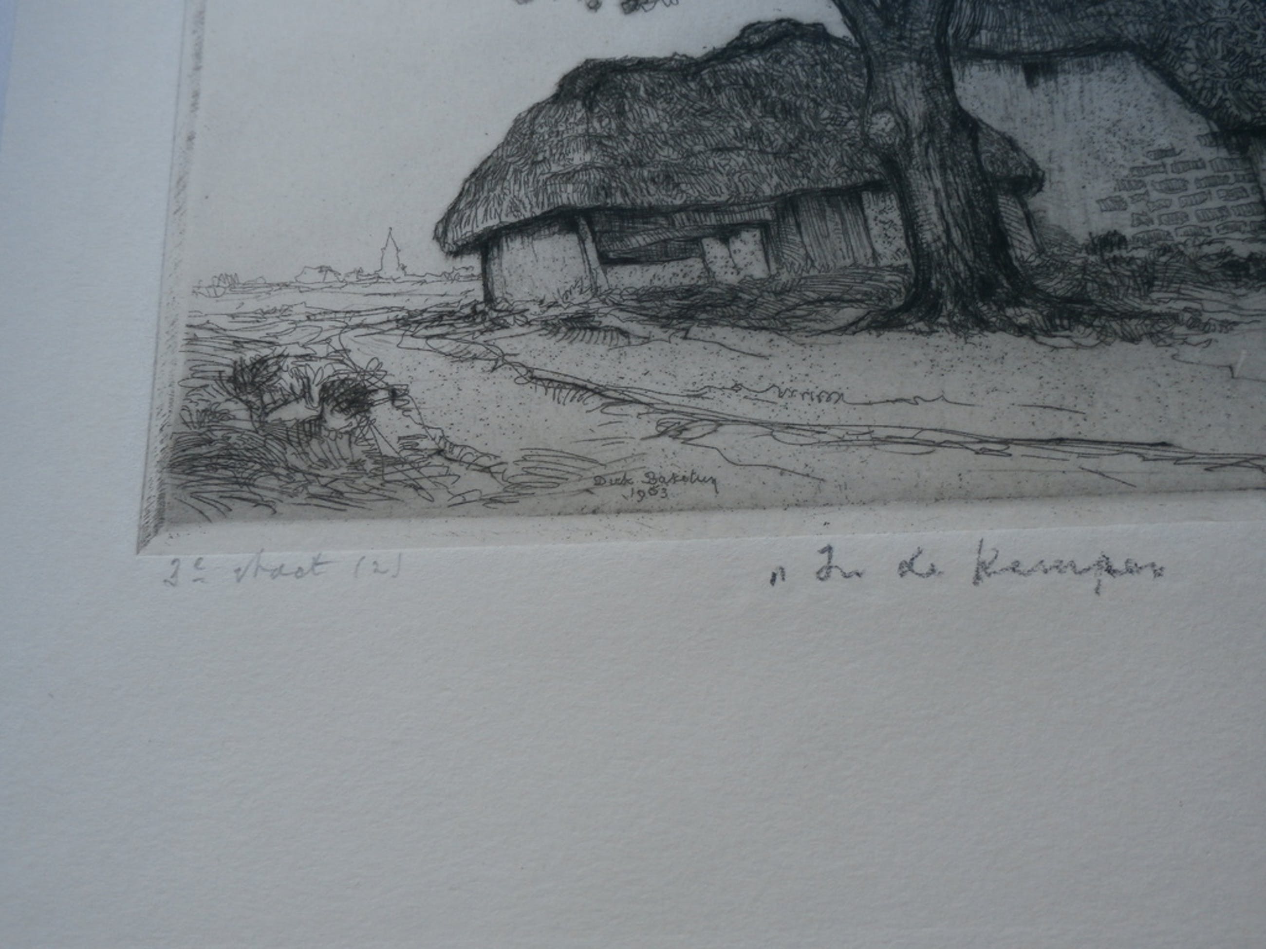 Ets van Dirk Baksteen. Titel: In de kempen. Gesigneerd rechtsonder met potlood. Linksonder met potlood: 3e staat (2). Afmetingen incl. passe-partout blad: H49,5 x b32 cm. Afmetingen blad ets: H32,5 x b24 cm. Afmetingen voorstelling: H21,5 x b19 cm. Conditie: in goede staat. De authenciteit van dit werk wordt volledig gegarandeerd. Een certificaat van echtheid kan, op verzoek, worden meegeleverd.