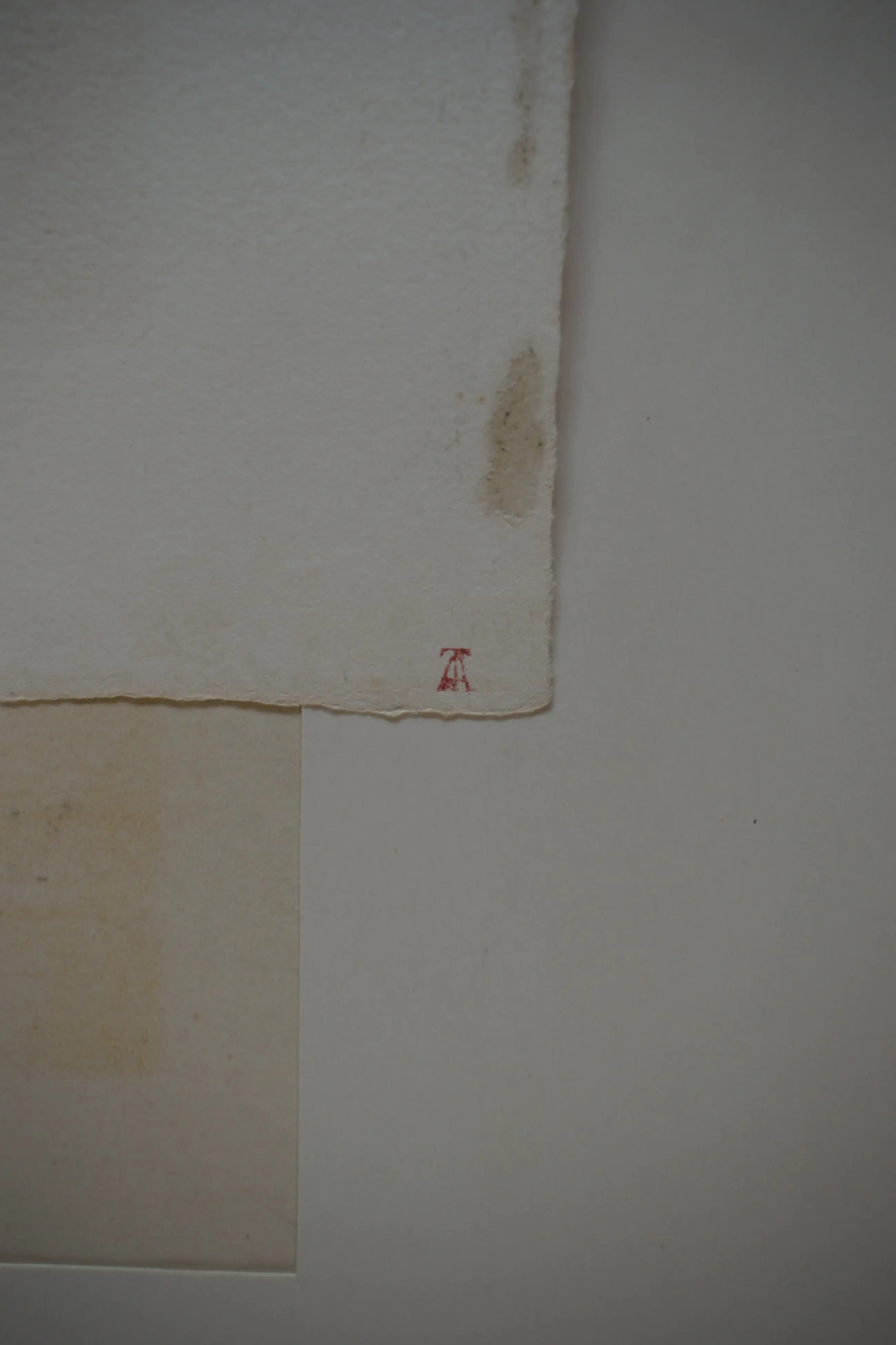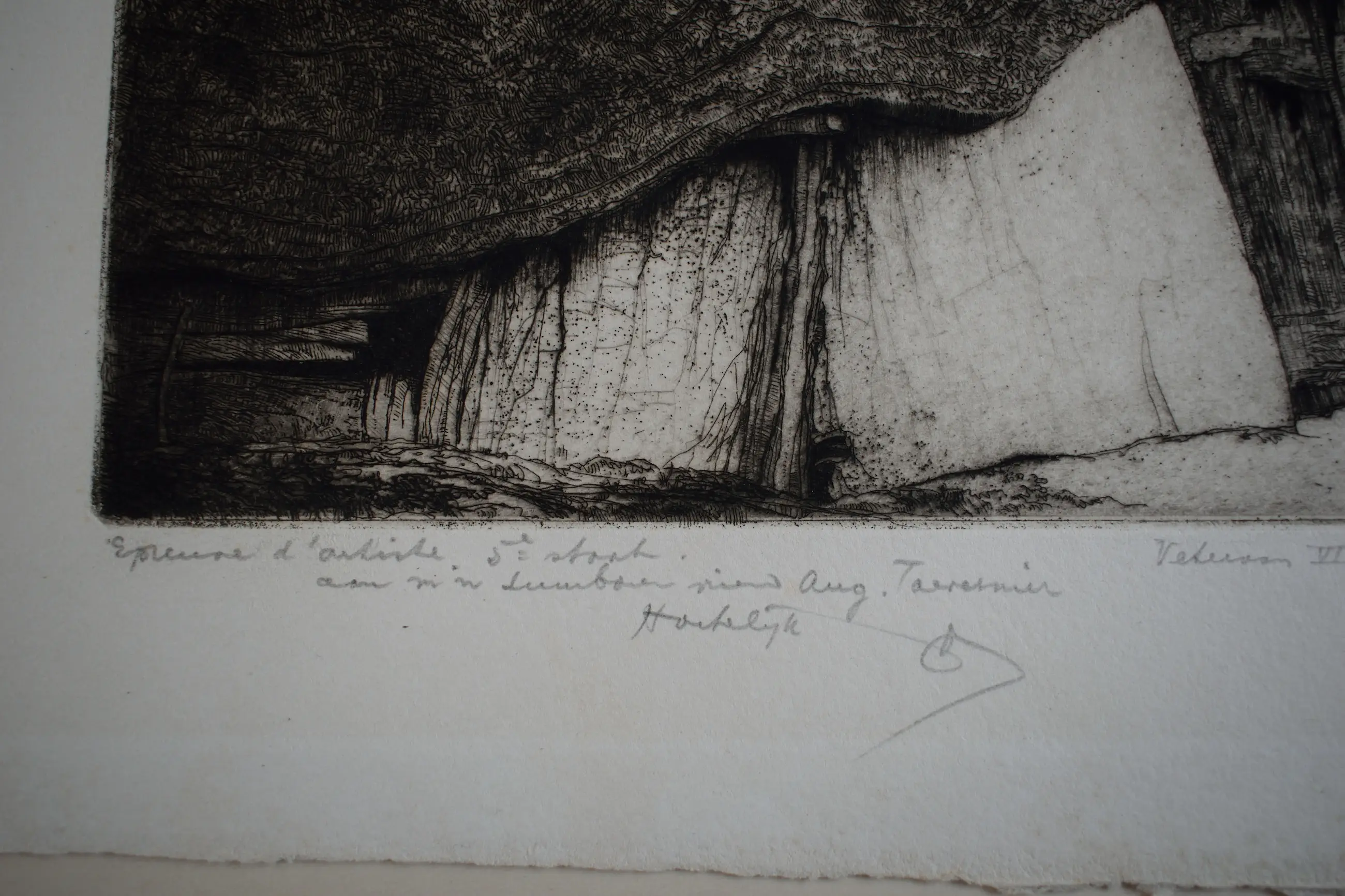 Het exemplaar is ook voorzien van een verzamelaarsstempel van August Taevernier.De ets is in een verzamelaarsmap gestoken, zodat deze goed bewaard zou blijven, zo stuur ik deze ook aan u op. Mocht u meer werken uit deze bijizondere collectie willen bewonderen, dan kan dit als u kiest om de ets af te komen halen.