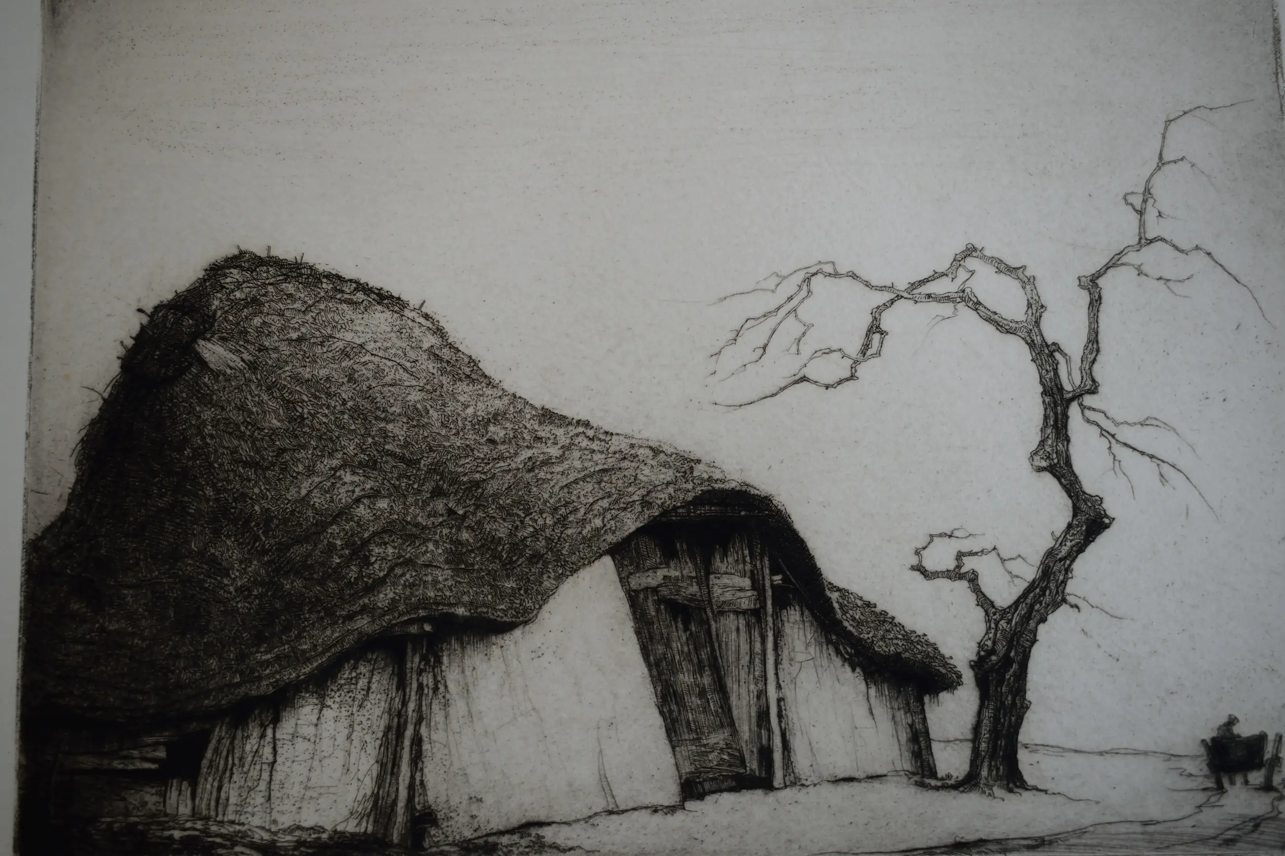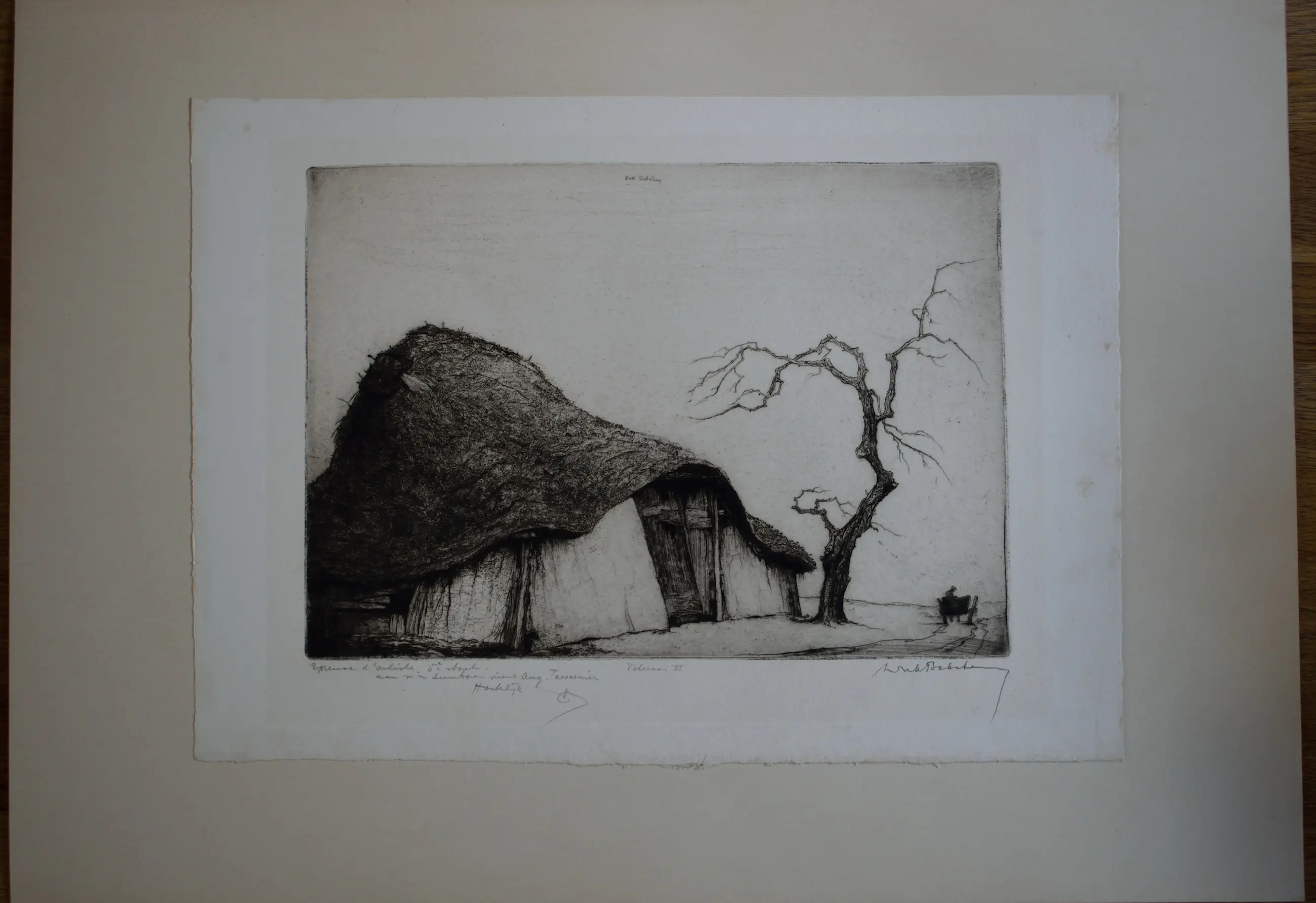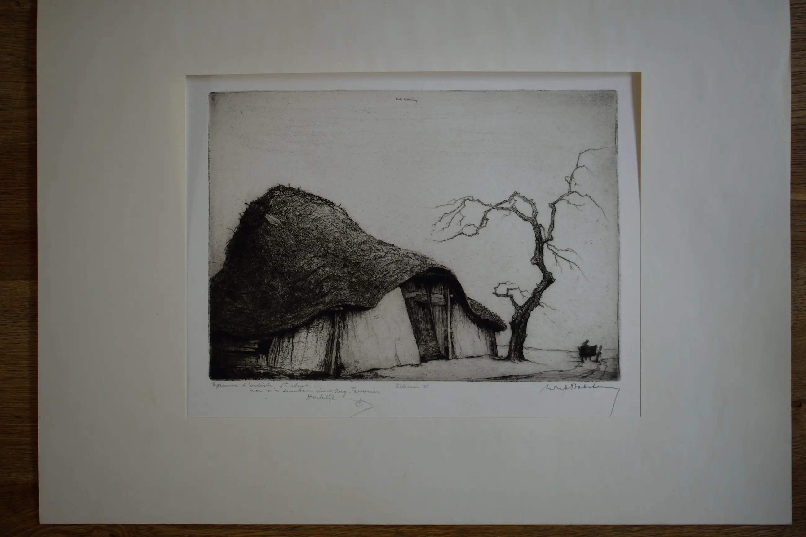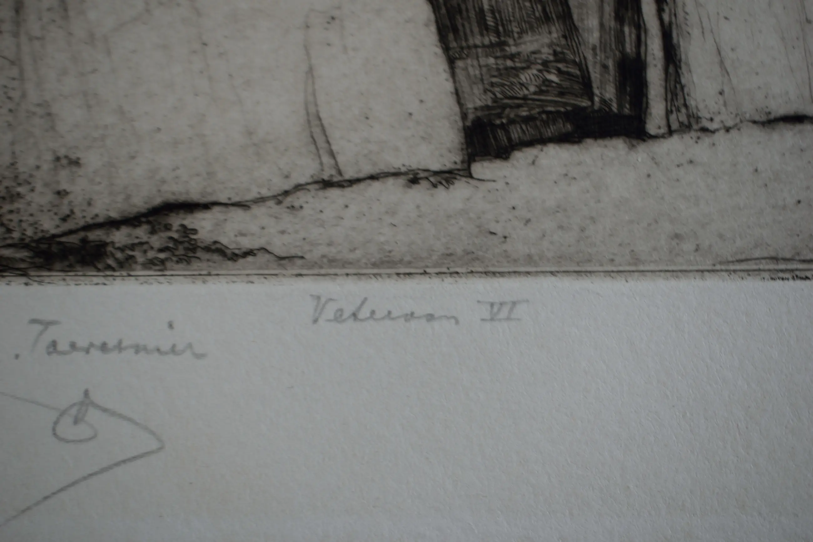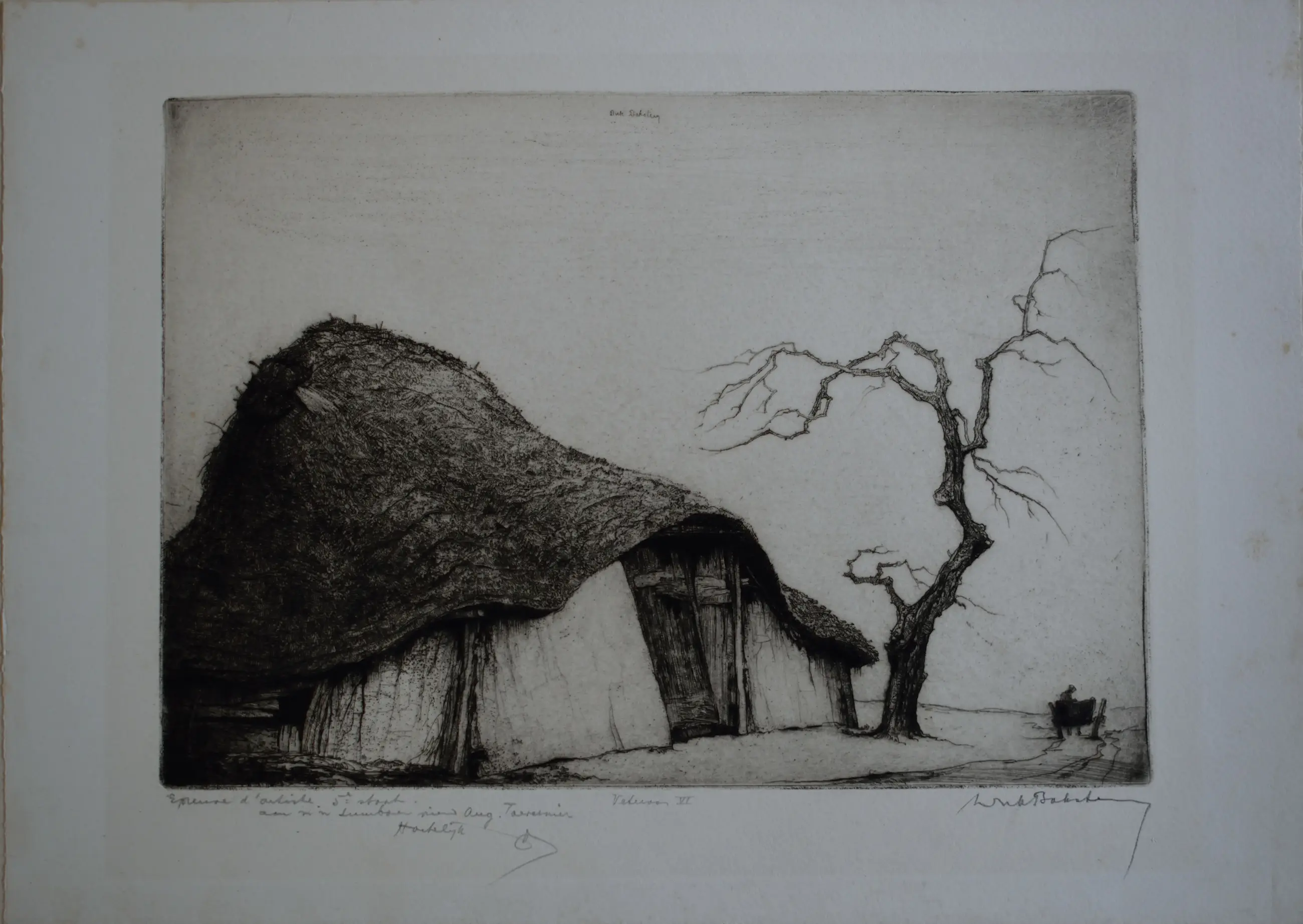 Uit de collectie van de Belgische Verzamelaar August Taevernier verkopen we deze ets van een boerenschuur uit 1923. Genaamd Veteraan VI. Zie middenonder de ets.