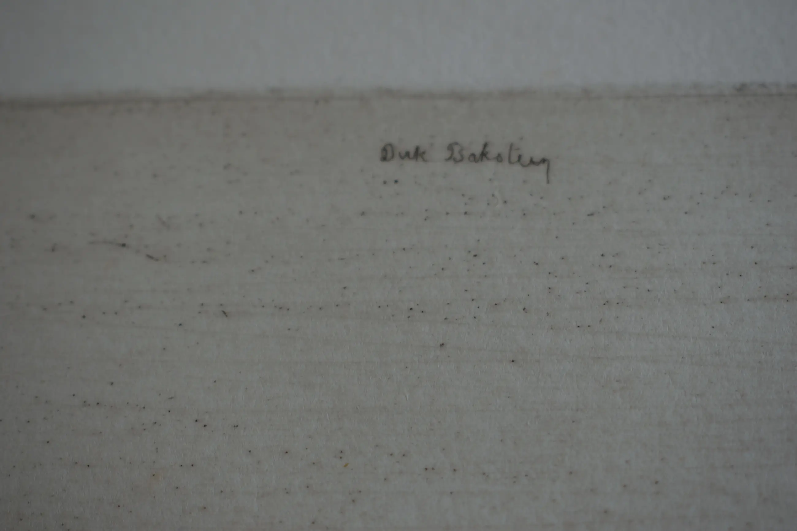 De ets is gesigneerd met Dirk Baksteen op de etsplaat midden boven. Als op de voorkant onder de ets met zijn volledige naam. Ook staat zijn handtekening bij het verhaaltje aan Auguste Taevernier.