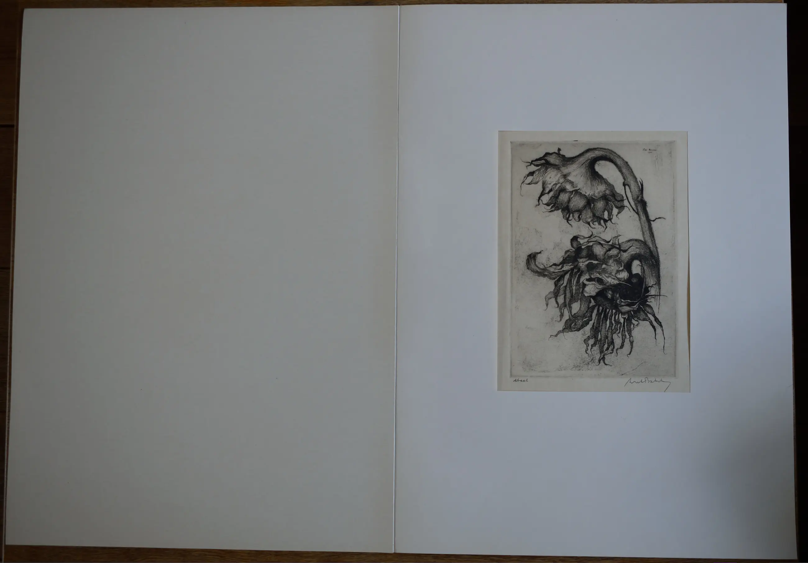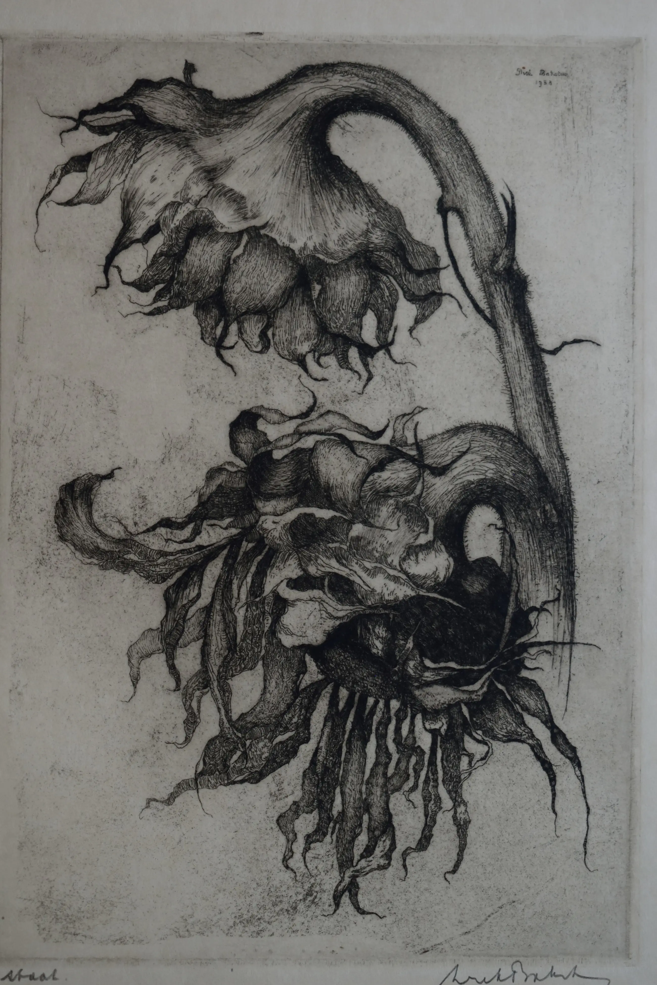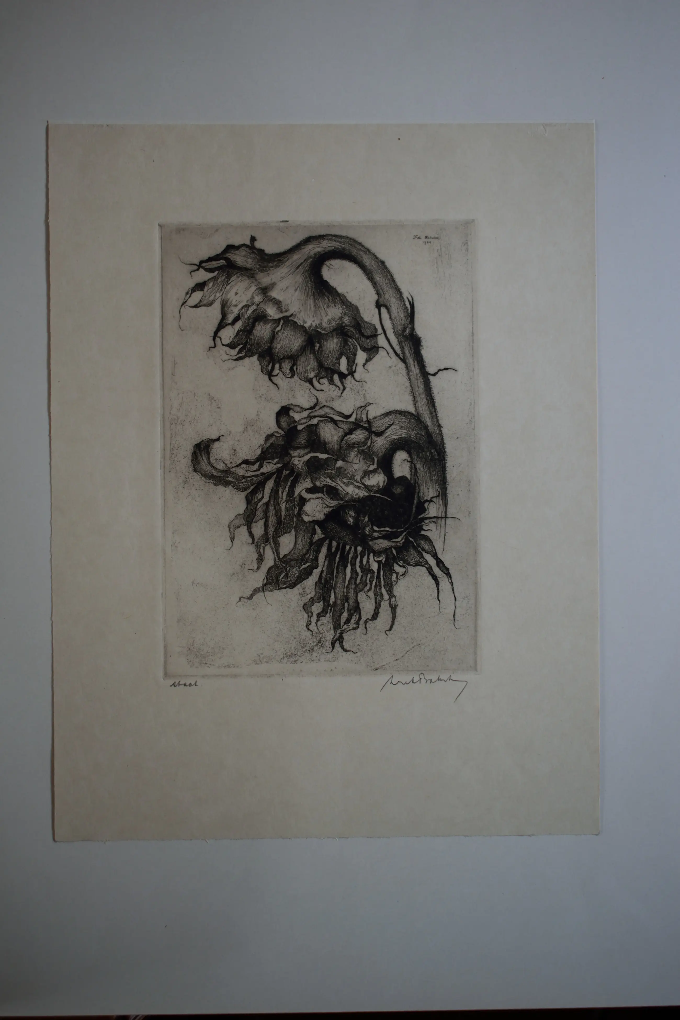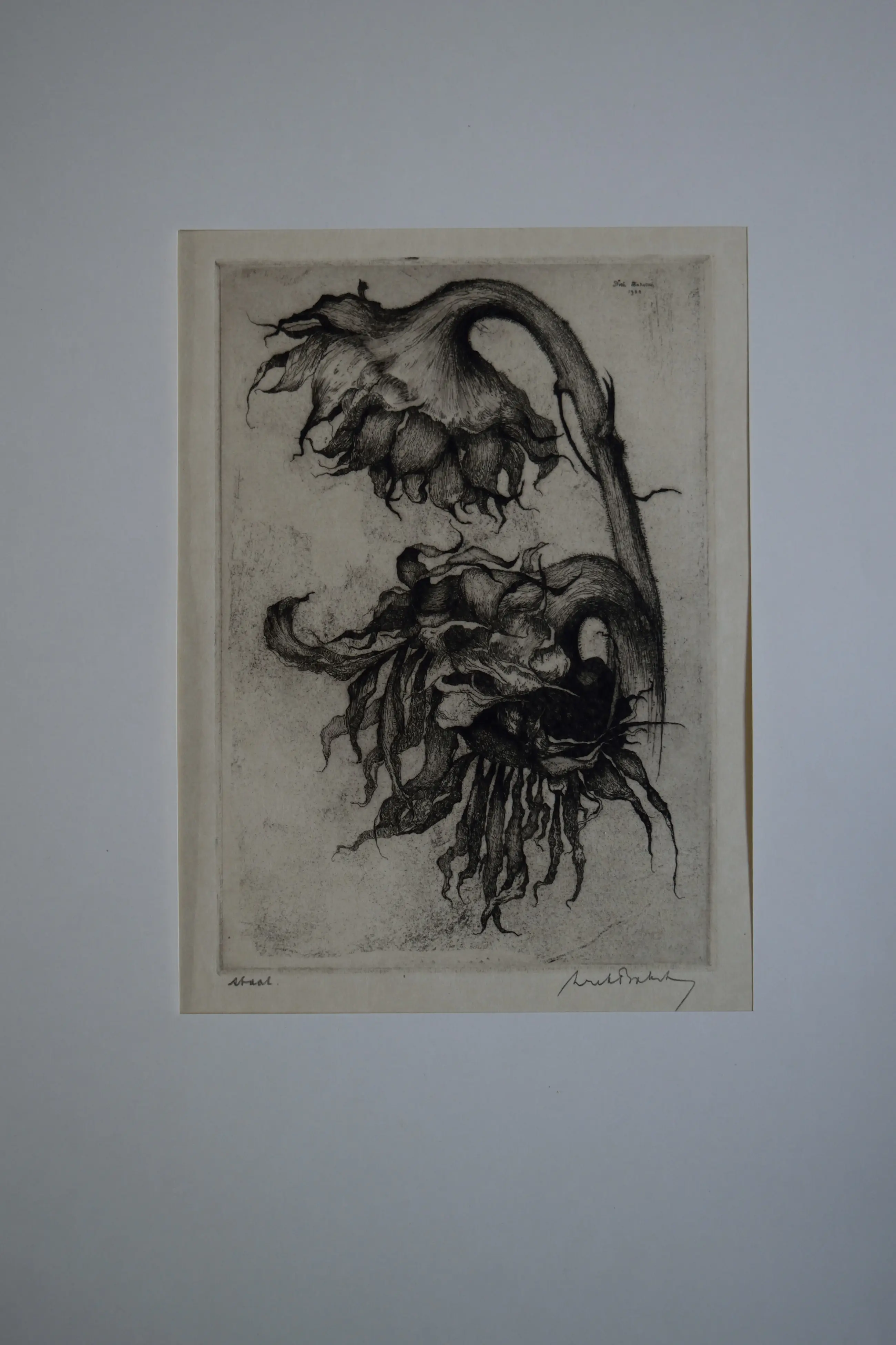 Uit de collectie van de Belgische Verzamelaar August e Taevernier verkopen we deze ets van een zonnebloem uit 1933. Genaamd Zonnebloem.