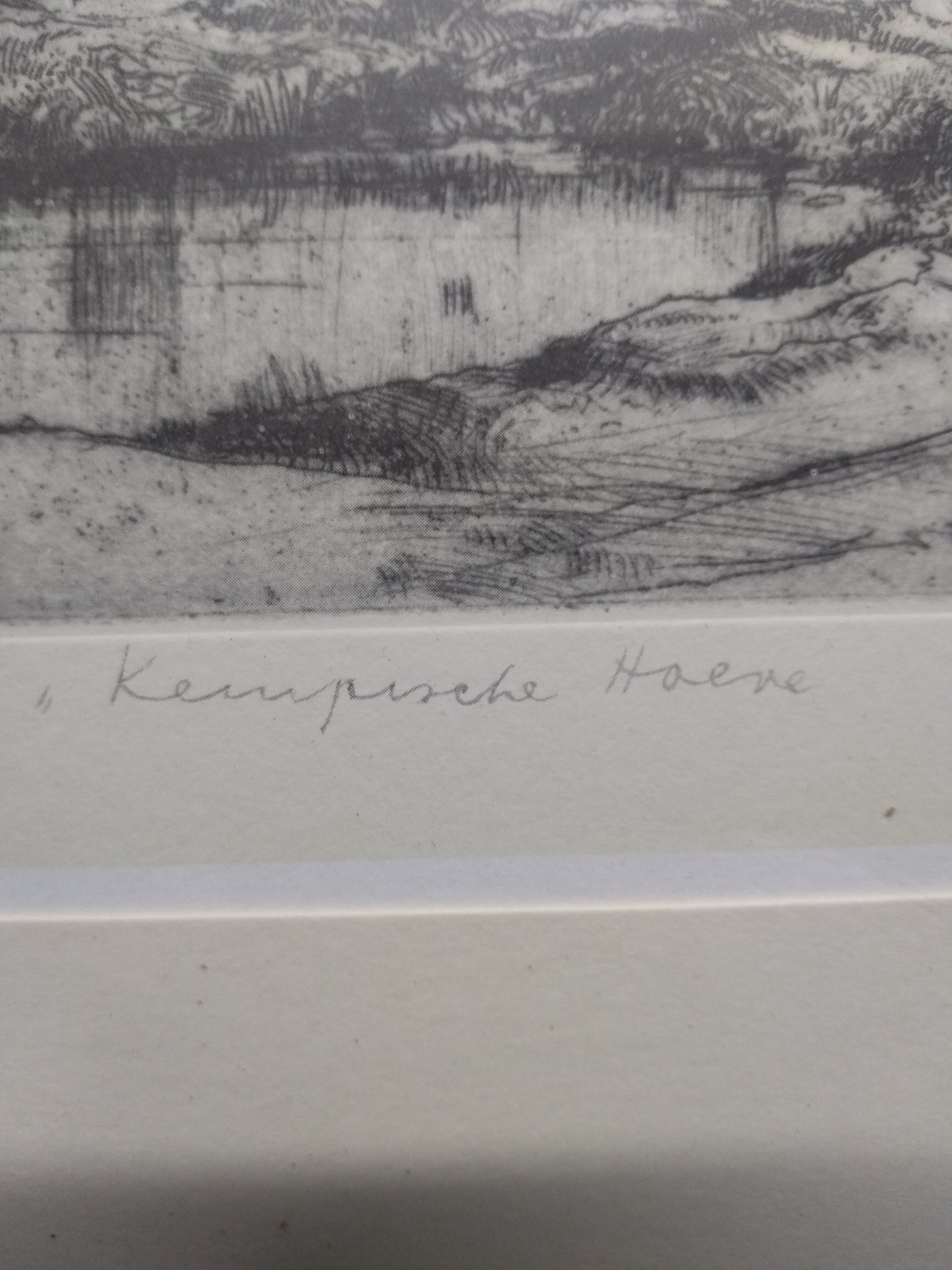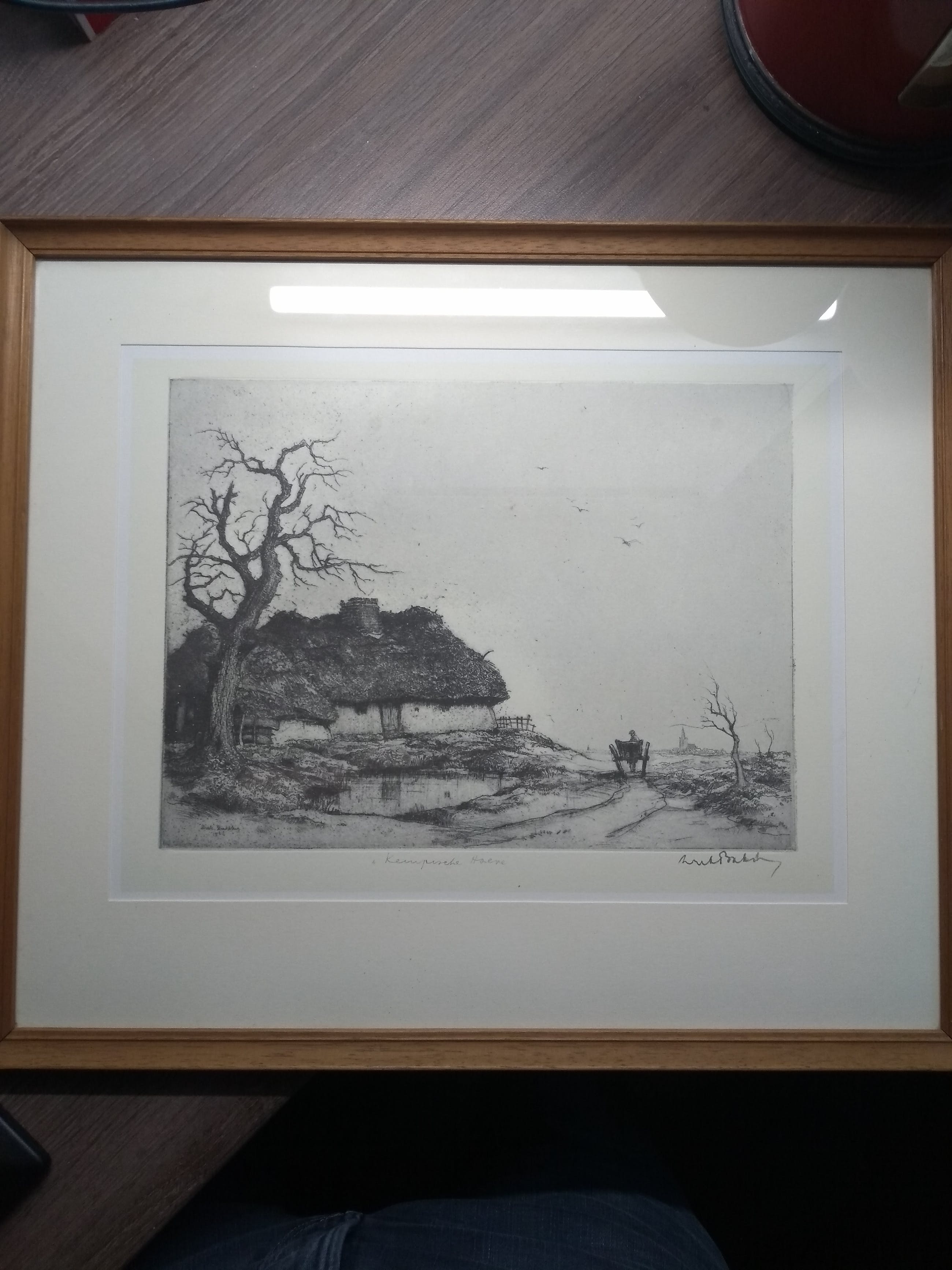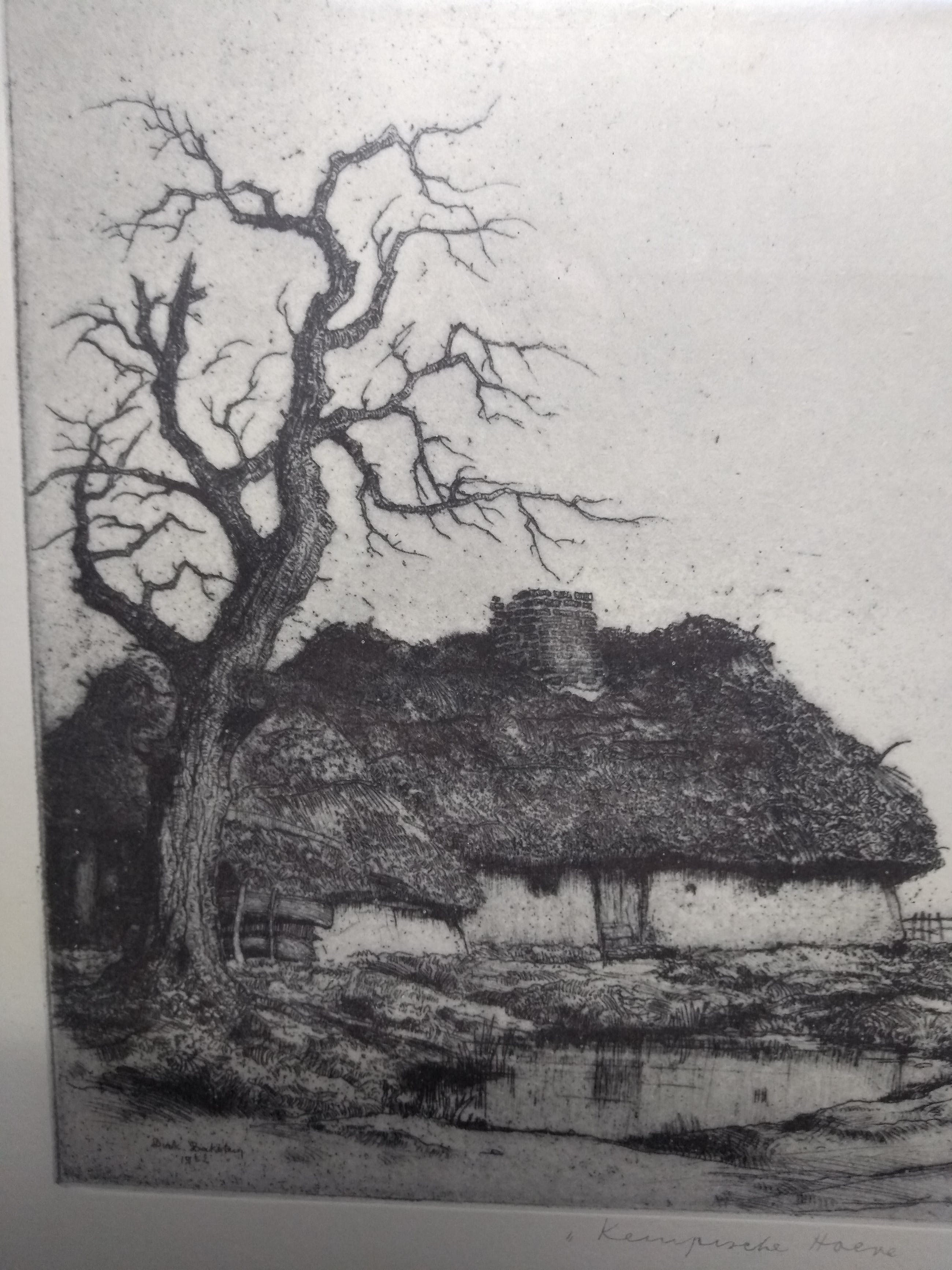 Afgebeeld Kempische hoeve,boom,zandweg met kar,kerkje in de verte. Getekend in de plaat de datum,en gesigneerd onder de plaat. De moet van de ets is duidelijk te zien. Zeer goede staat.