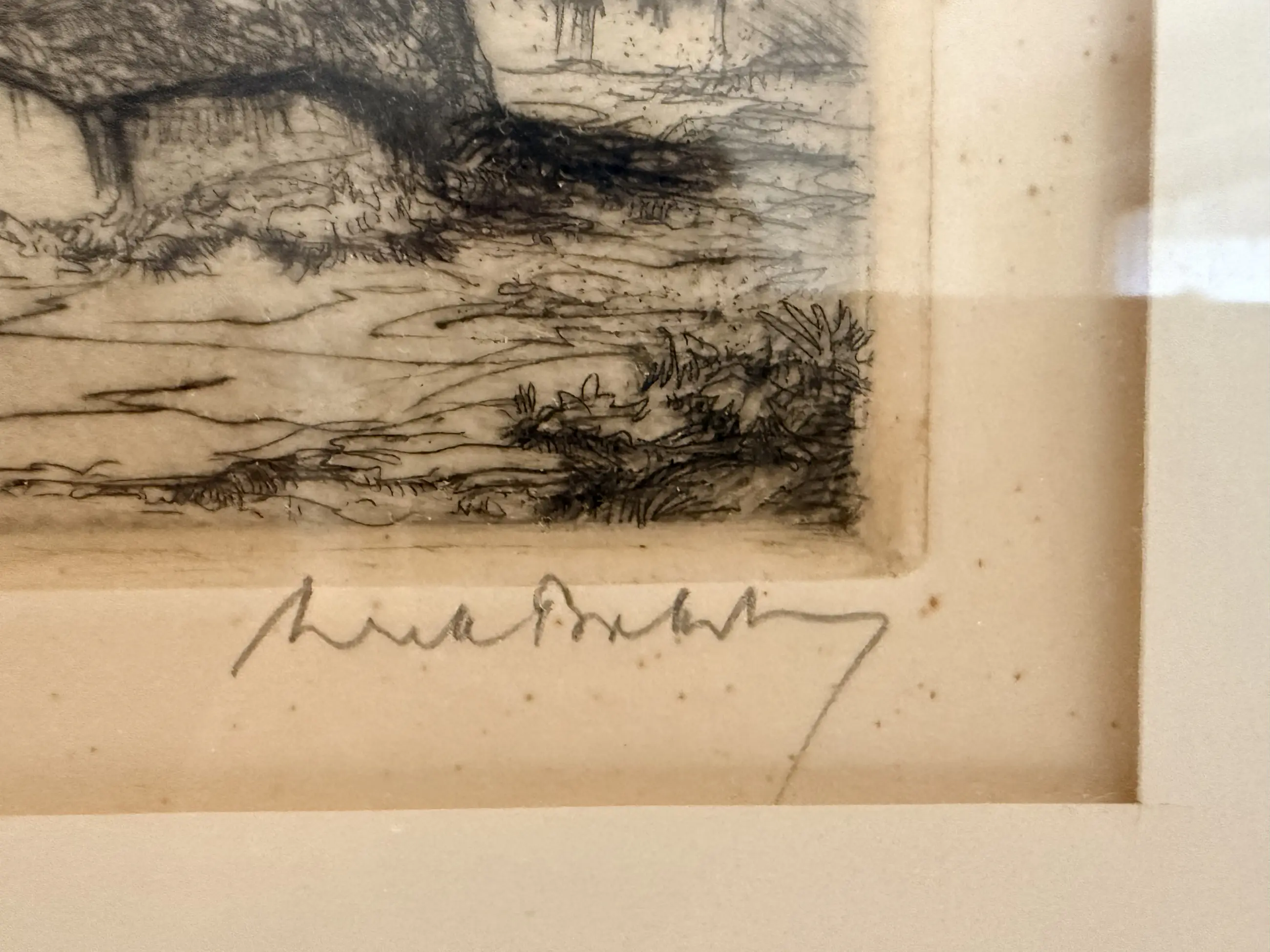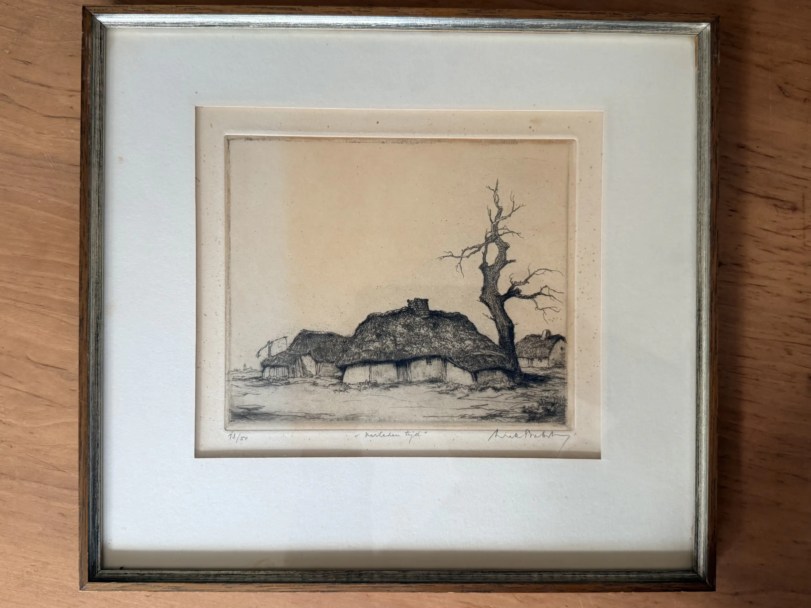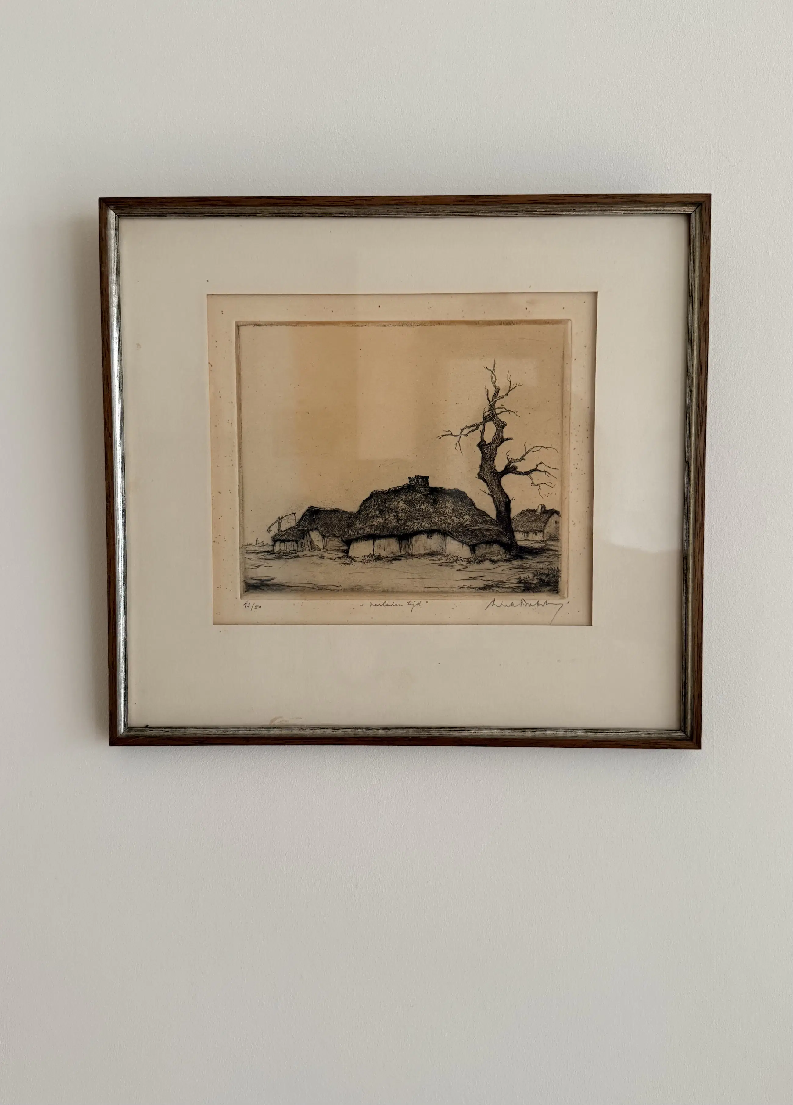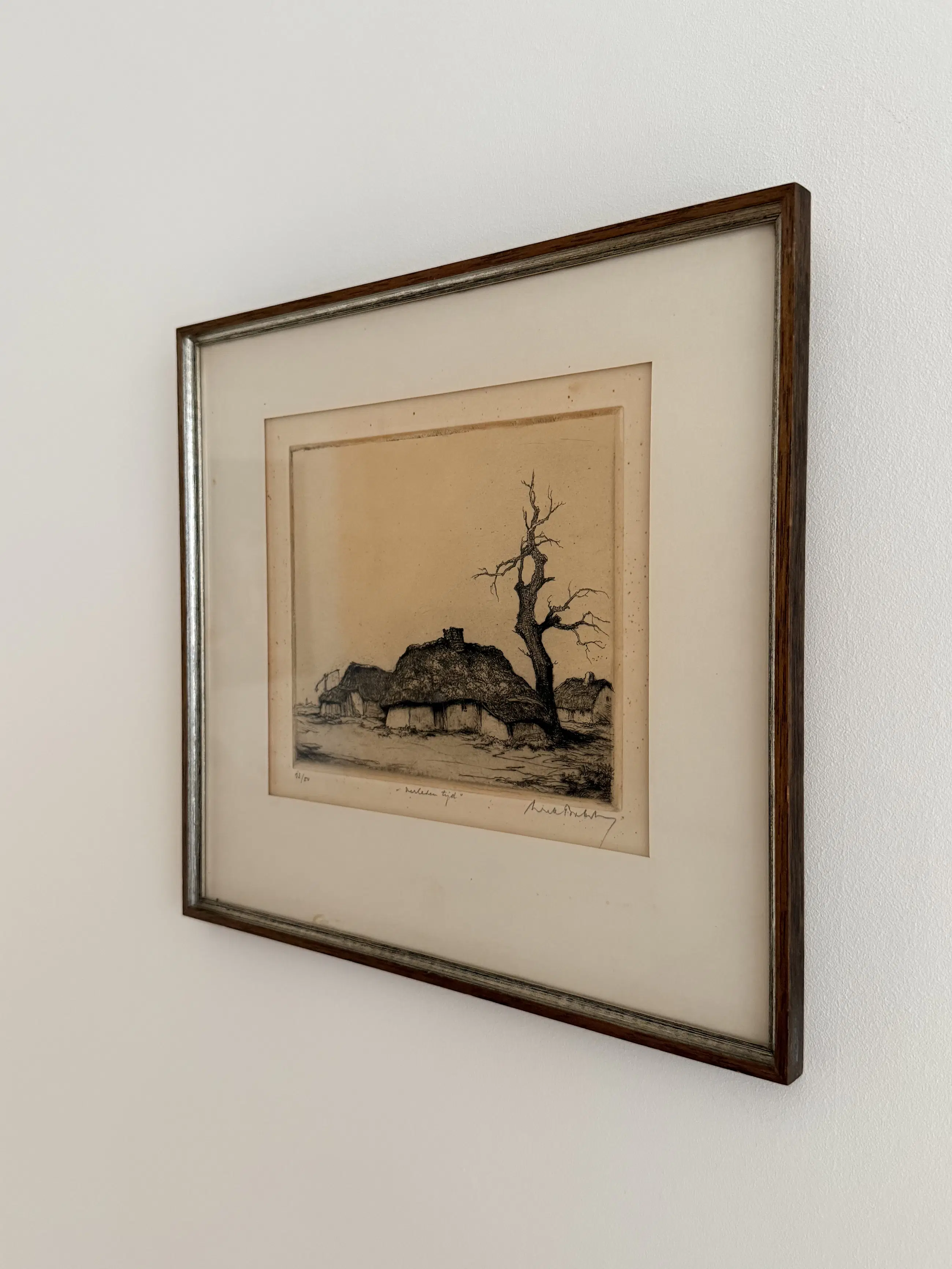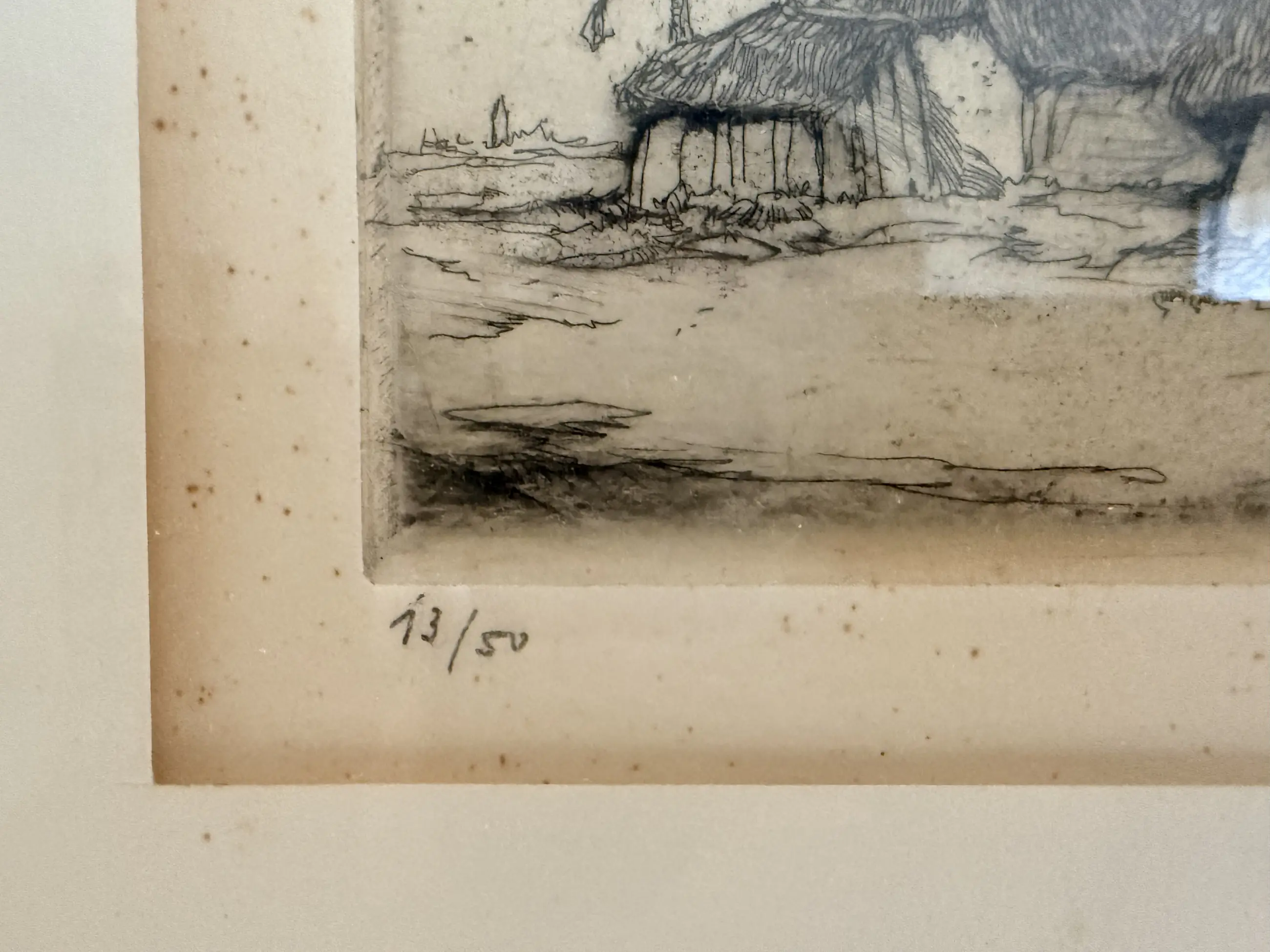 Prent is ingelijst met passepartout, achter glas, in een massief houten lijst. Door het glas is er wat deflexie te zien op de foto's.