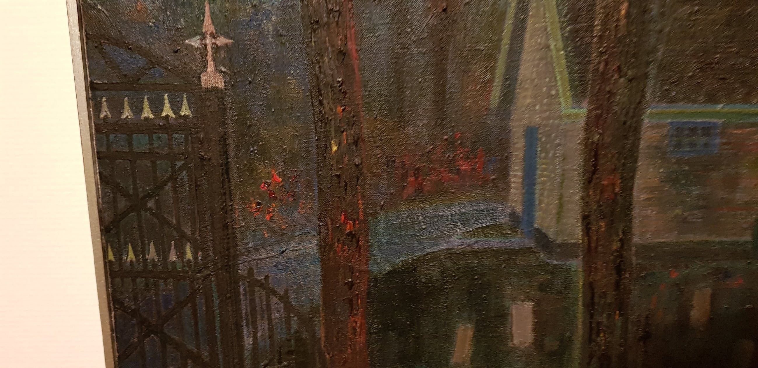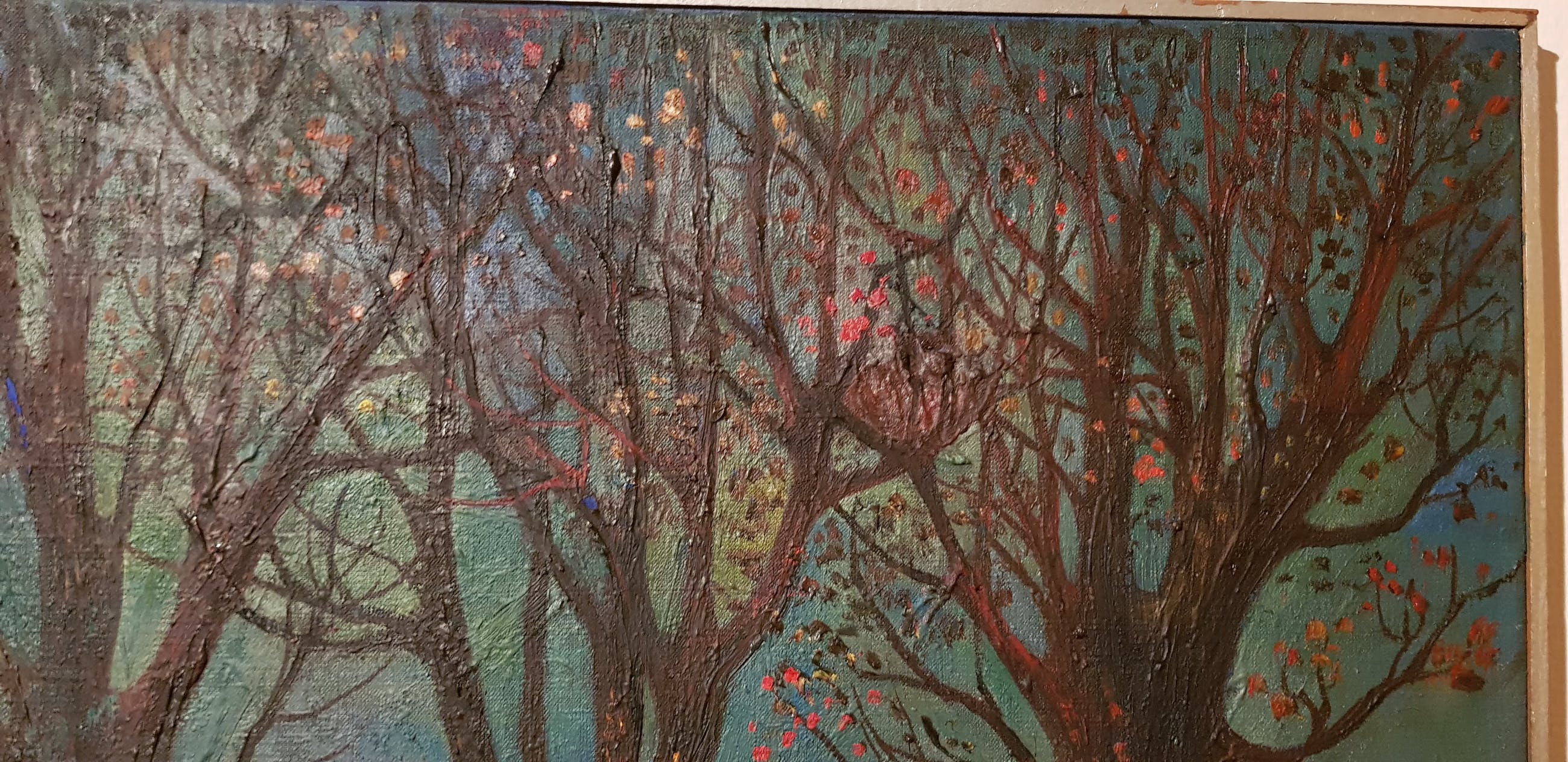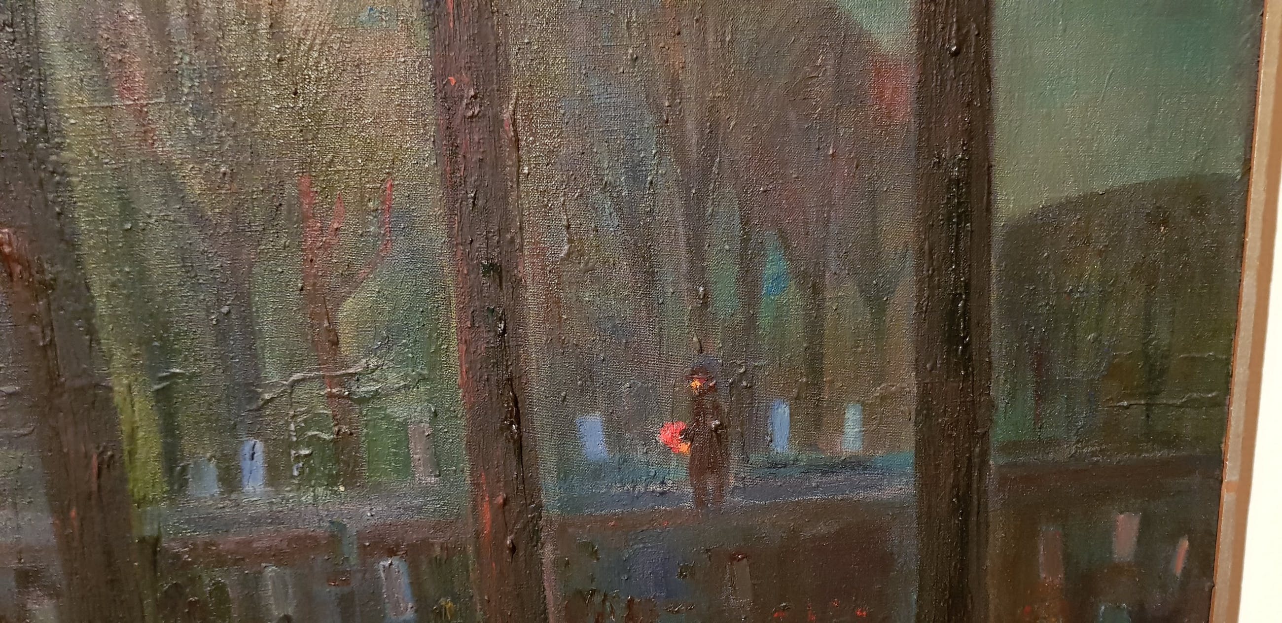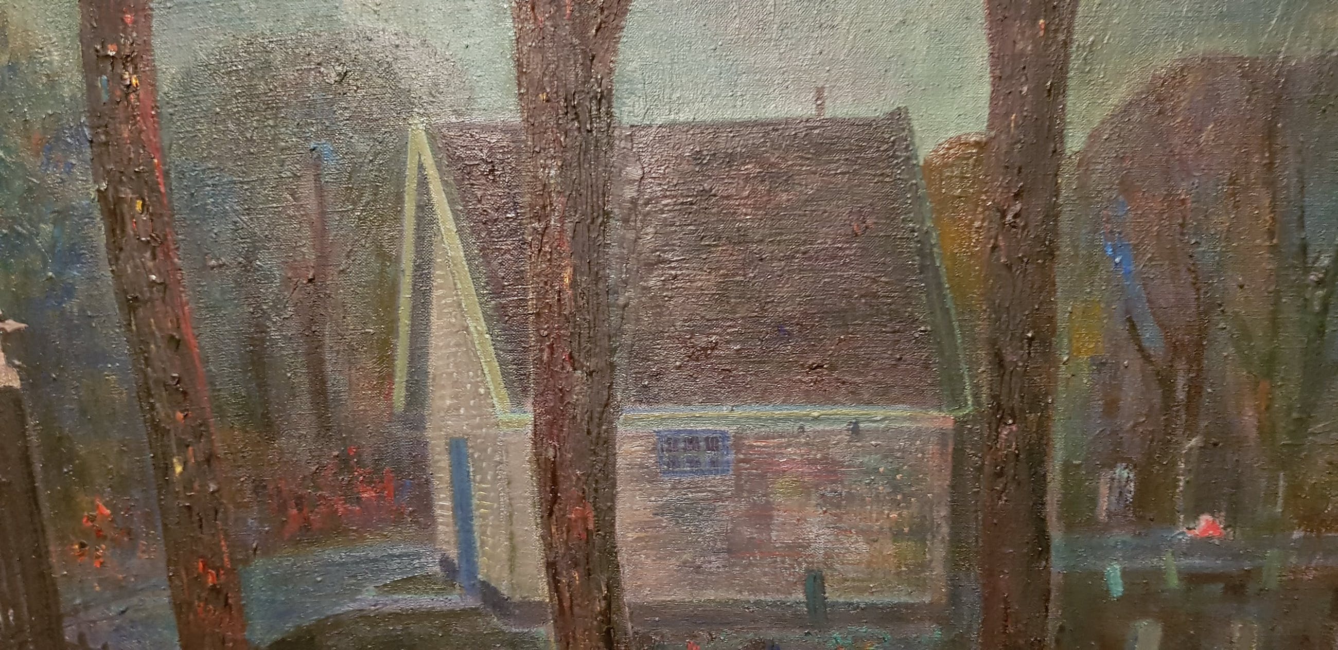 Aangeschaft dertig jaar geleden via Stichting Beeldende Kunst in Amsterdam Donkere afbeelding van een kerkhof met de typerende Dirk Breed bomen.