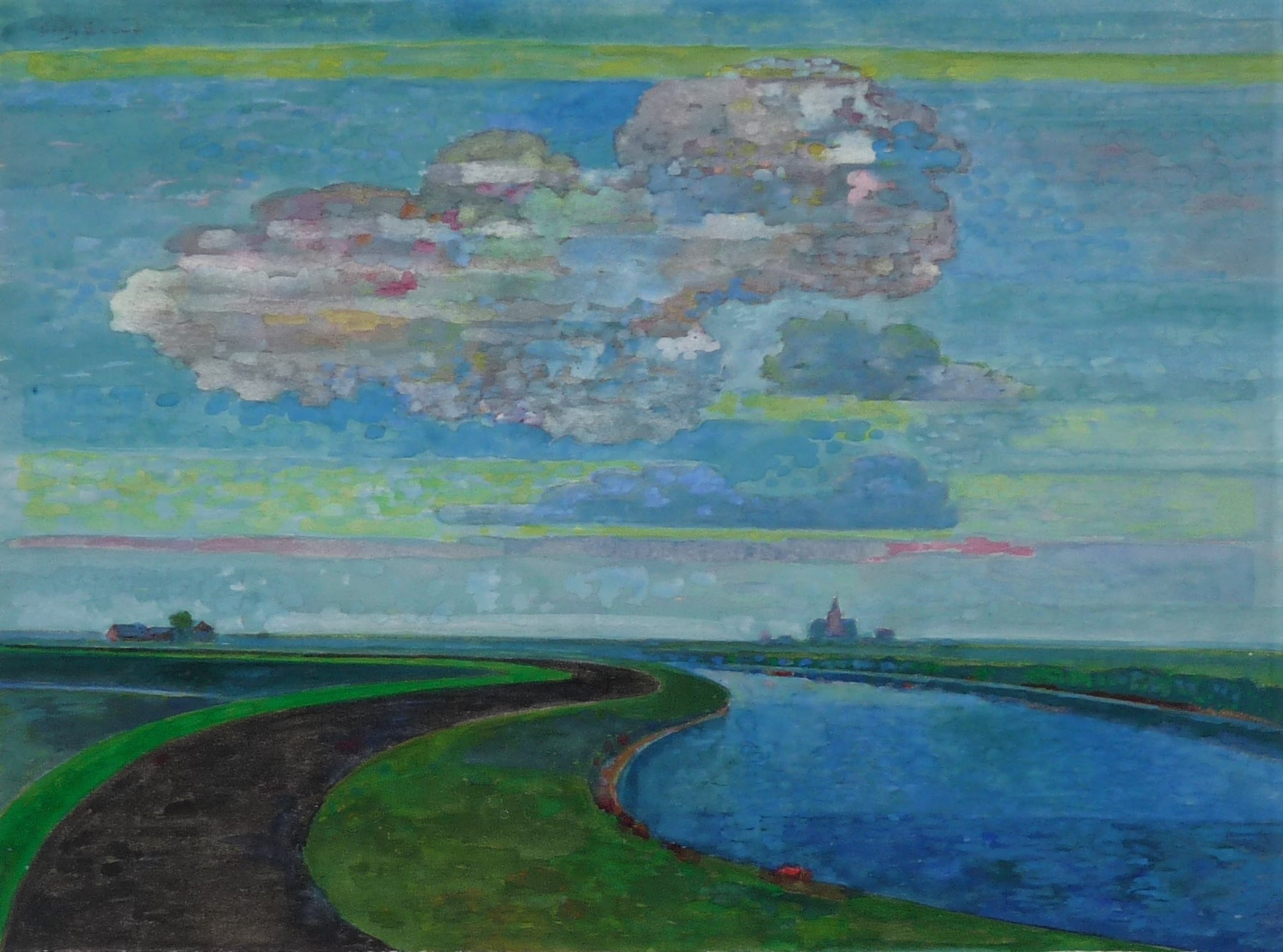 *Een zeer fraai gedetailleerde gouache op papier/karton van een landschap met water en lucht in een prachtige atmosfeer. Hoewel niet groot van formaat is dit wel weer een van de betere werken van deze kunstenaar in de zo typerende stijl.