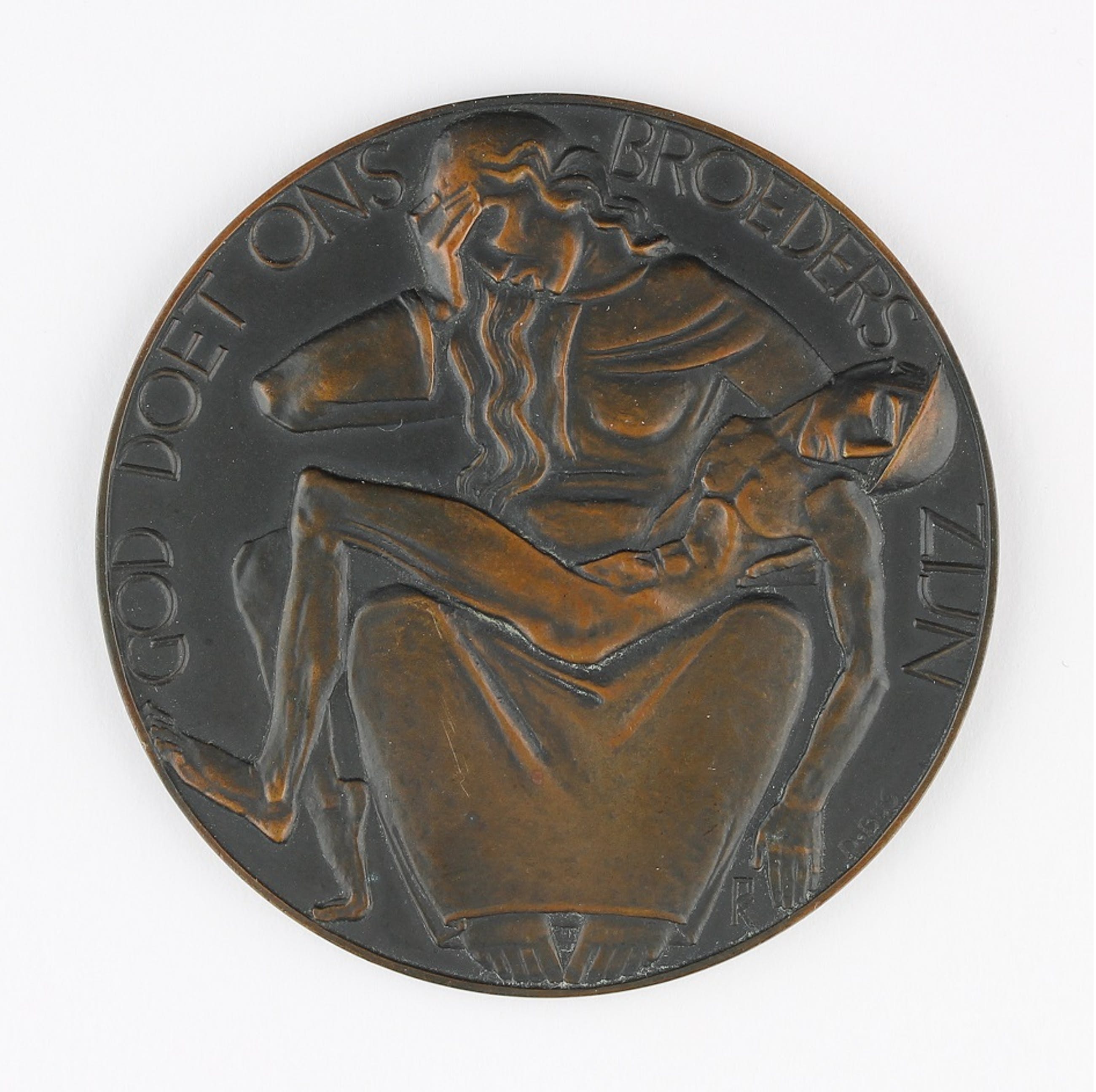 Dirk Bus, leerling van Ingen Housz op de Academie voor Beeldende Kunsten in Den Haag modelleerde een penning met het thema 'Vrede'. De aanleiding is niet duidelijk. Een wenende vrouw draagt op haar schoot een naakte man met een helm. Het is een variant van het piet-motief. De borstparij en de pezen van de man hebben sterke accenten, zijn voeten zijn ingenieus tegen het penningrond geplaatst. Hiermee contrasteert de kledij van de vrouw: die is in brede vlakken opgevat. De tekst 'God doet ons broeders zijn' is meer een wens dan een constatering. De keerzijde laat tegen een neutraal fond een engel met een geheven olijftak zien. De vormgeving is echt art deco; de vleugels hebben veel weg van de achterkant van Cadillacs of Chevrolets uit de jaren vijftig. #Louk Tilanus, Handzame Sculptuur