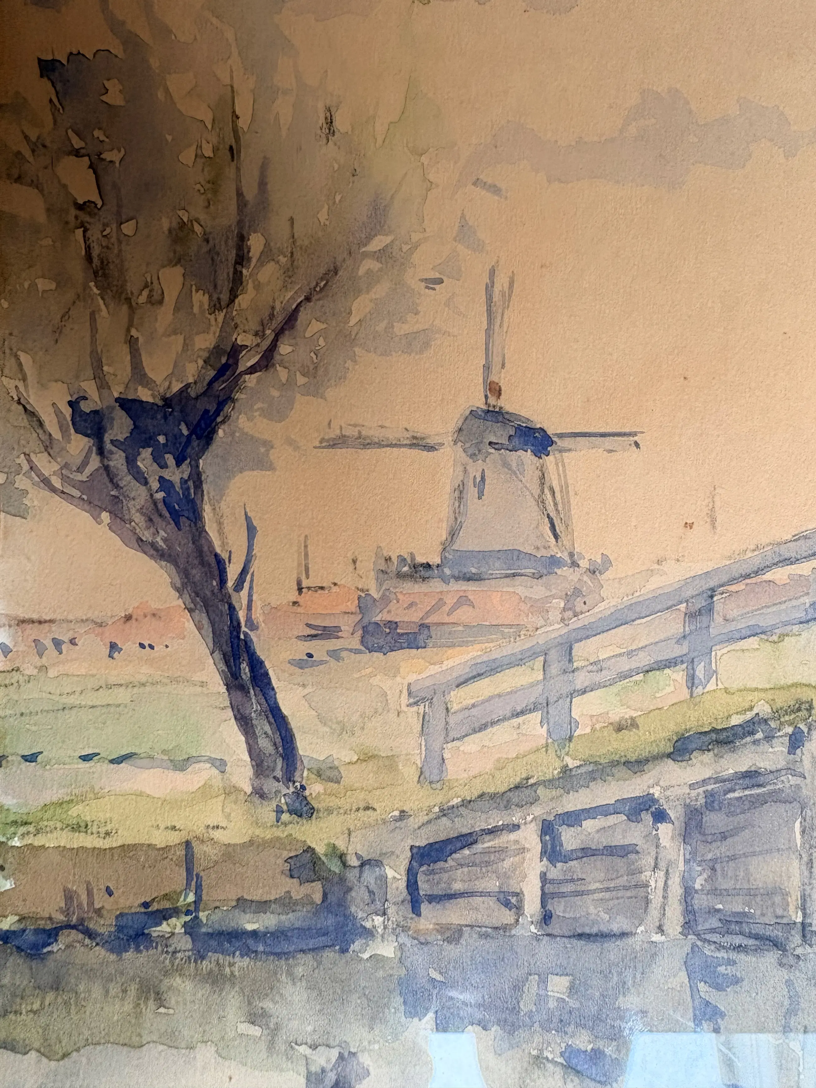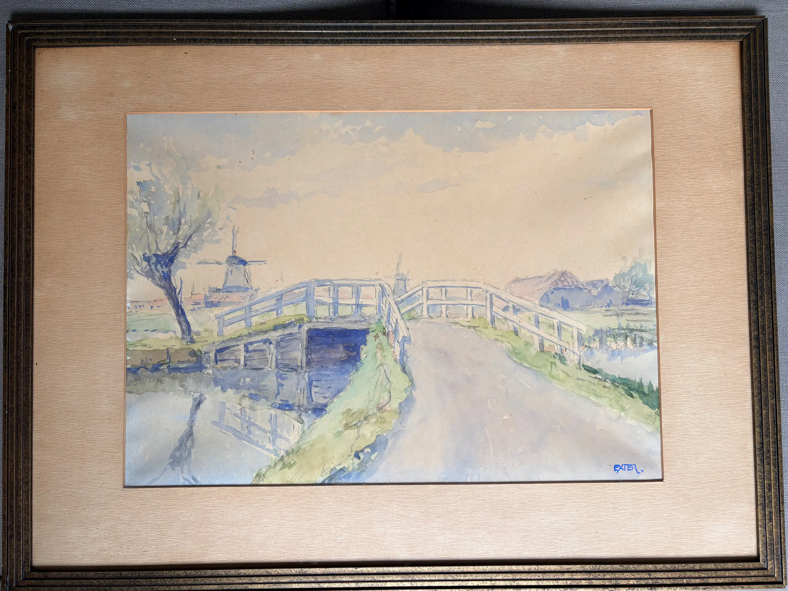 Dirk den Exter, geboren in Amsterdam 1903, overleden in Hilversum 1953. Aquarel 34 x 48 cm . De lijst is vermoedelijk gemaakt door de kunstenaar. Exter was naast schilder ook timmerman. In 1940 verhuisde hij vanuit Amsterdam naar Laren. Hij exposeerde regelmatig in Hotel Hamdorff en bij De Onafhankelijken. De subtiele aquarel toont een witte brug over water, met knotwilgen en molens en een boerderij op de achtergrond.