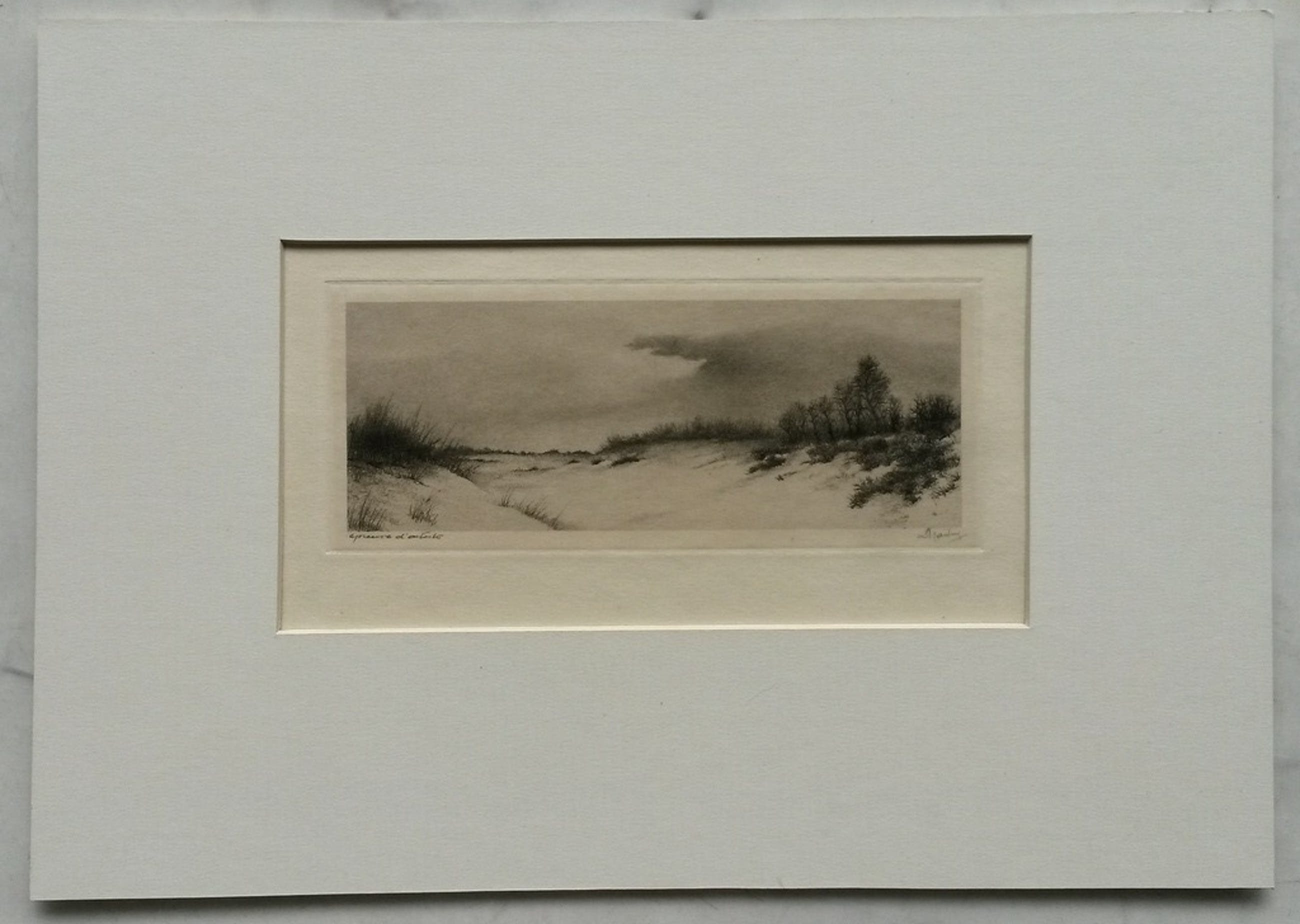 Zeer verfijnd uitgewerkte ets van Dick Harting. Afgebeeld is een duinlandschap. Het werk vermeldt geen titel en jaartal. Linksonder staat met potlood epreuve d'artiste, rechtsonder de signatuur. De afbeelding meet 5,7 x 15,4 cm. De ets is afgedrukt op een blad van 16 x 27 cm en achter passepartout van 21,5 x 30,5 cm. Het geheel is in zeer goede conditie.