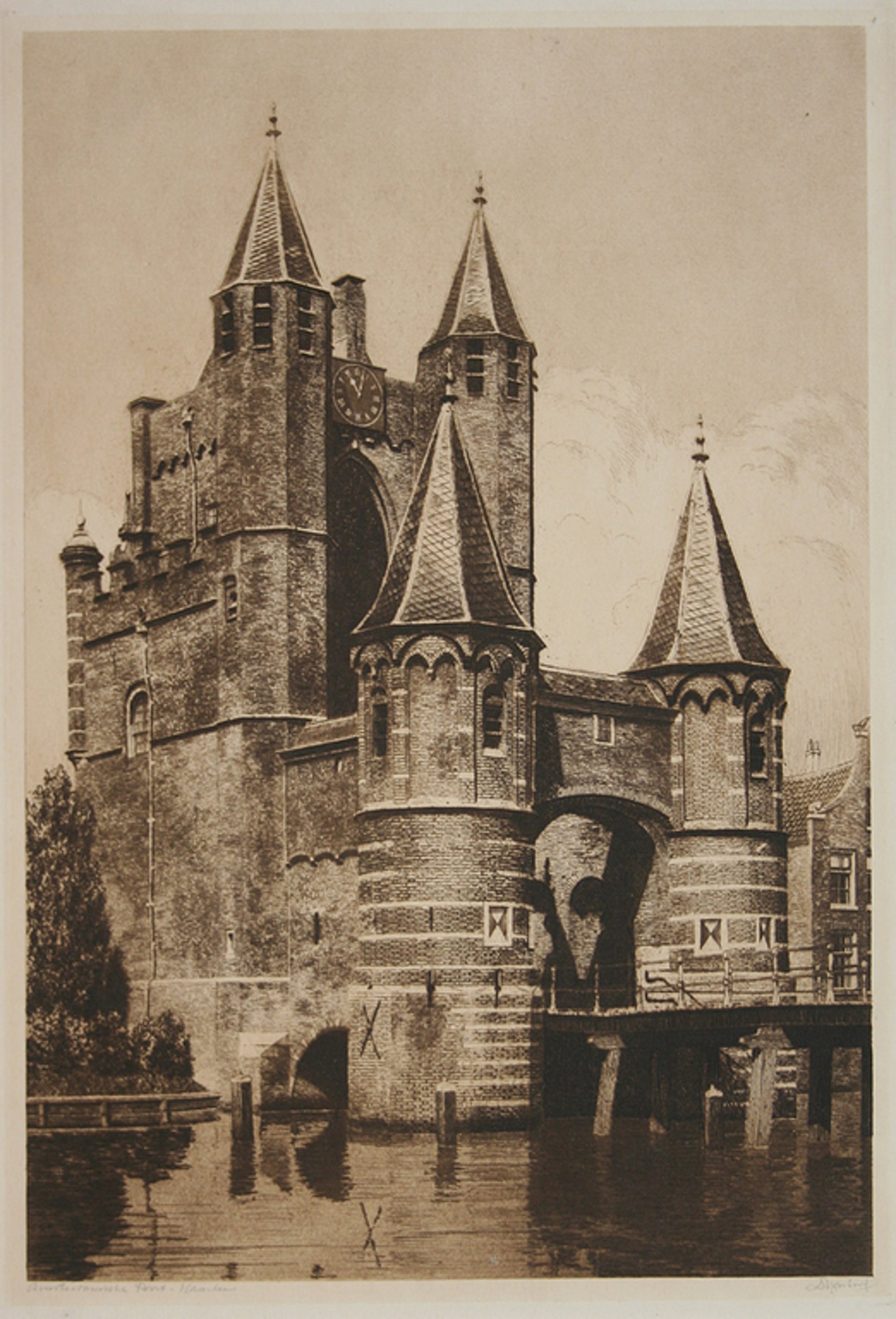 Ets, gesigneerd, in passe partout, 33,8 x 22,2 cm. (HxB) . "Amsterdamse poort, Haarlem".