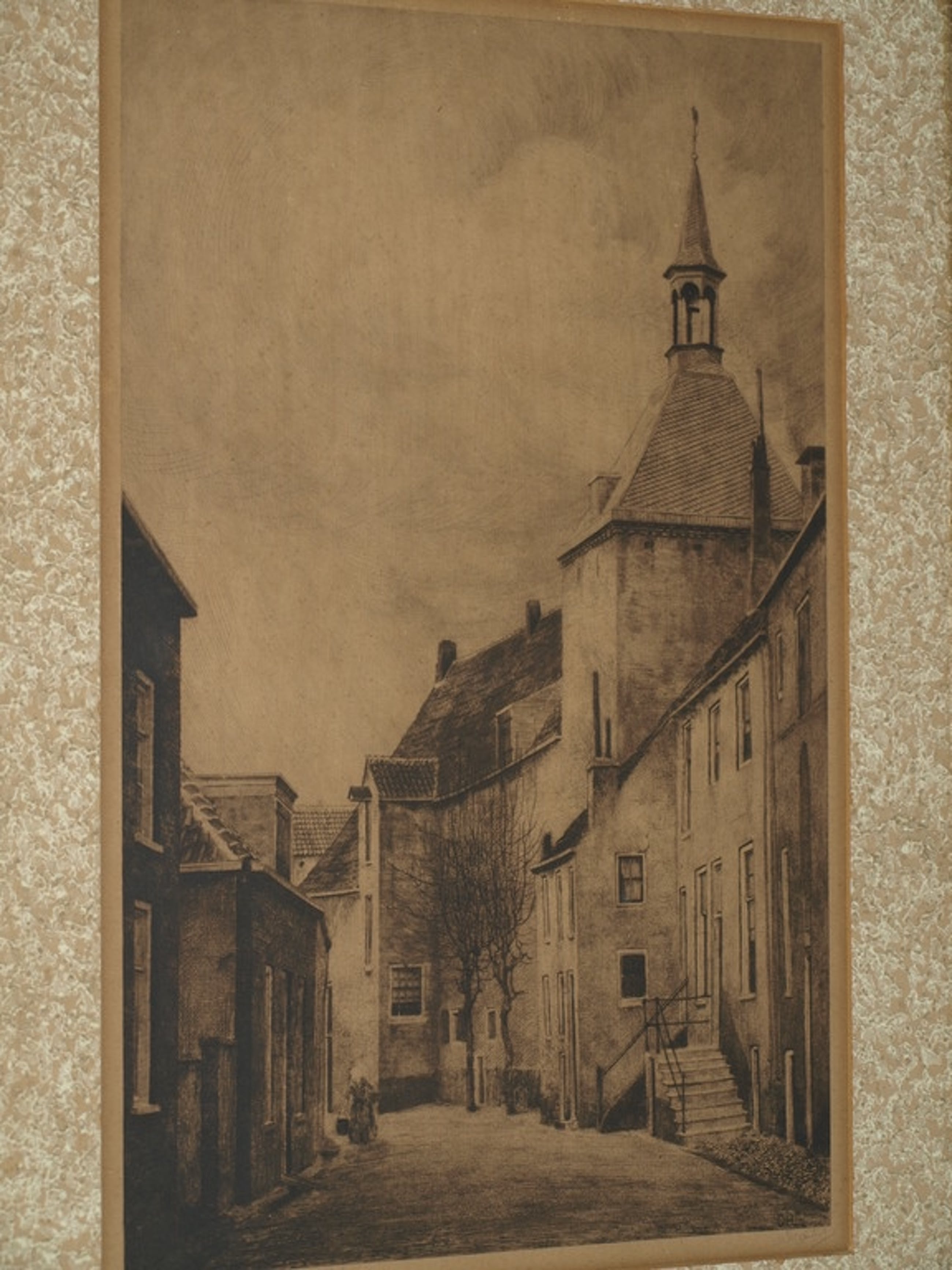 Een mooie oude ets van Dirk Harting met een voorstelling van een straatje in Amersfoort.