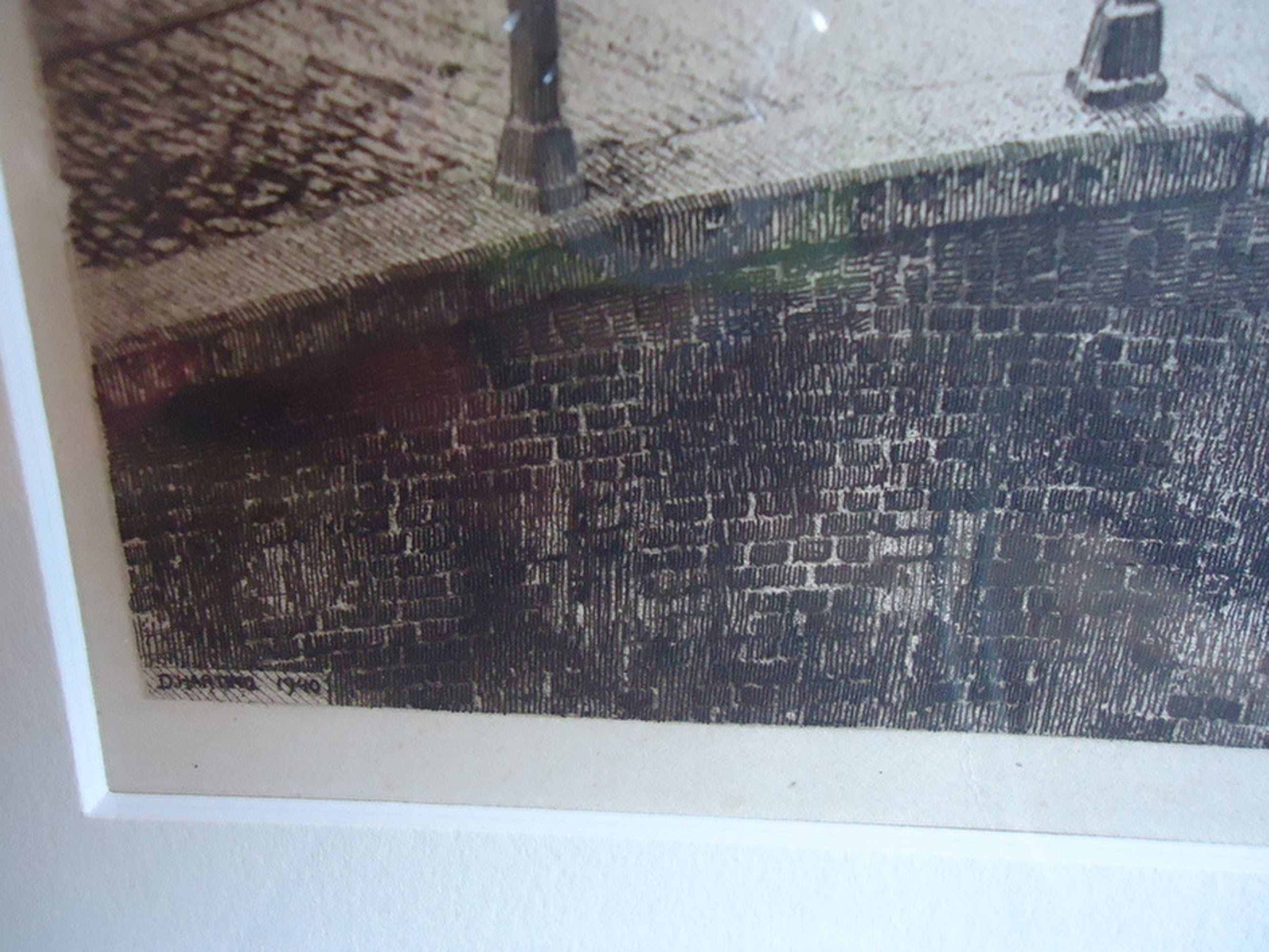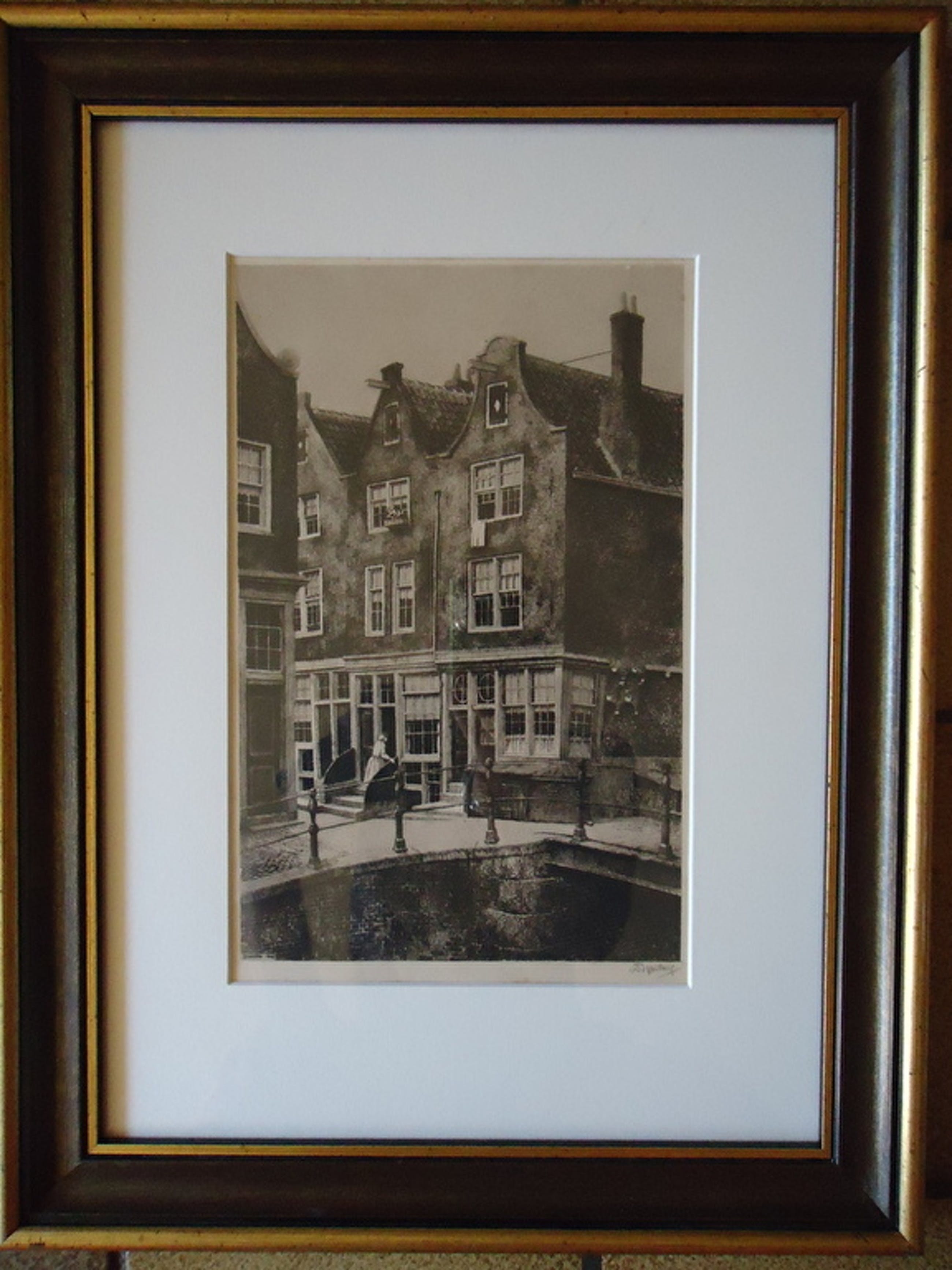 Ets : 29 x 18,5 cm. Met zuurvrije passe-partout en lijst : 50 x 38 cm.