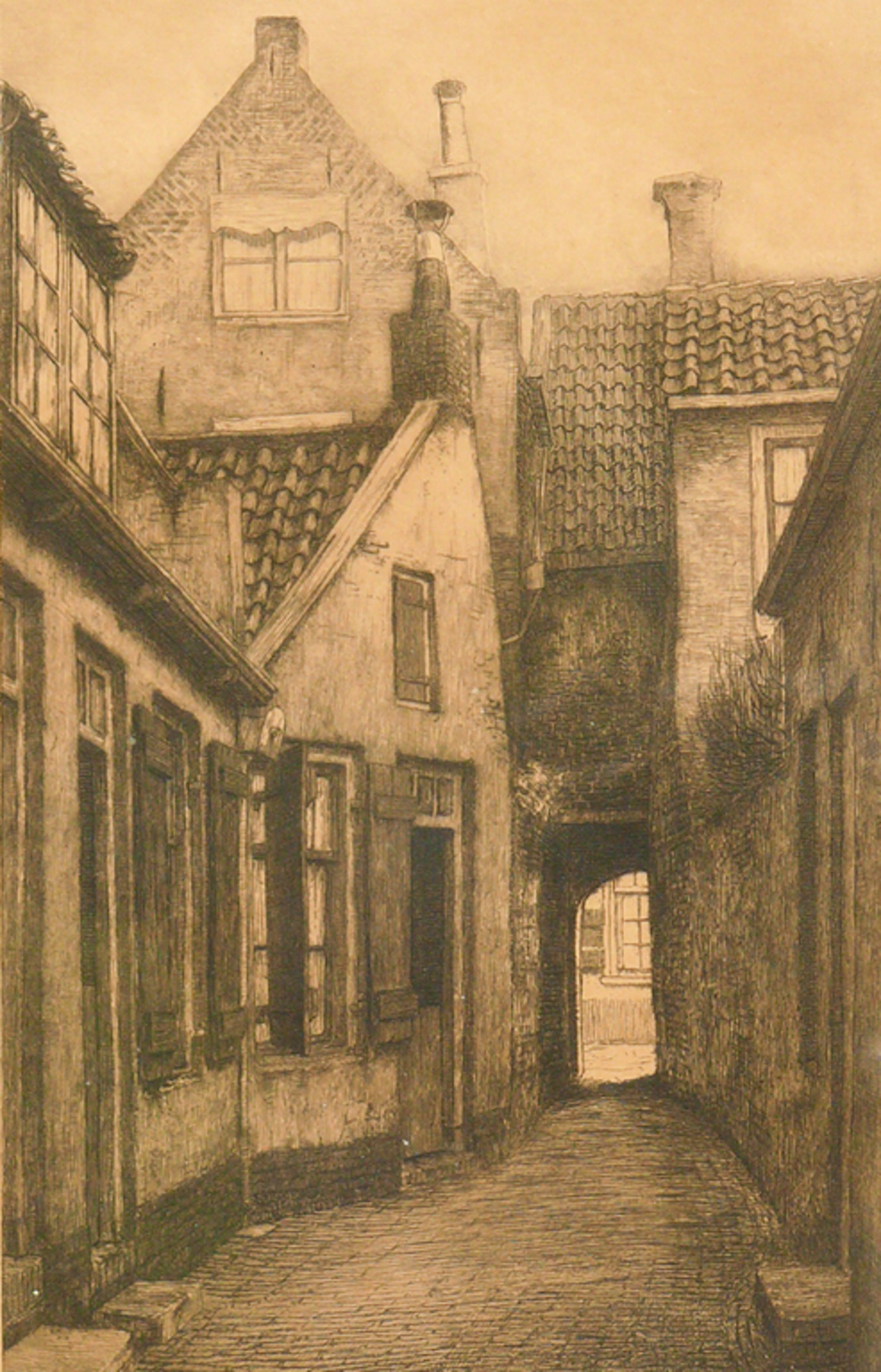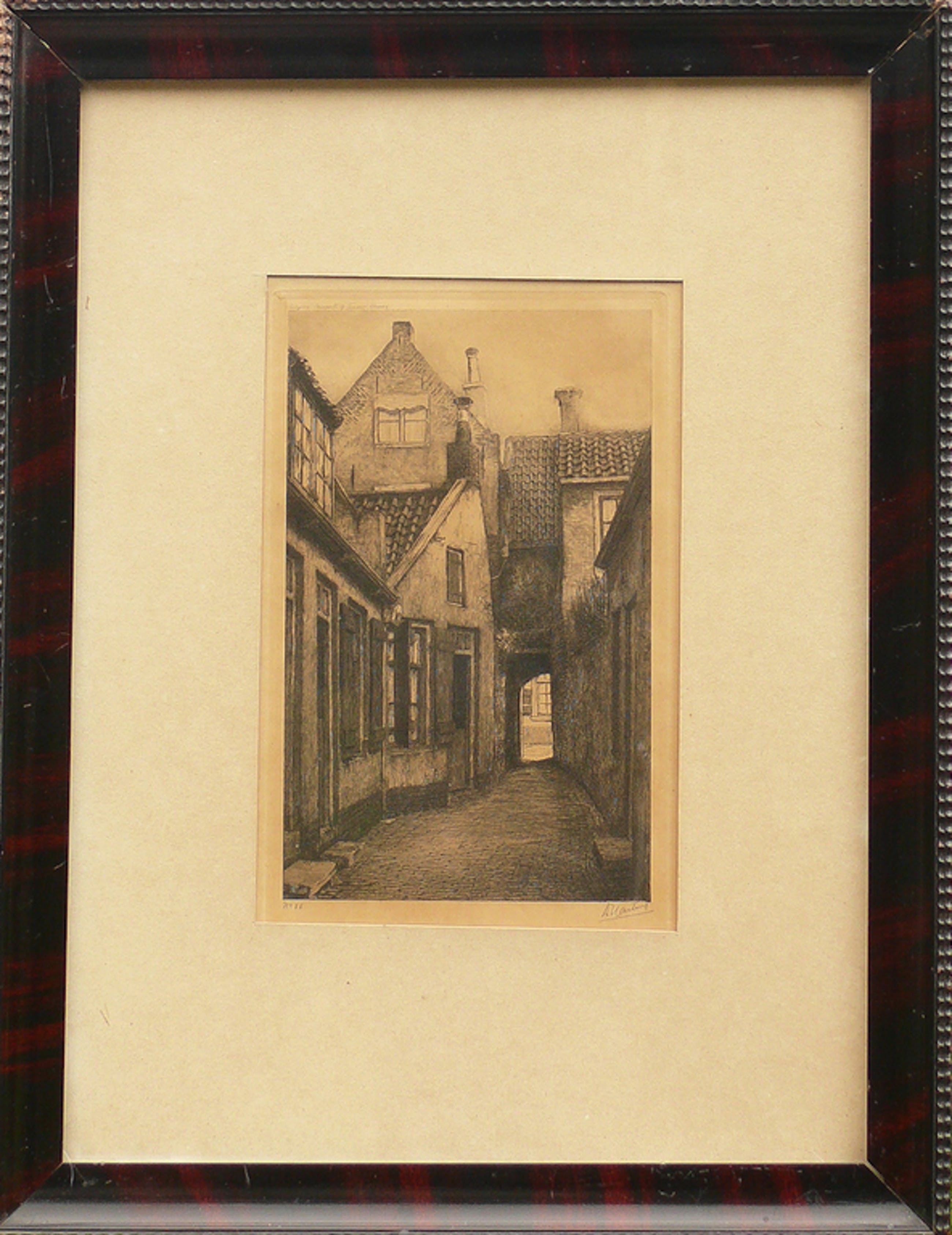 Zeer fraaie ets van 1 van de leukste straatjes van Haarlem.