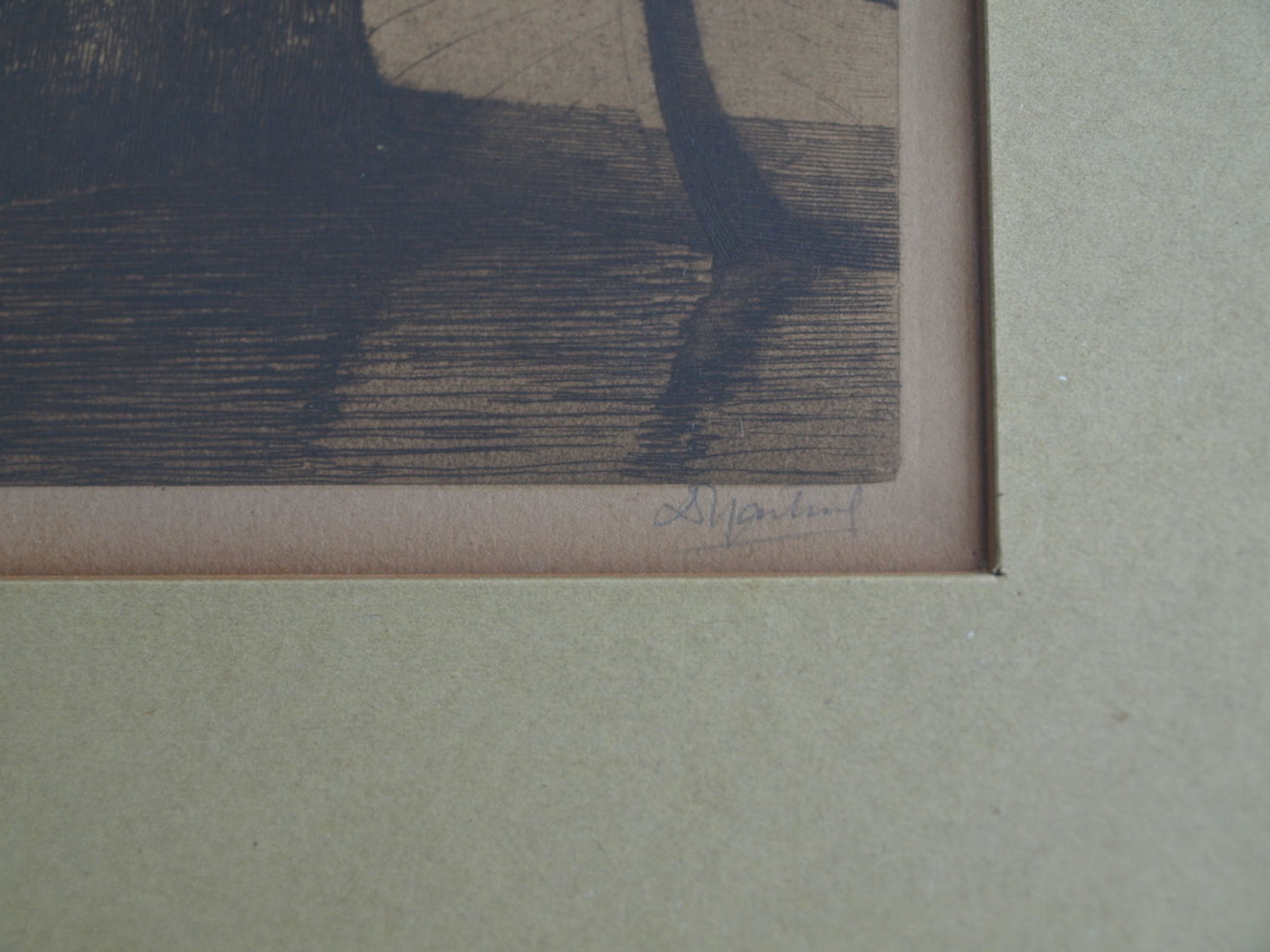 Gesigneerd met potlood en ingelijst in de originele houten lijst met passe-partout en glasplaat.