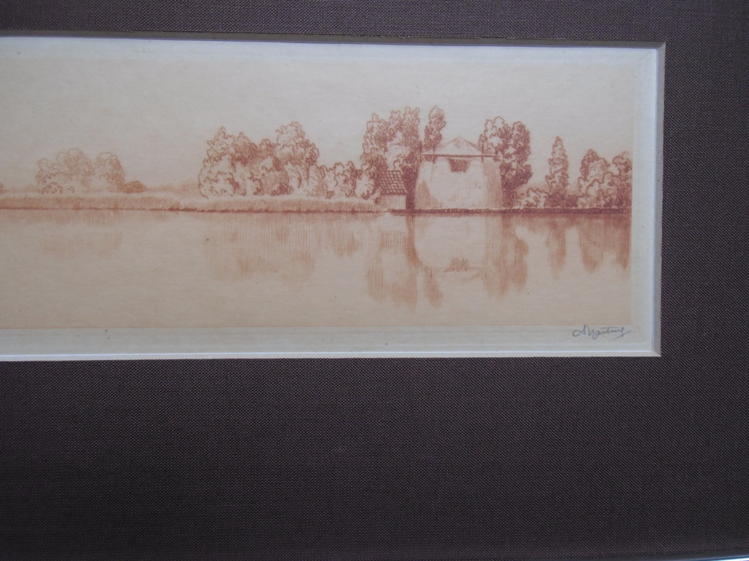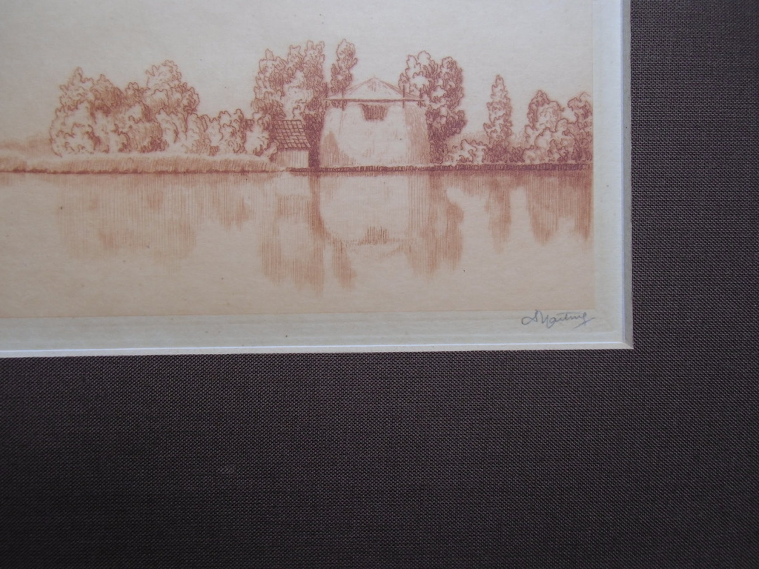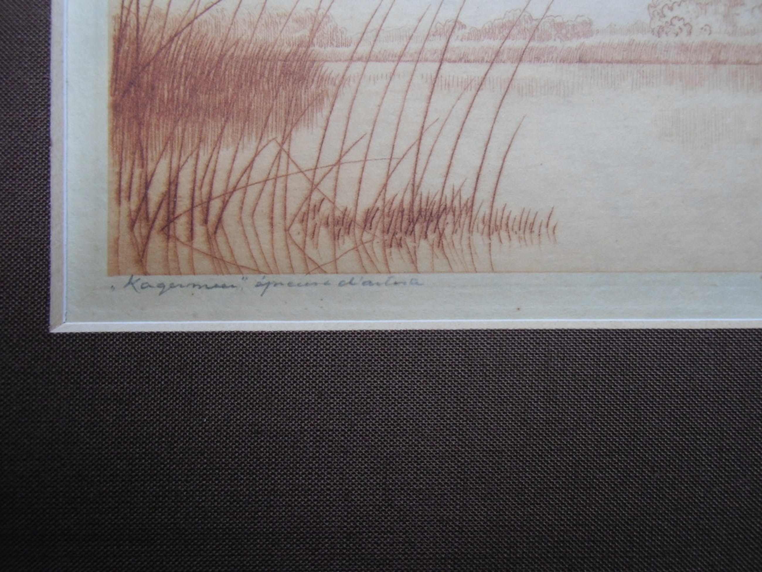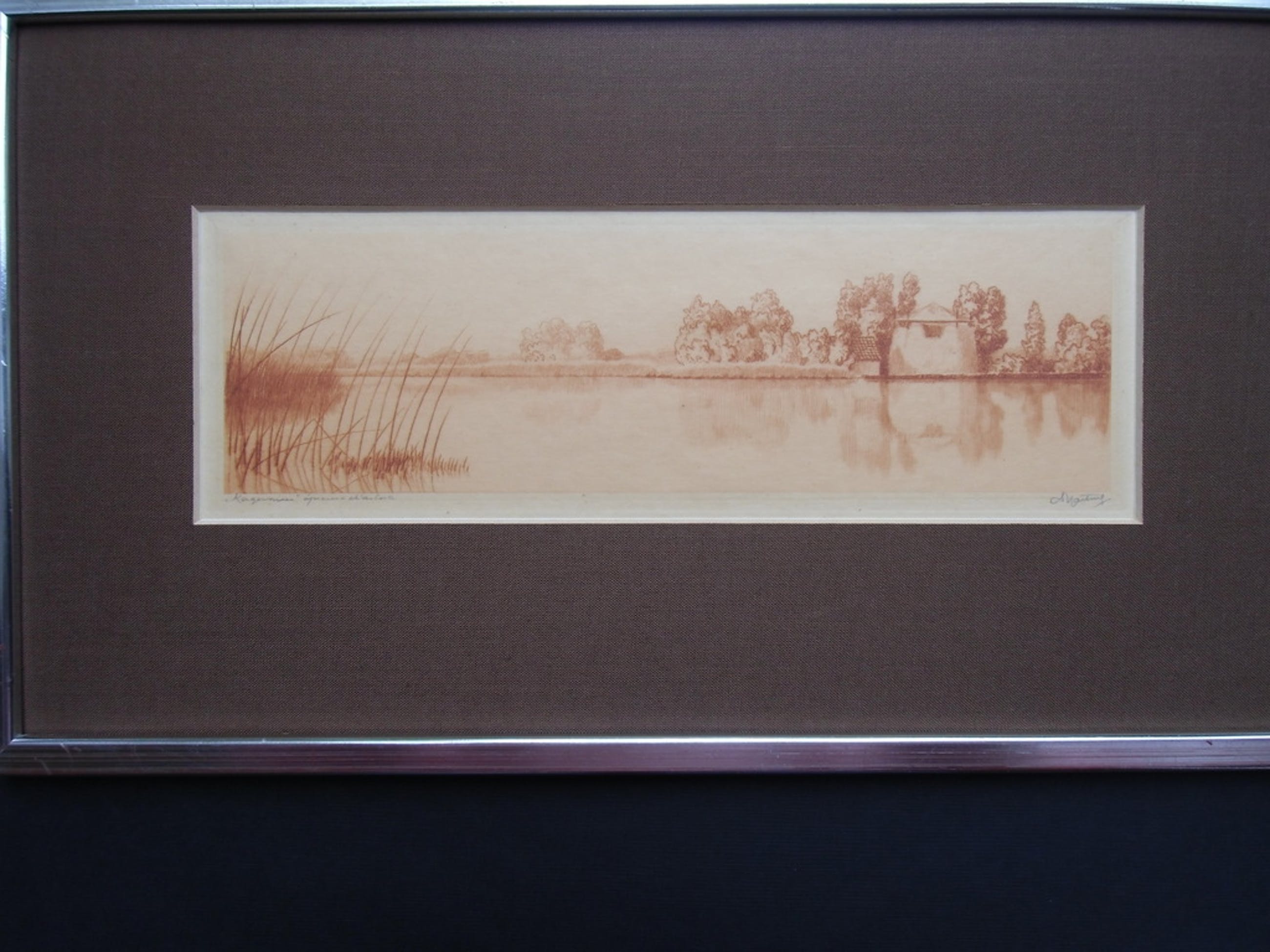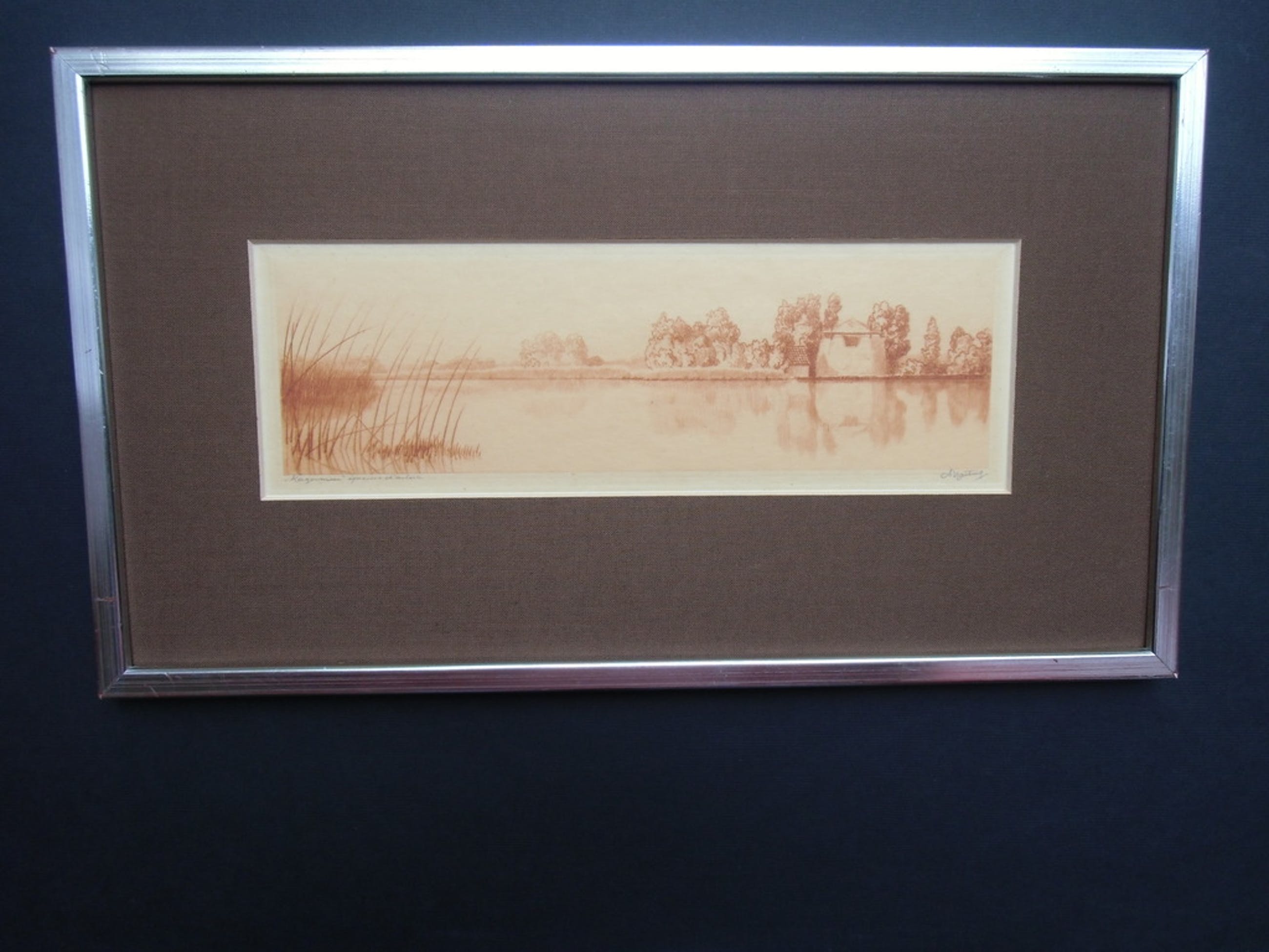 Deze ets van Dirk Harting is afgedrukt in rood-bruine tinten. Beeldmaat 7.2 x 23.9 cm. Gesigneerd, betiteld en épreuve d'artiste in potlood. Ingelijst door Boselie, Den Bosch. Zeer goede staat.